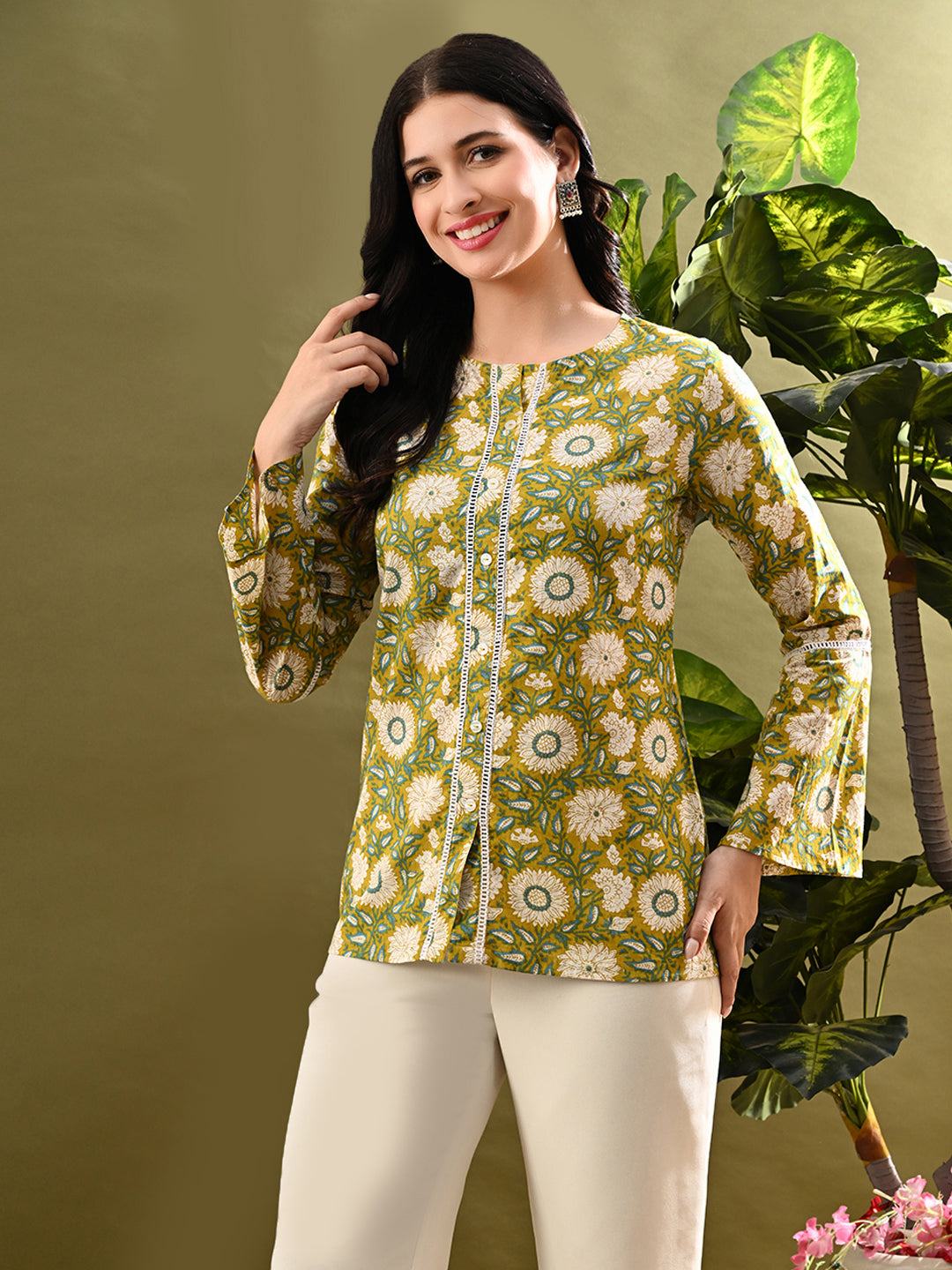 Green Flower Printed Tunic With Lace