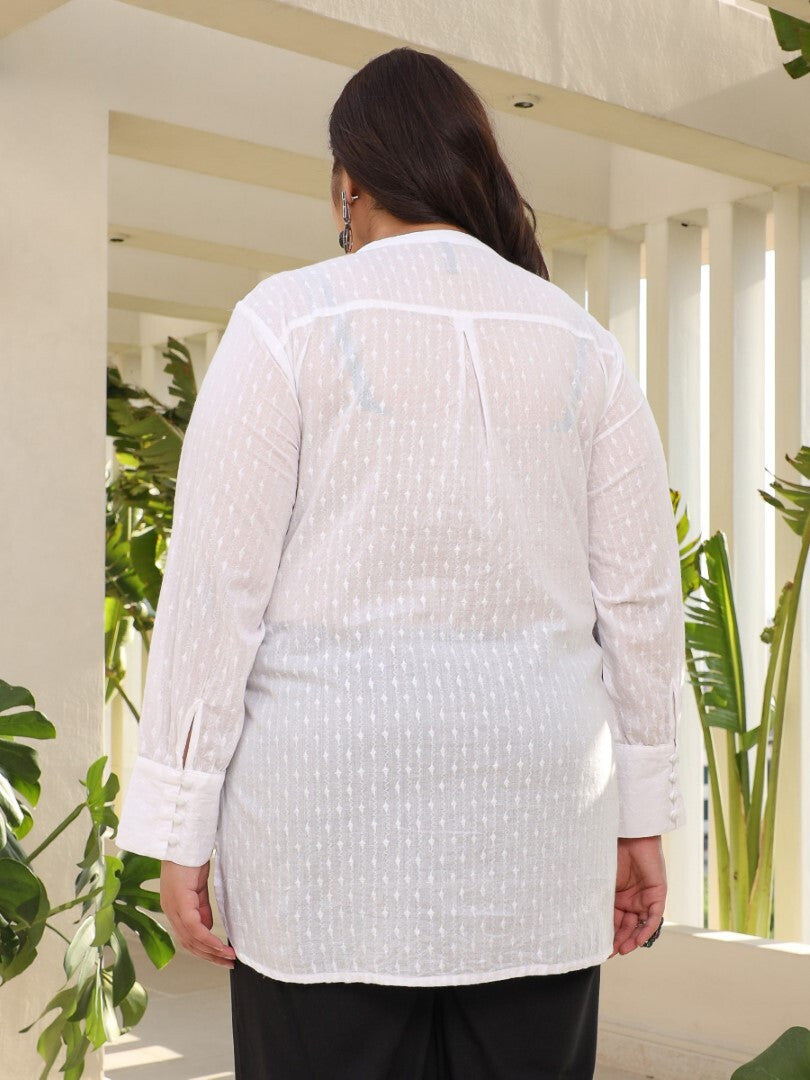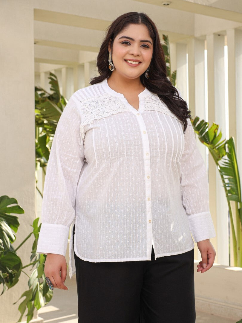 Experience Elevated Style With Our White Cotton Tunic. Meticulously Crafted From Dobby Cotton. Embraced With Lace, Precise Pin Tucks, Long And Broad Cuffs For A Refined Touch. The High-Low Hemline And Side Slits Offer Modern Sophistication, While Effortless Slip-On Convenience Ensures Versatility For Any Occasion.