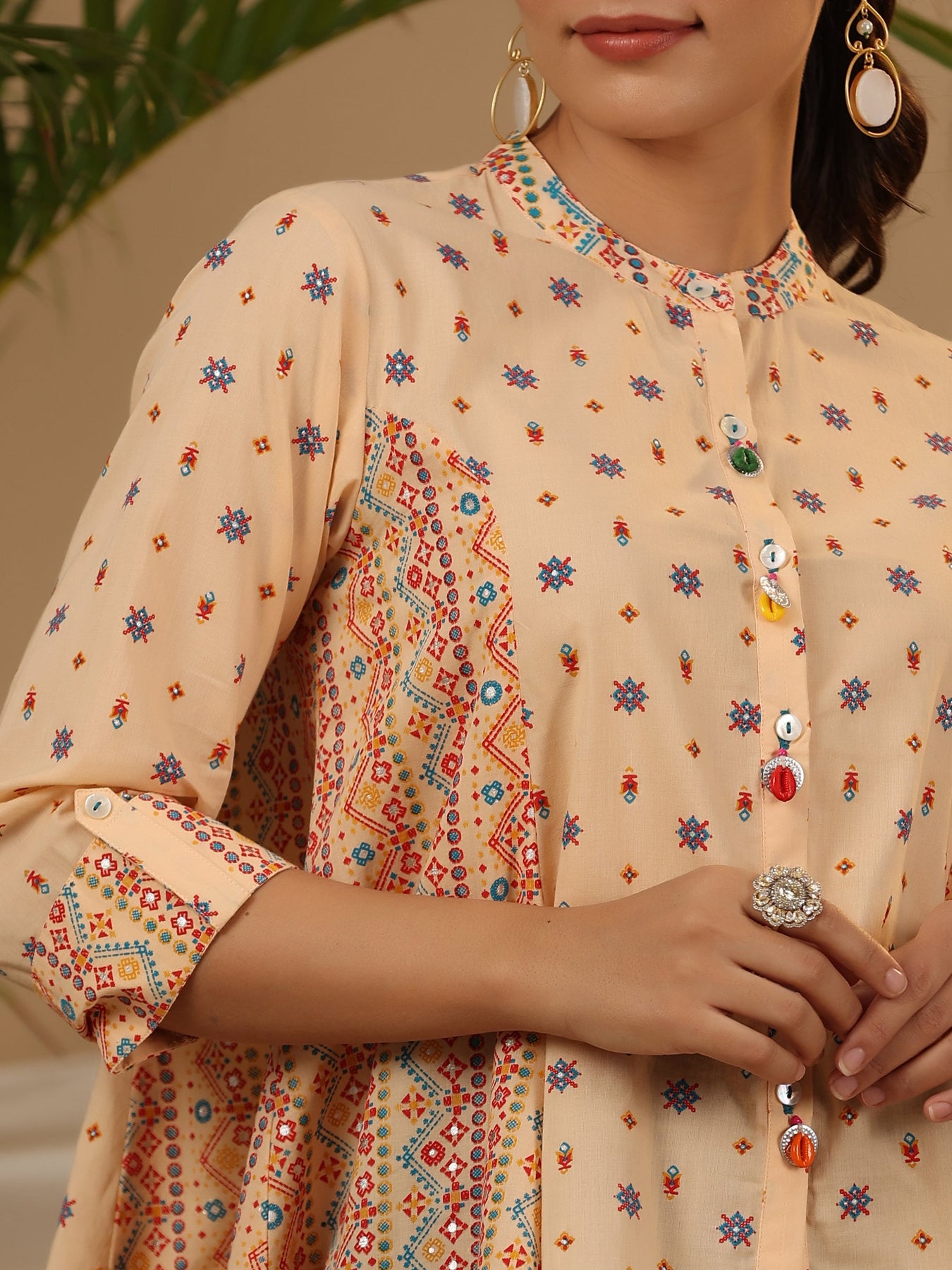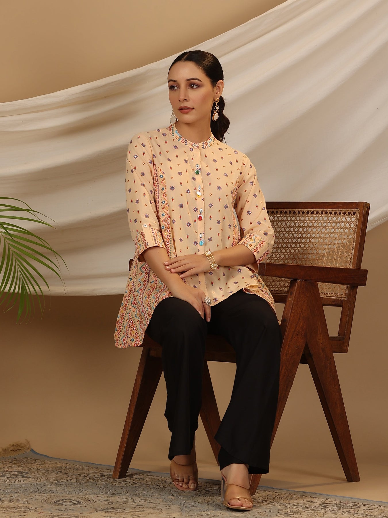 The Banjara Peach Pure Cotton Shirt Featuring Intricate Prints And A Flattering Flared Silhouette. Panelled With Curved Hemline, Above-Knee Length, And Adorned With A Mandarin Collar, Button, And Delicate Beadwork.
