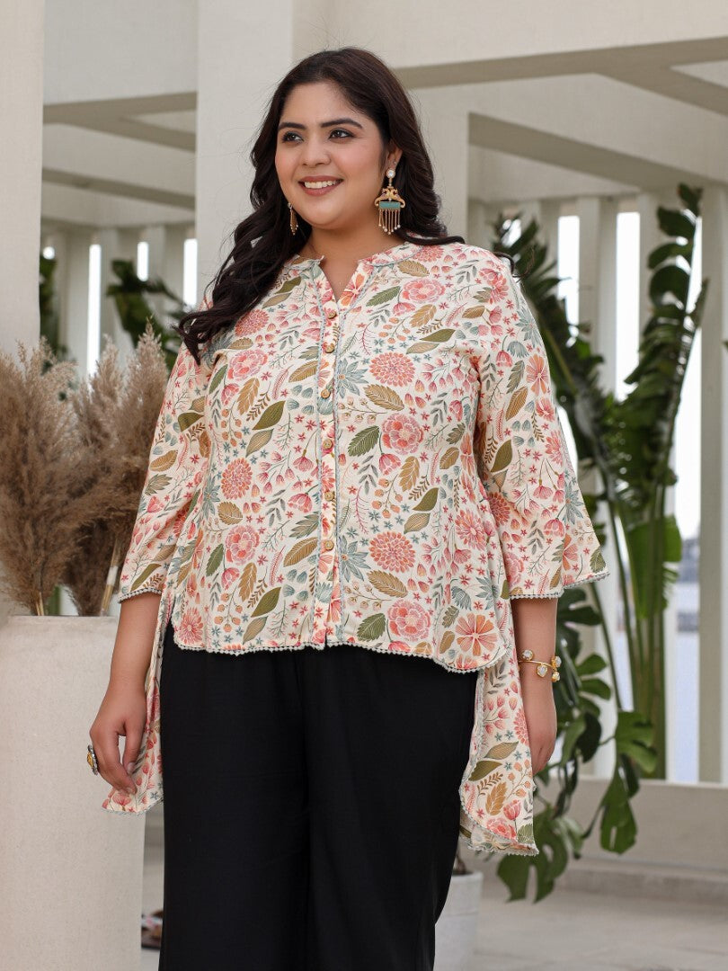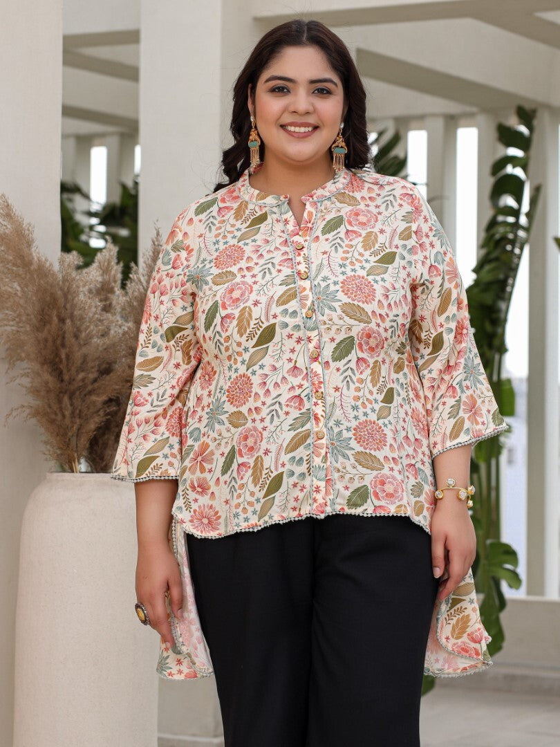 The Crafted Geometrics Ivory Rayon Printed Floral Printed High-Low Plus Size Tunic, This Elegant Size Features Collar, Short Roll-Up Sleeves Embraced With Lacy Details, And Convenient Pocket For Your Essentials.