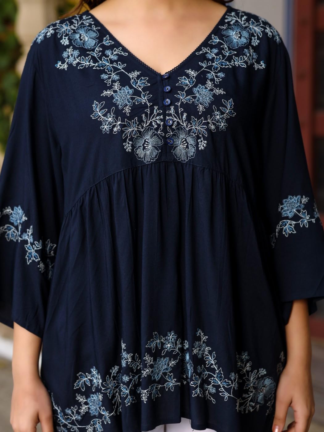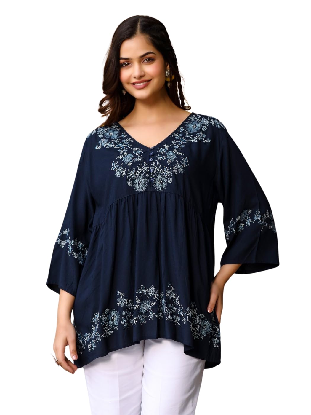 Navy Blue Modal Rayon Alia-Cut Embroidered Tunic. Features A V Neckline And Three-Quarter Regular Sleeves. Ideal For Daily Wear, Adding Elegance To Women'S Wardrobes.