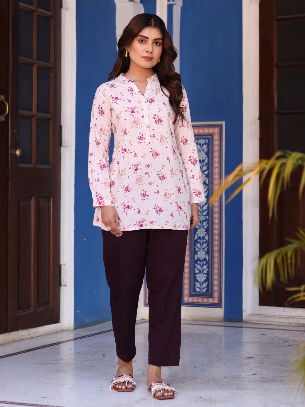 Stylish Pink Tunic With Floral Print, Long Cuff Sleeves, Mandarin Collar. Made Of Comfortable Rayon For Women'S Fashion