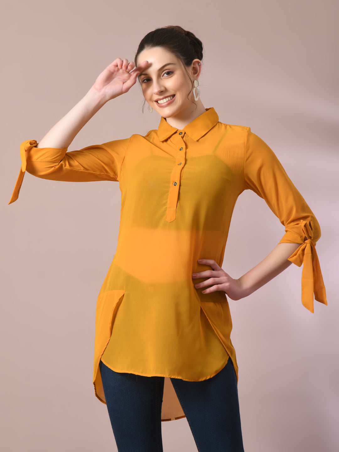 Women Yellow Solid Georgette Longline Party Sheer Tunic