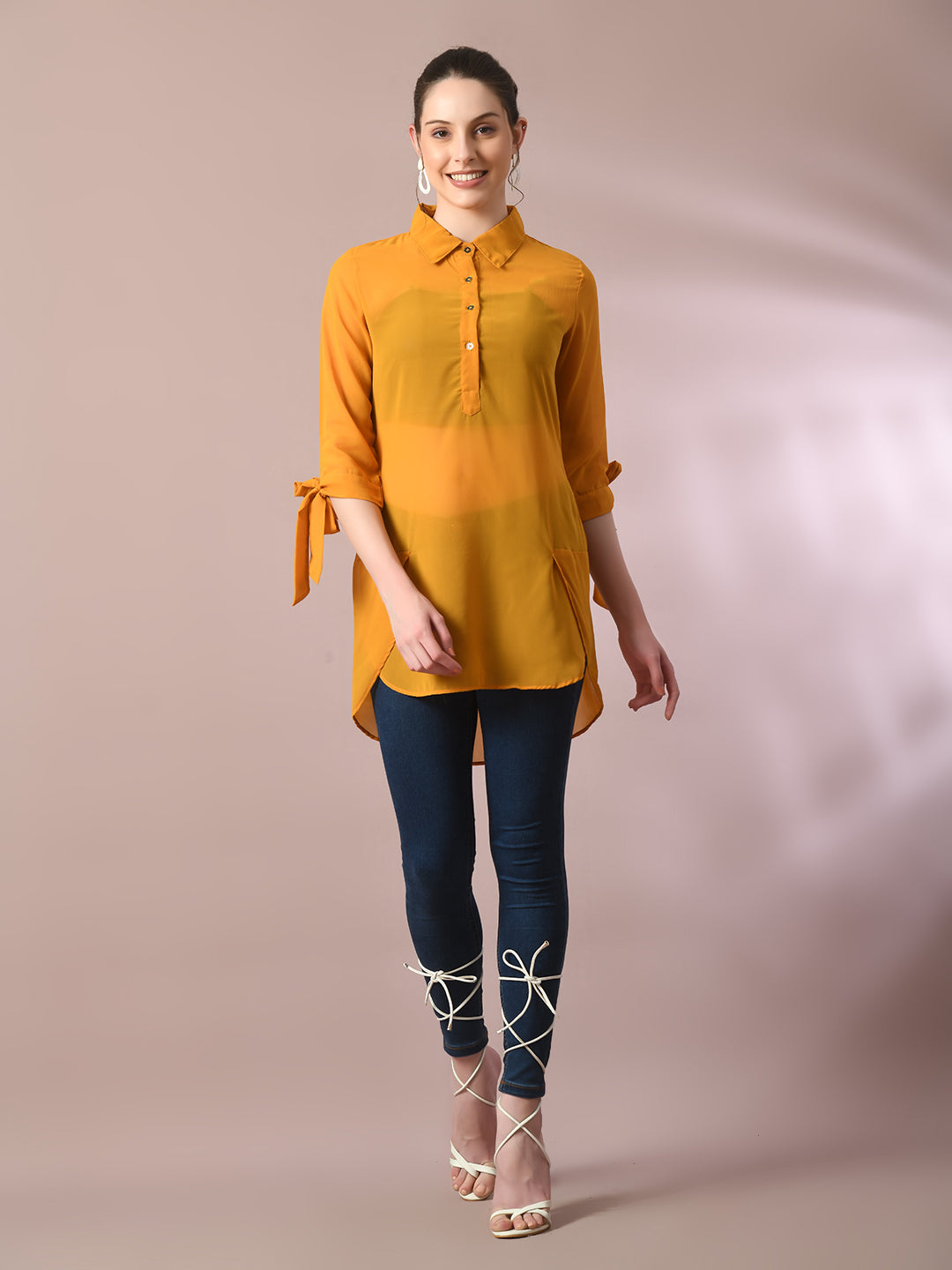 Fabric :Georgette Pattern :Solid Length :Longline Sleeves :Three-Quarter Sleeves Neck :Shirt Collar Sleeve Style :Regular Sleeves