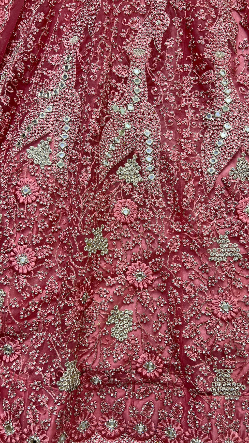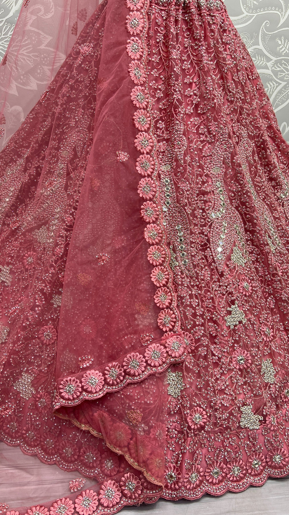 This beautiful bridal net lehenga choli is the epitome of elegance, perfect for festivals and special occasions. Get this beautiful bridal net fancy dori, multi thread, hand mirror and diamond work lehenga choli online at trendia.co - The best online store for women's lehenga choli.
