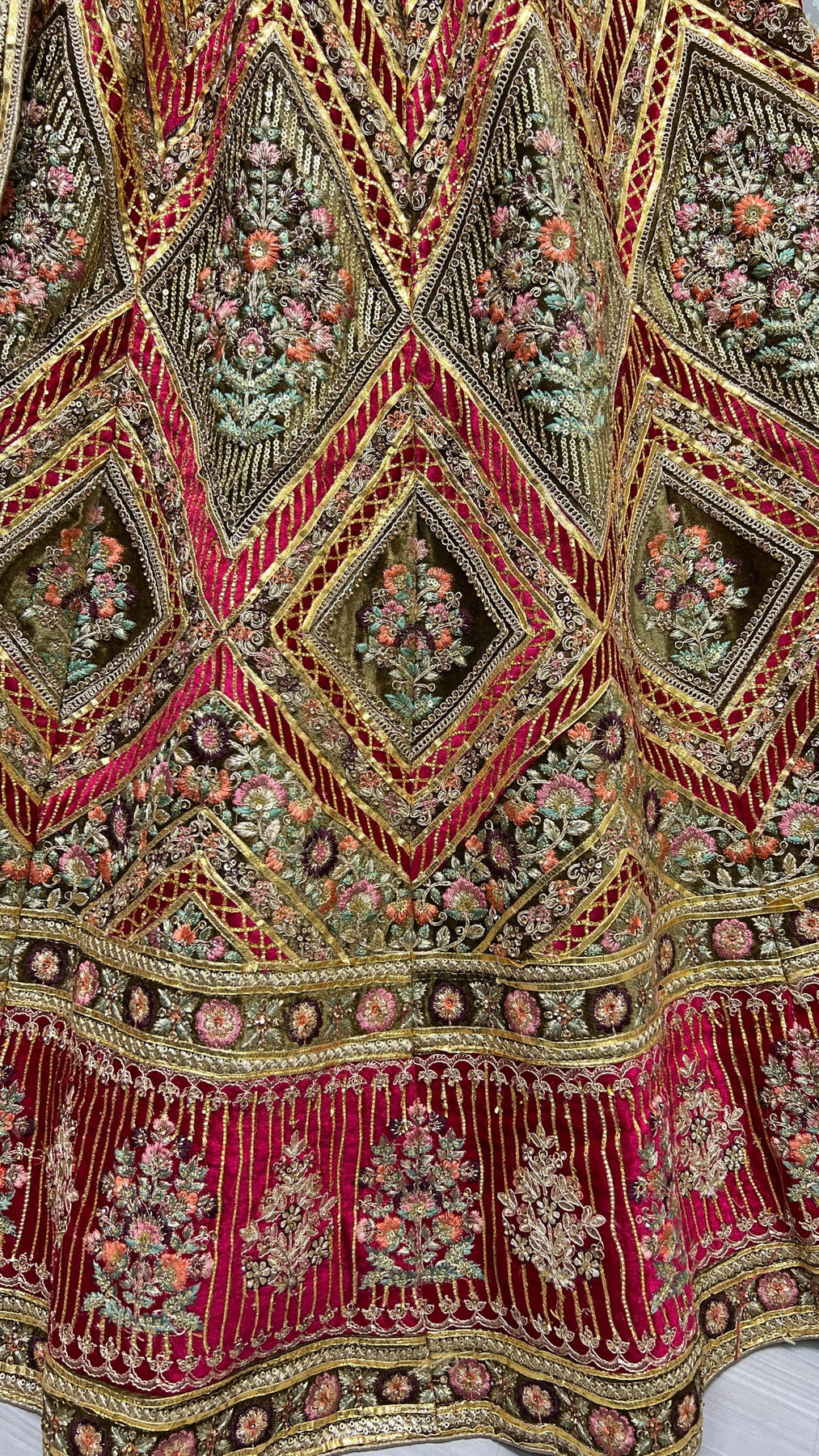 This beautiful velvet lehenga choli is the epitome of elegance, perfect for festivals and special occasions. Get this beautiful velvet golden gotta, multi thread embroidered with diamond work lehenga choli online at trendia.co - The best online store for women's lehenga choli.