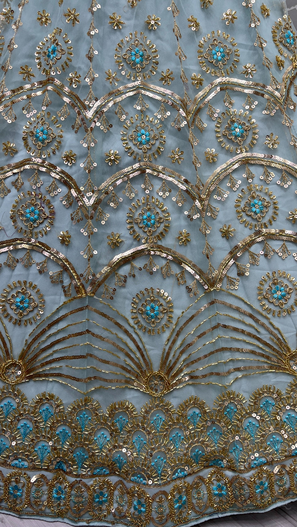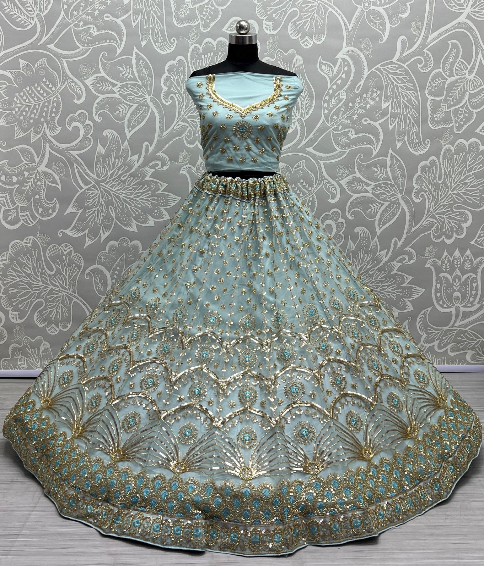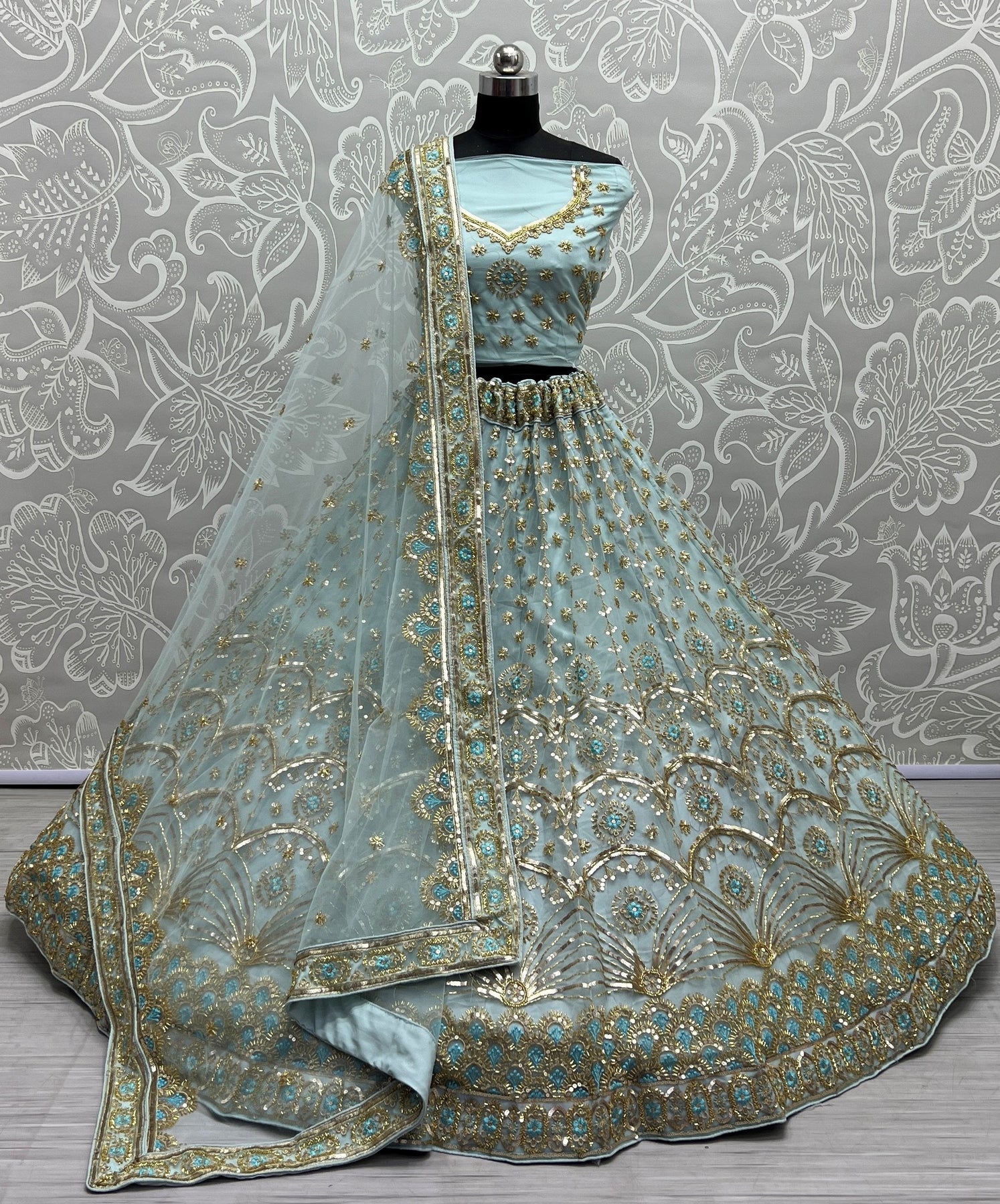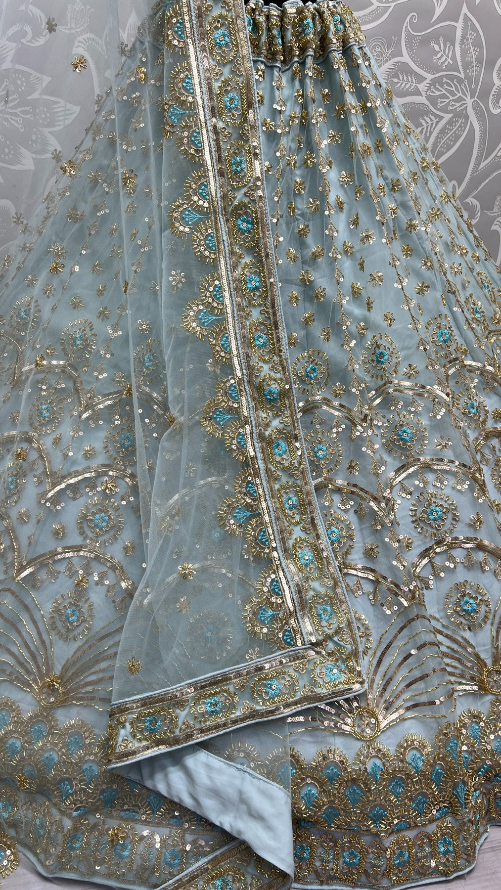 Women's Sky Blue Bridal Net Fancy Sequins With Multi Thread Embroidered & Handwork Wedding Lehenga Choli