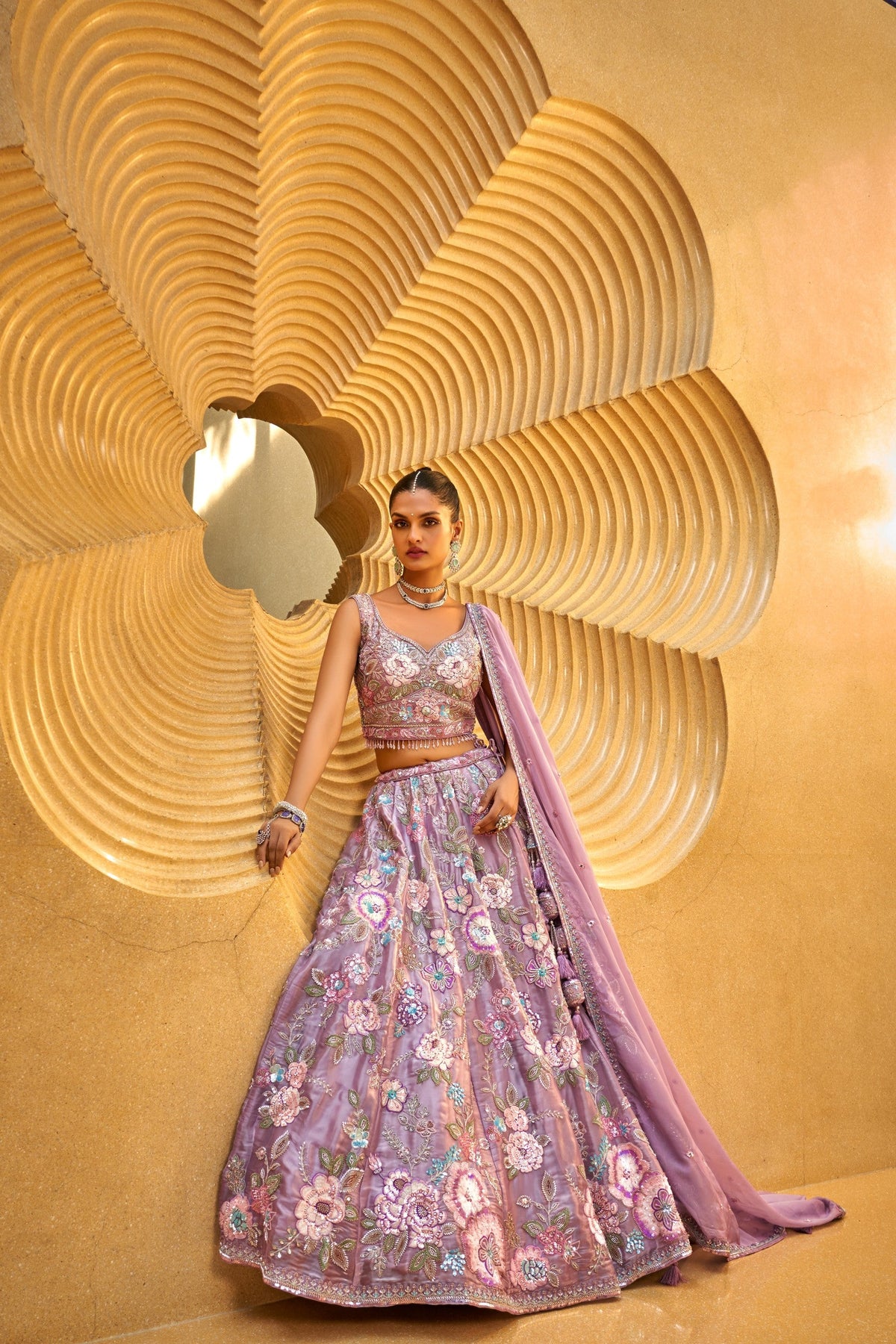 Women's Lavender Organza Cut-Dana & Handwork Semi - Stitched Lehenga