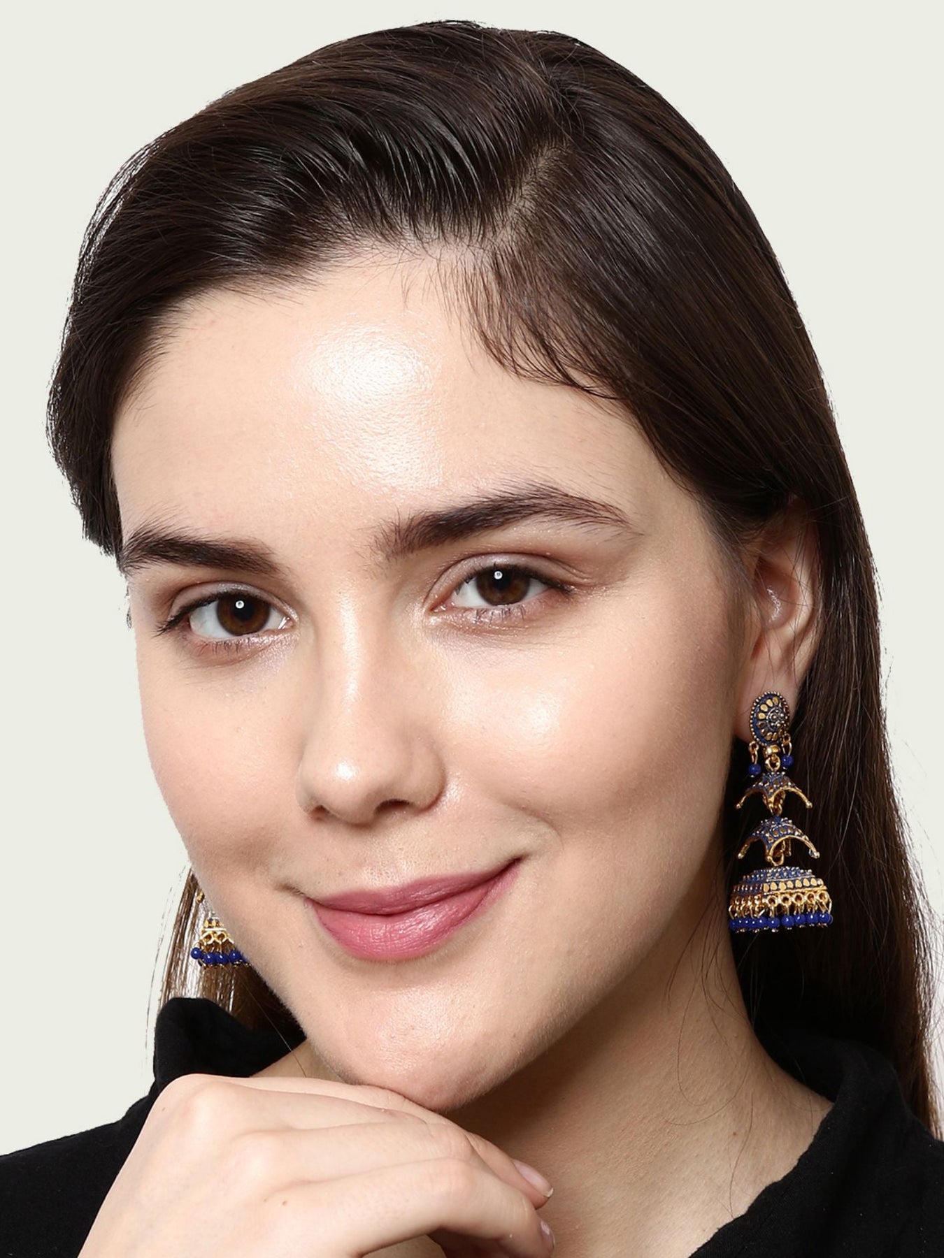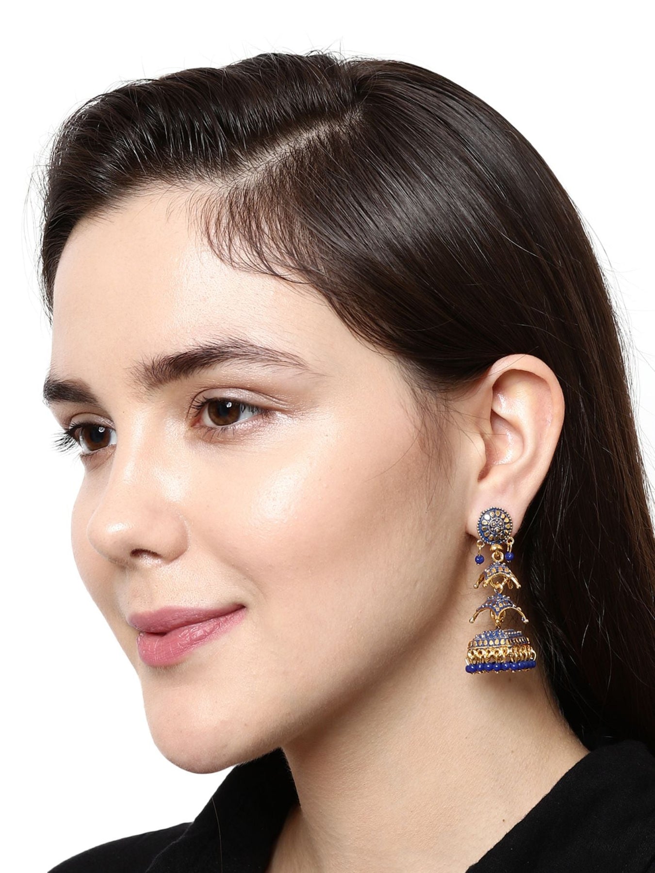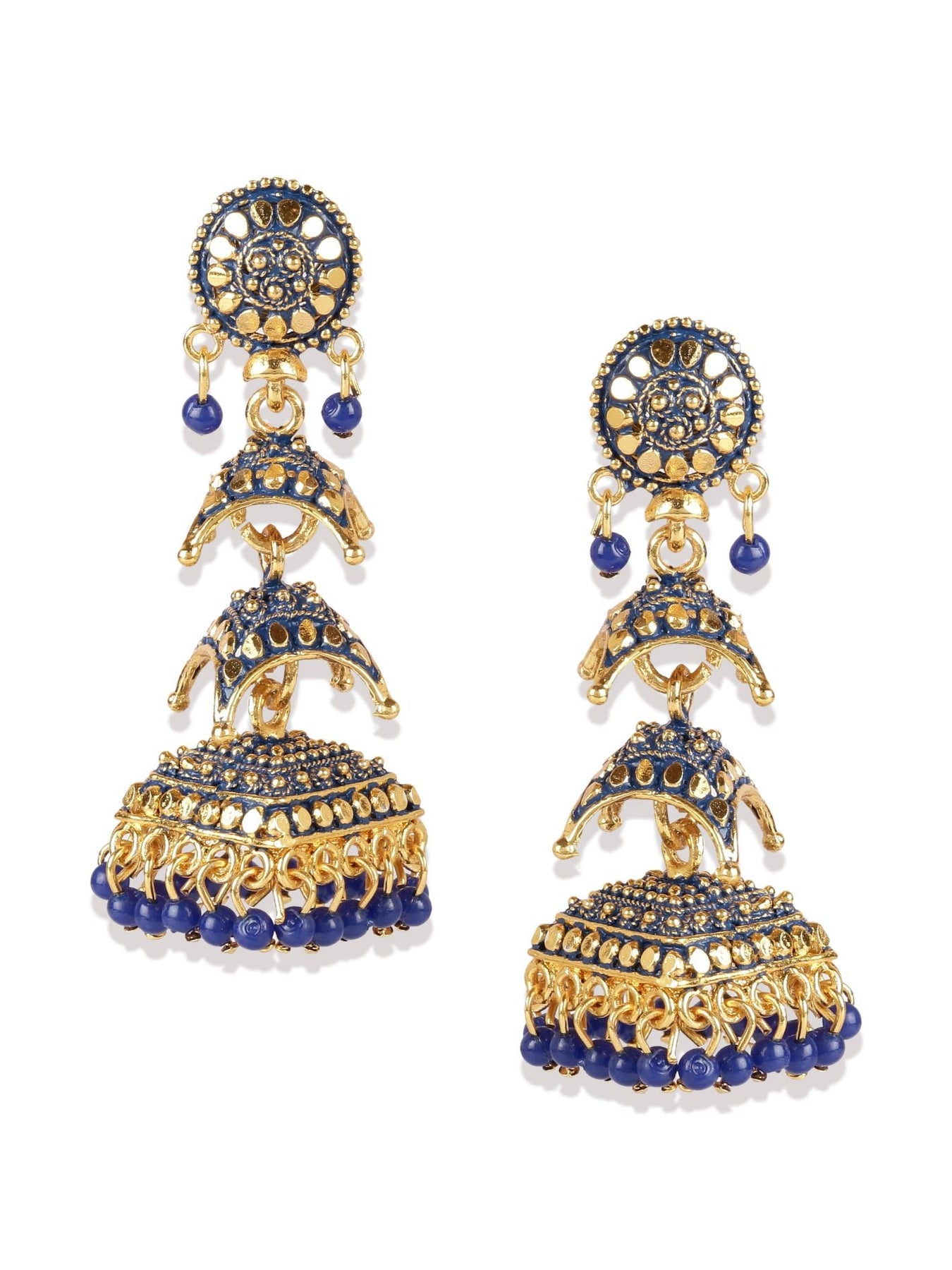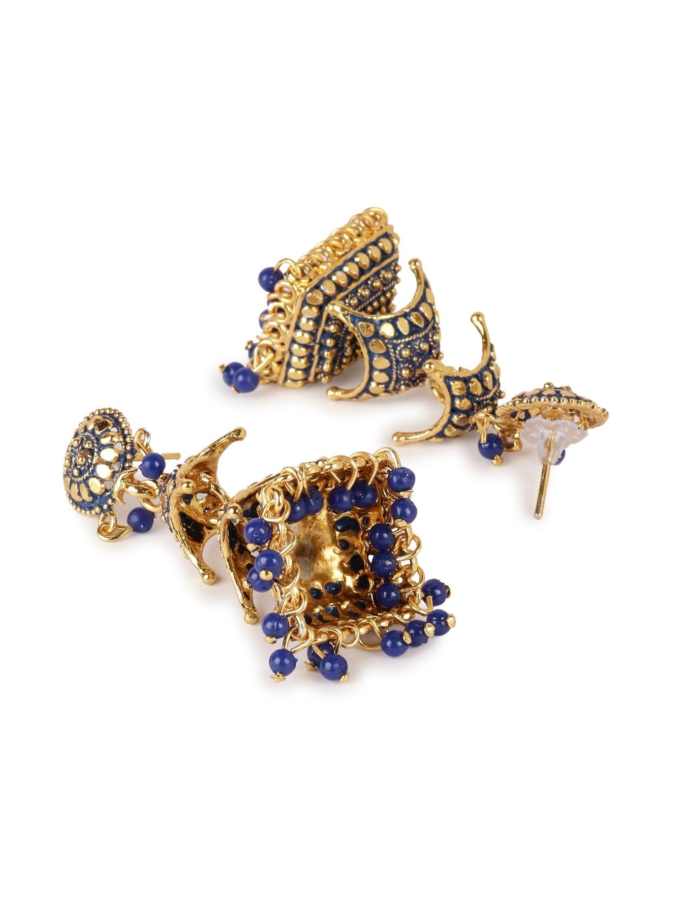 Blue & Gold-Toned Dome Shaped Jhumkas Secured With Post And Back Closure, Details: Enamelled
