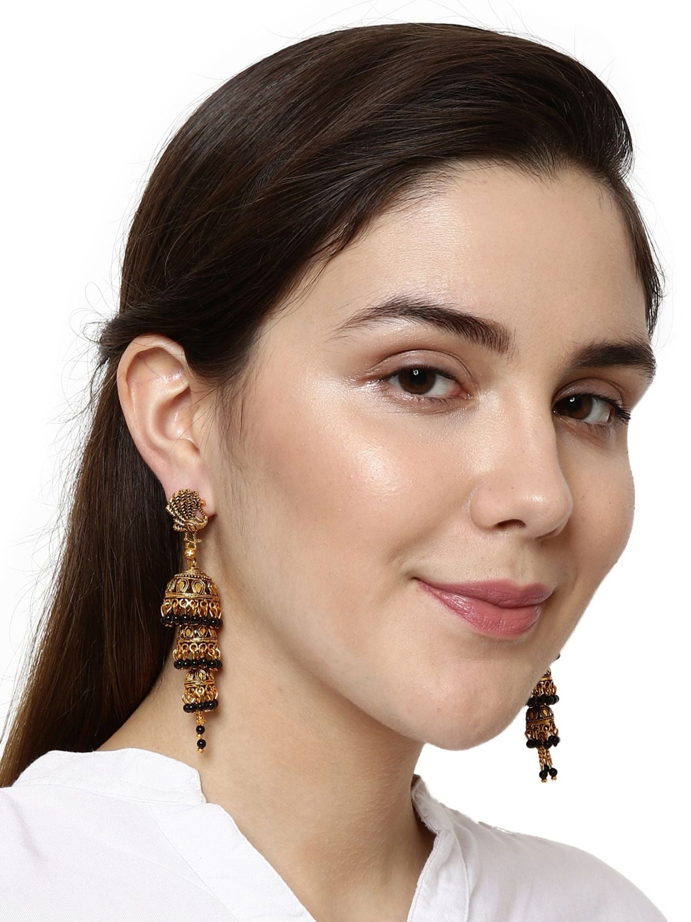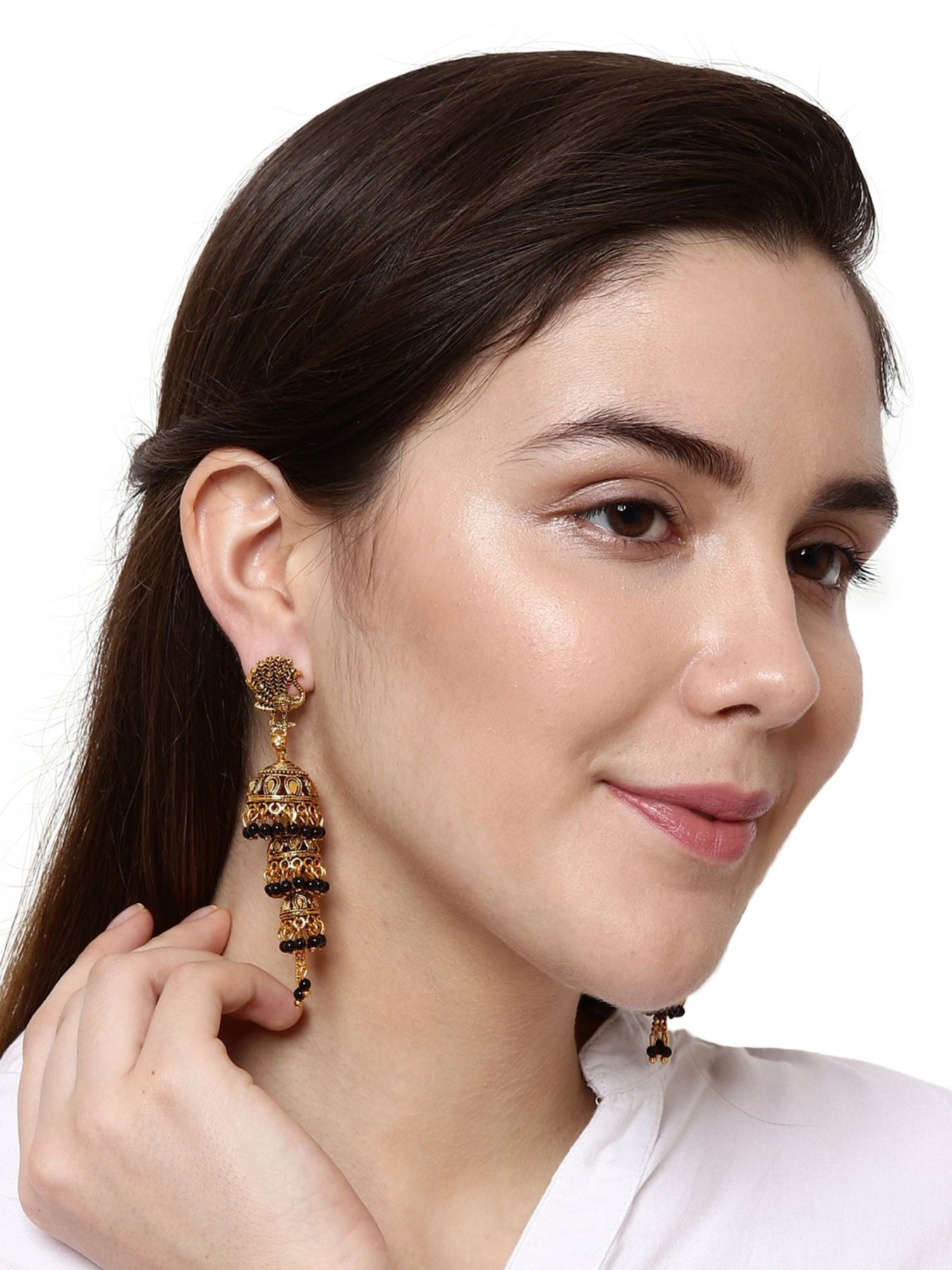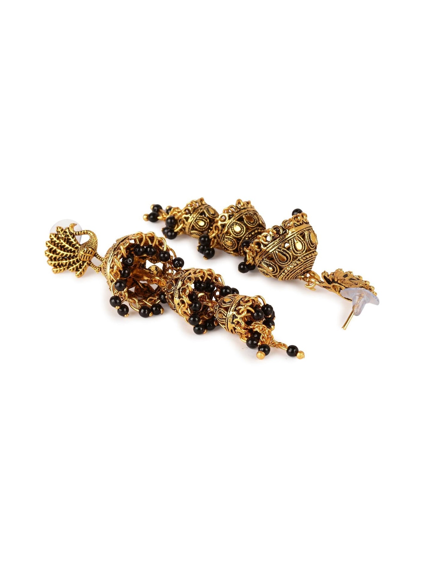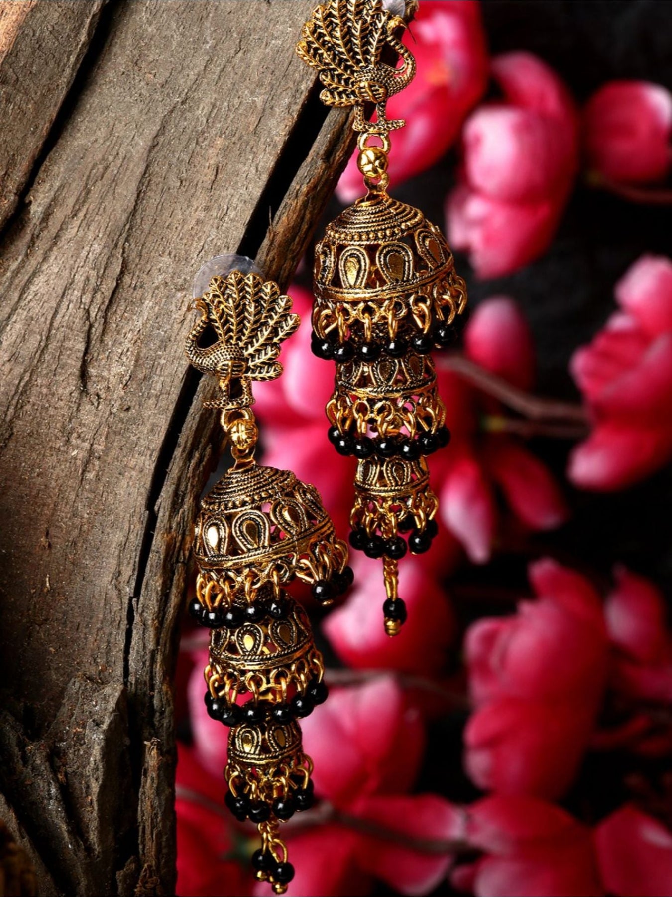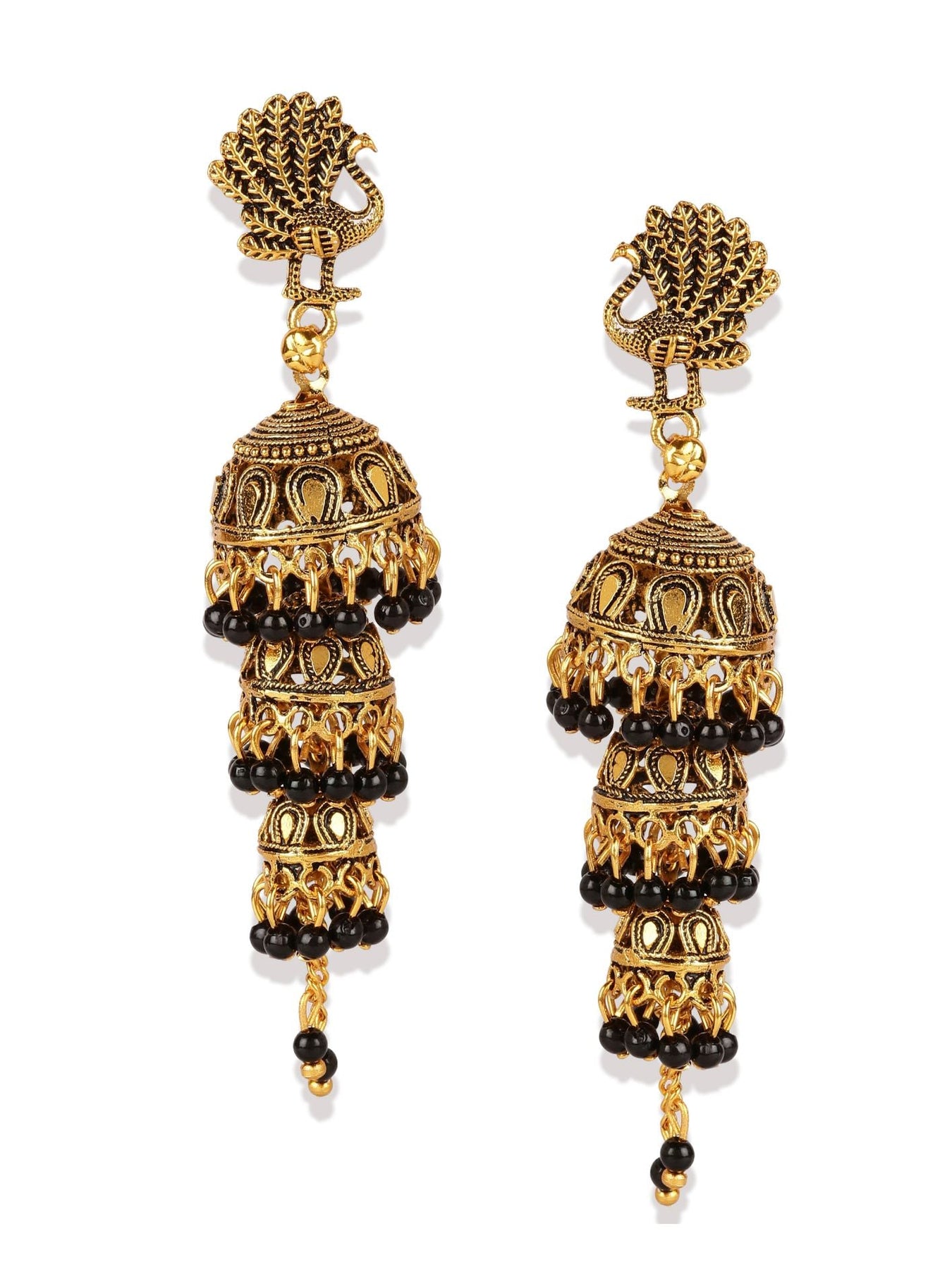 Gold Plated & Black Peacock Shaped Enamelled Jhumkas Secured With Post And Back Closure, Details: Enamelled