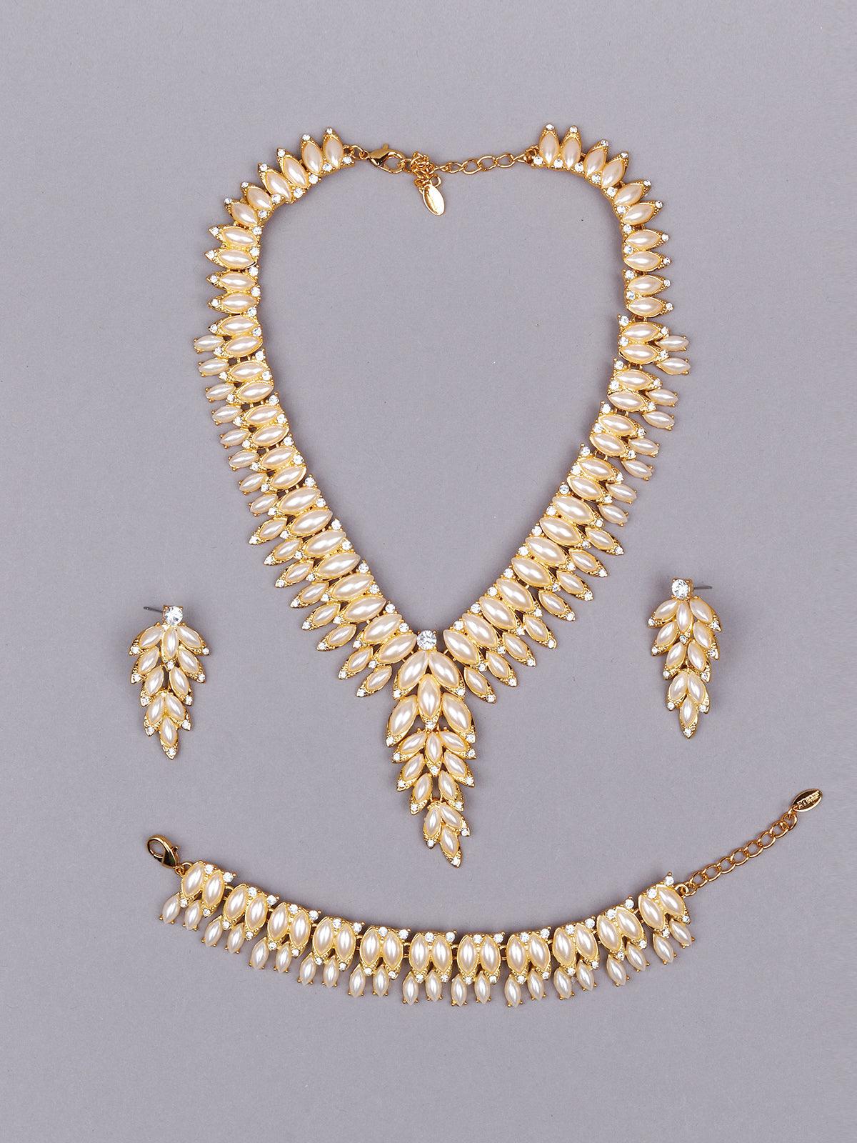Odette brings you this gorgeous necklace set in a gold-tone embellished with beads and metal. The necklace is quite a statement and sure to enhance your look. The necklace set comes with complimenting statement earrings and a gorgeous bracelet. The necklace set is your go-to when in doubt about your out because it’s sure to elevate your look instantly.