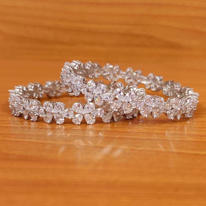 These beautiful bangles are handcrafted in silver alloy with one of the finest quality of signity american diamond stones. These bangles are coated with 18 kt white gold plating that gives a real look to the design and comes as a set of 2 bangles.