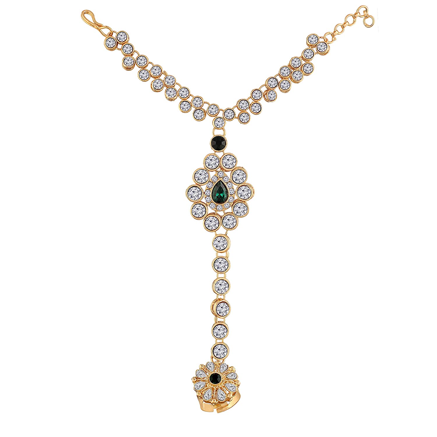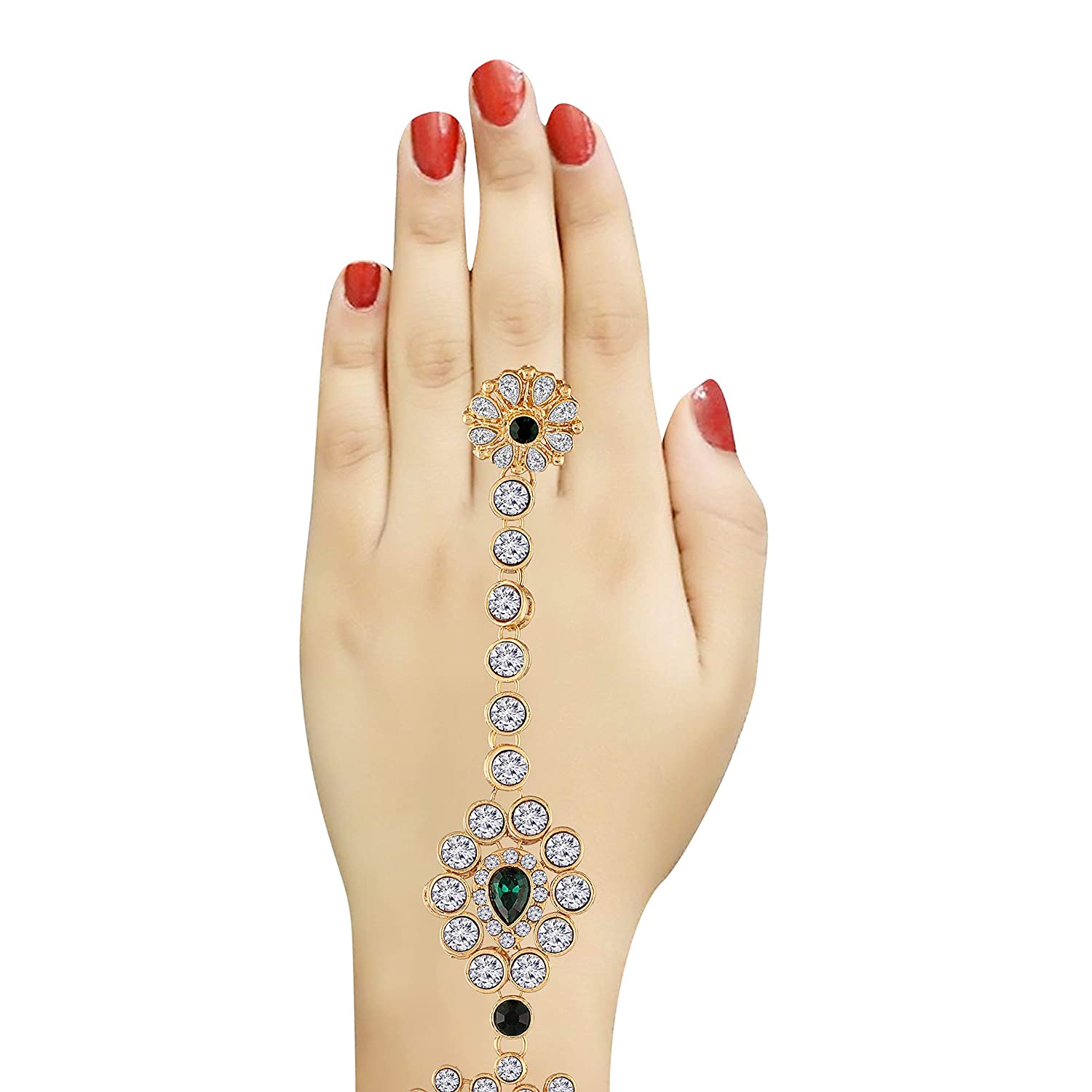 Your ethnic look is incomplete without a perfect Haath panja from "I JEWELS". Here is the finest sparkling bracelet with rings of latest style and shades to match your personality. It comes with very fashionable and detailed sparkling design to wear in parties, weddings, and special occasions.