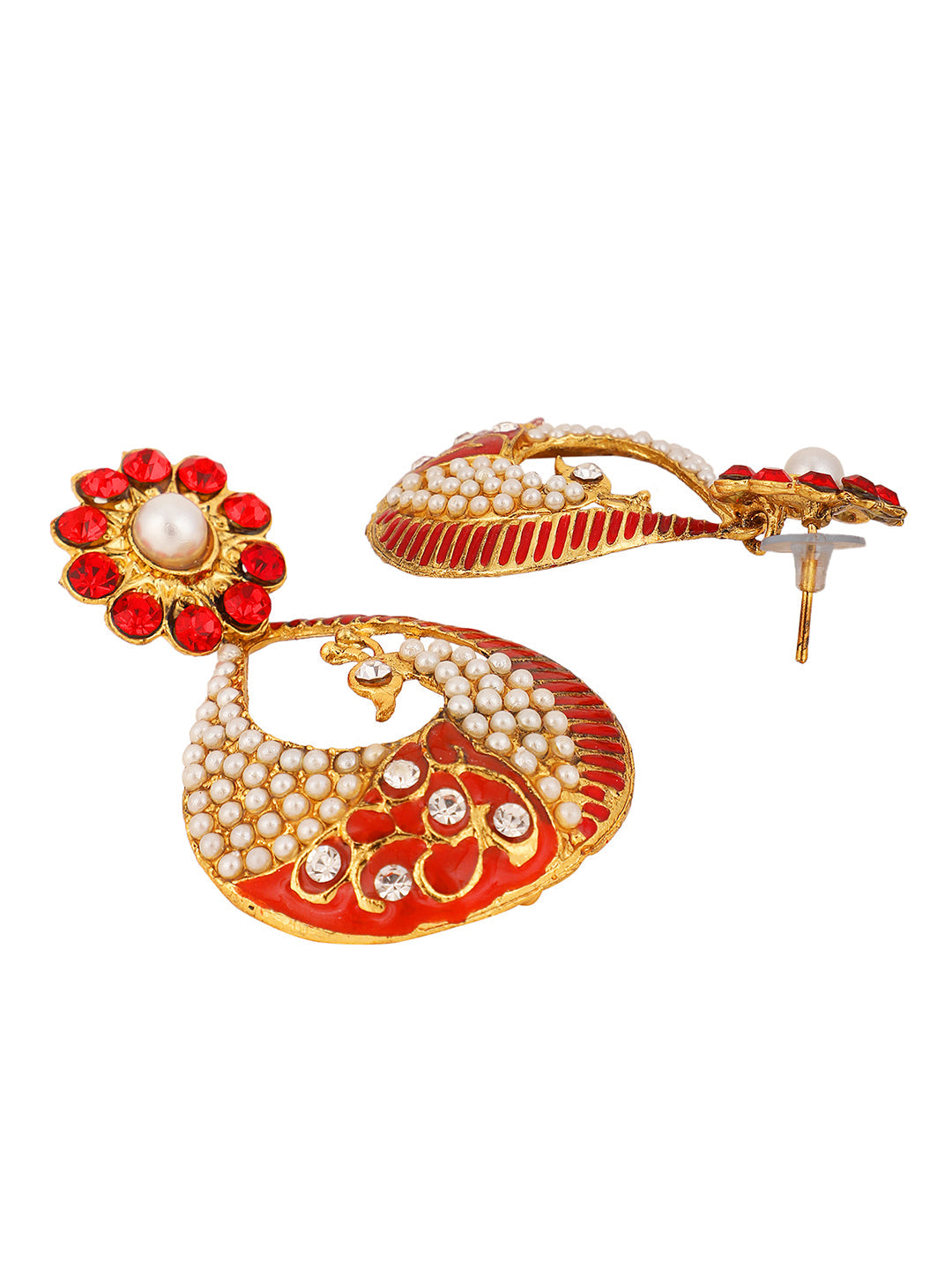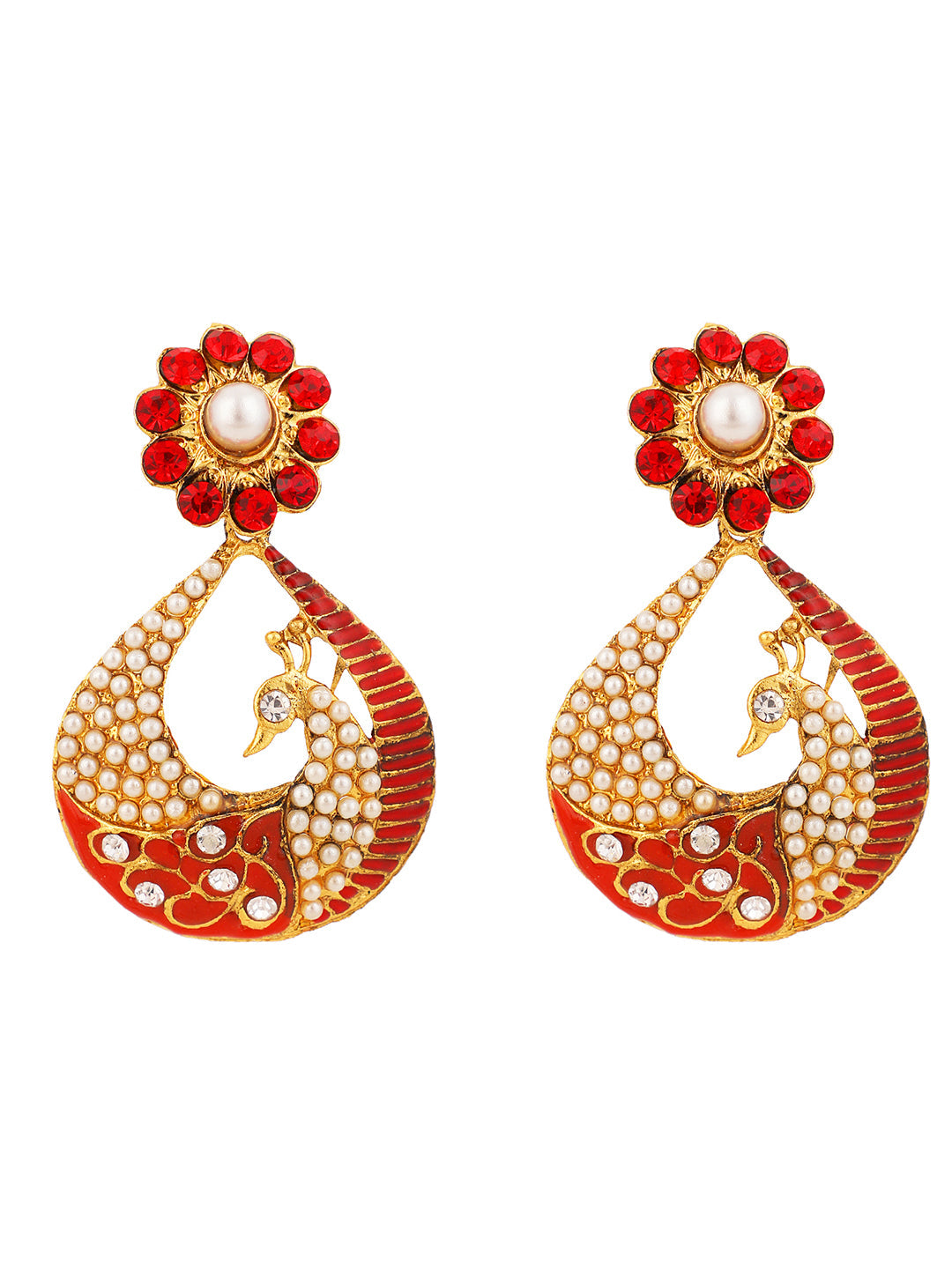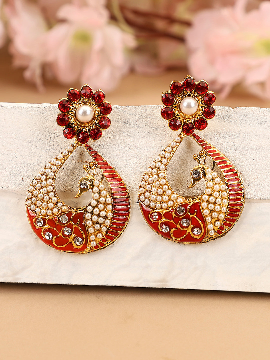 Gold Tone Red Meenakari Peacock Design Stylish Pear and Stone Earring,Secured With Post and Back Closure