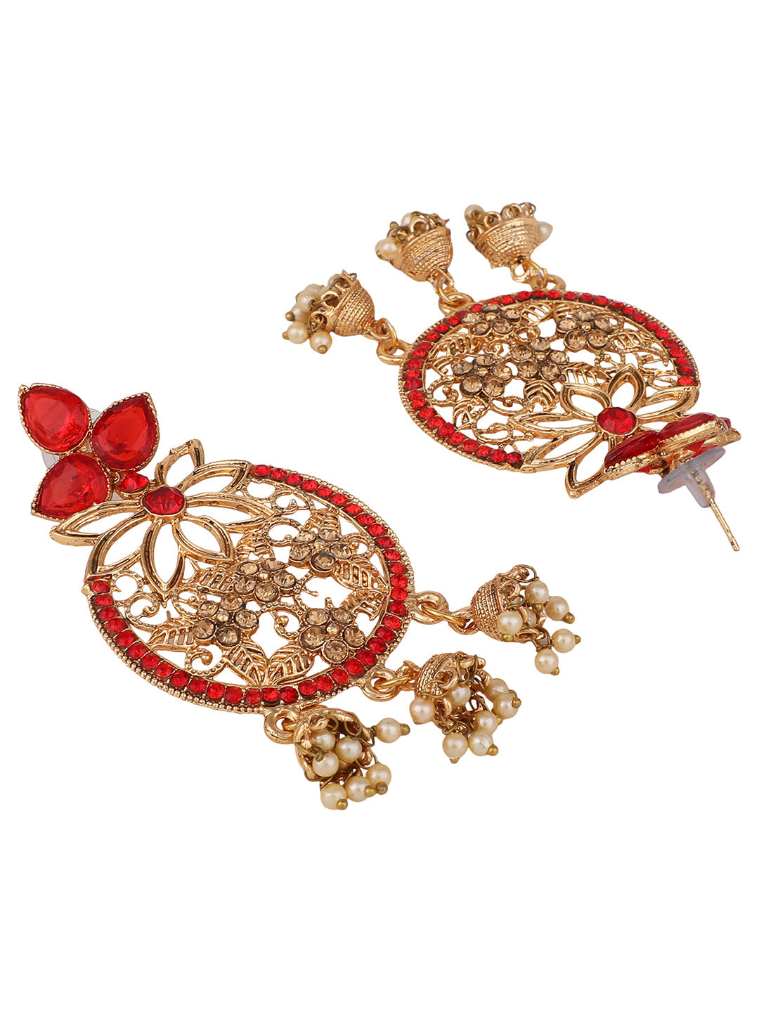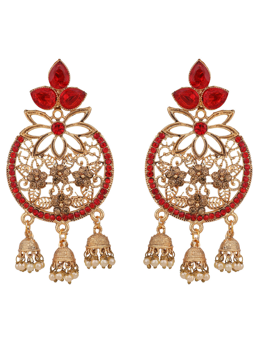 Stylish 3 Jhumki Gold Plated Red Stone Studded Traditonal Earring,Secured With Post and Back Closure