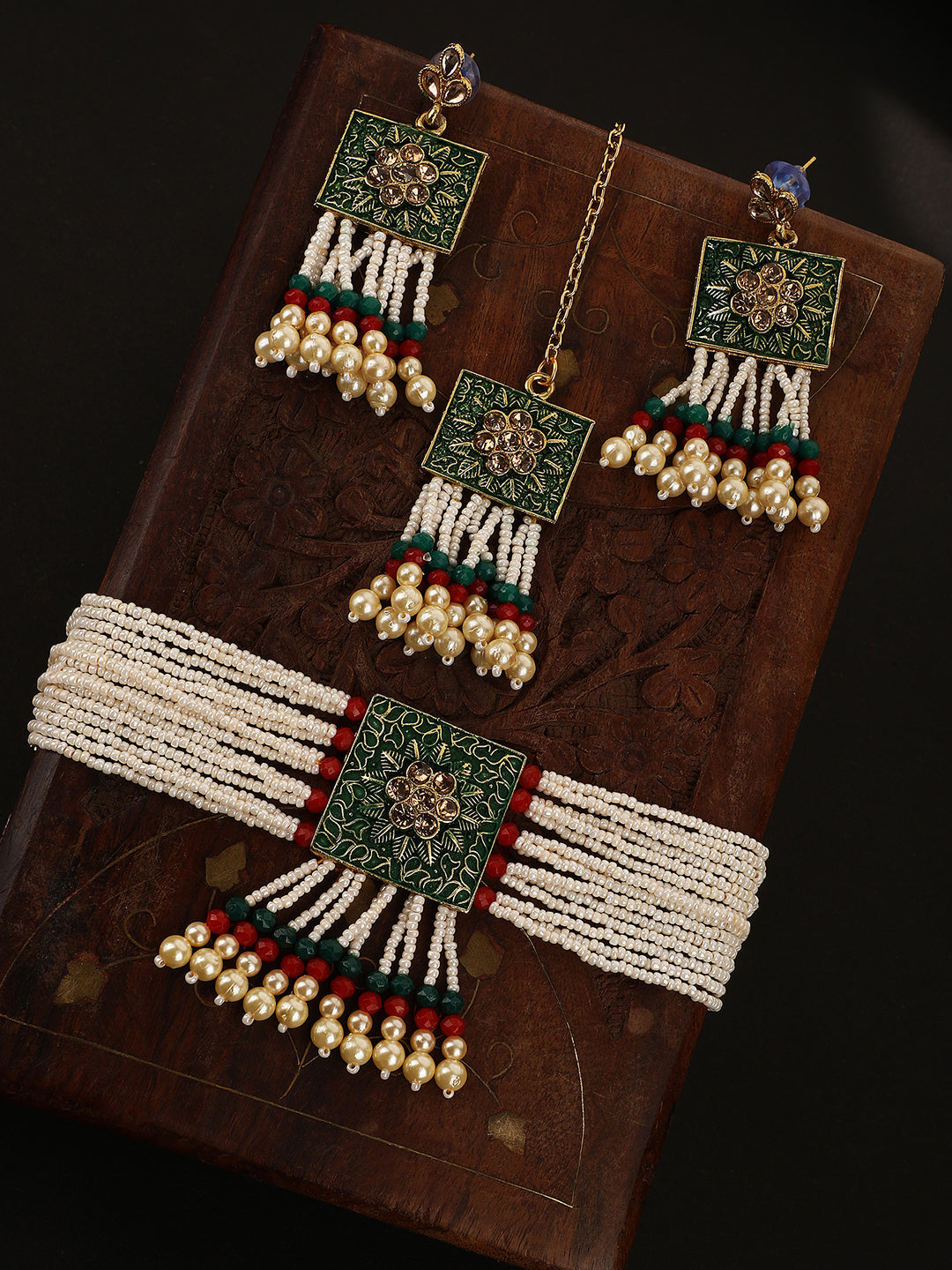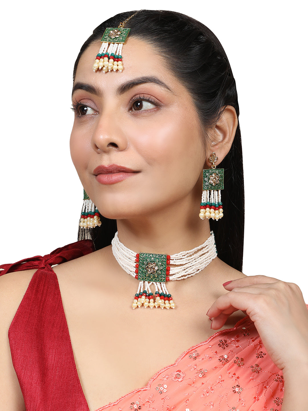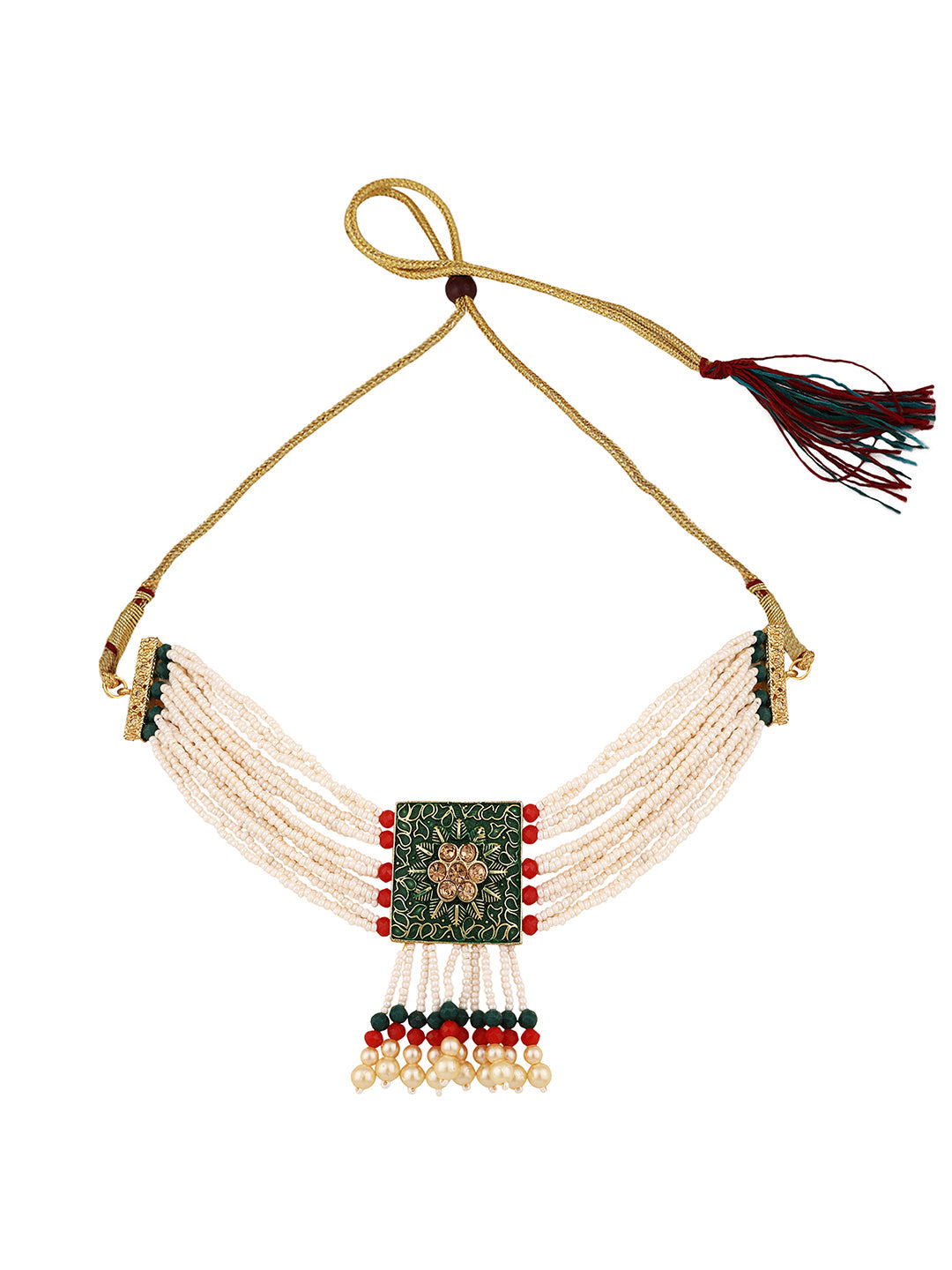 Statement Gold Plated Green Enameled Stone Studded with Pearl Layered and Multicolor Pearl Drop Choker set with EarringWomen love jewellery; specially traditional jewellery adore a women. They wear it on different occasion. They have special importance on ring ceremony, wedding and festive time. They can also wear it on regular basics. Make your moment memorable with this range. This jewel set features a unique one of a kind traditional embellish with antic finish.