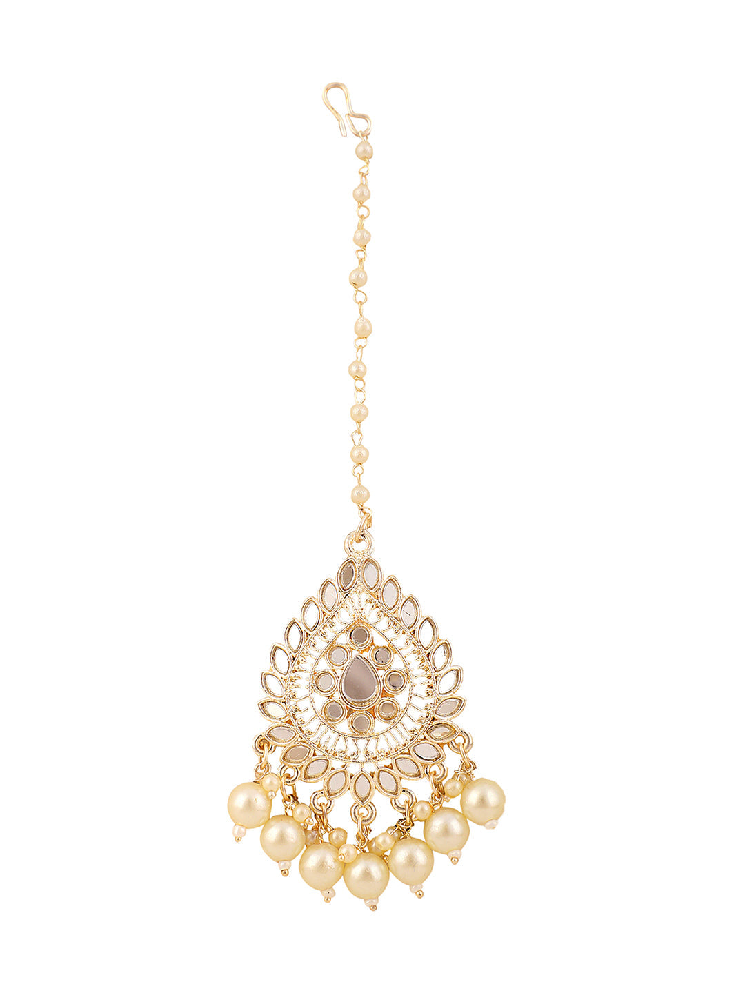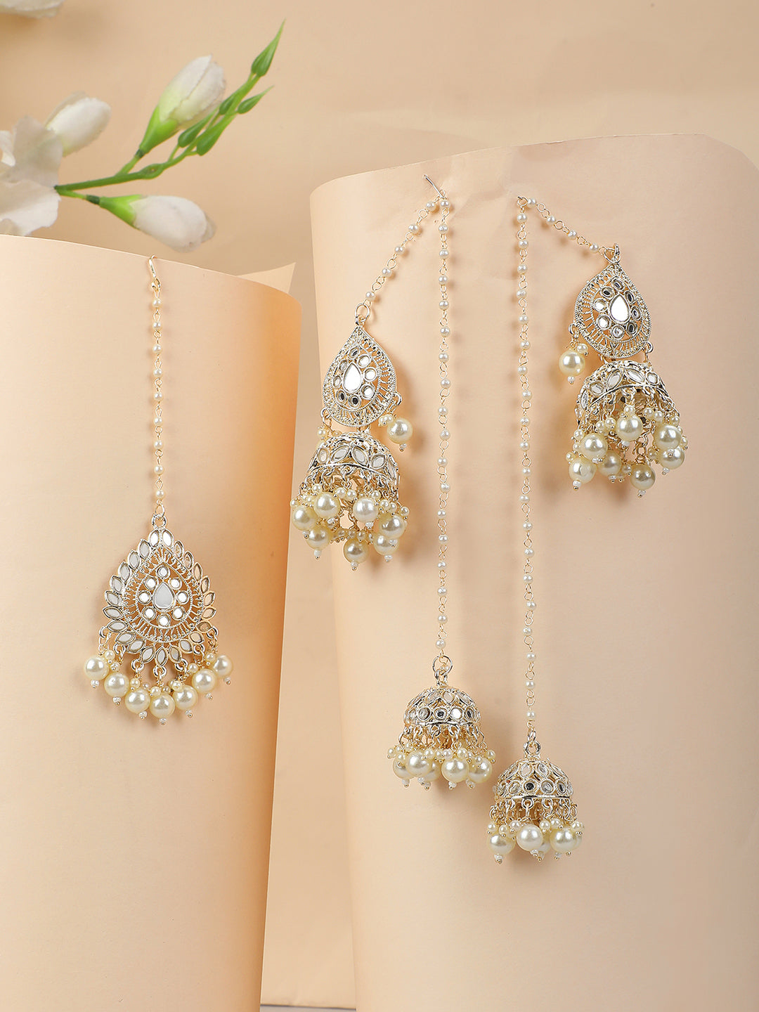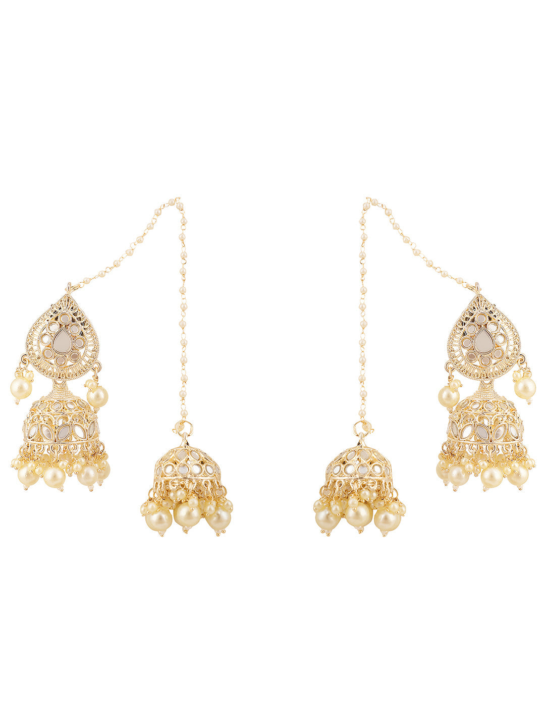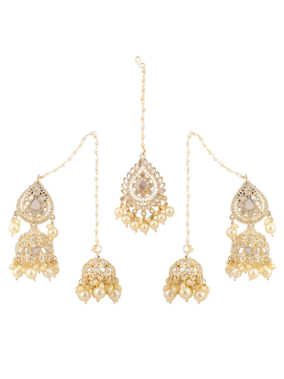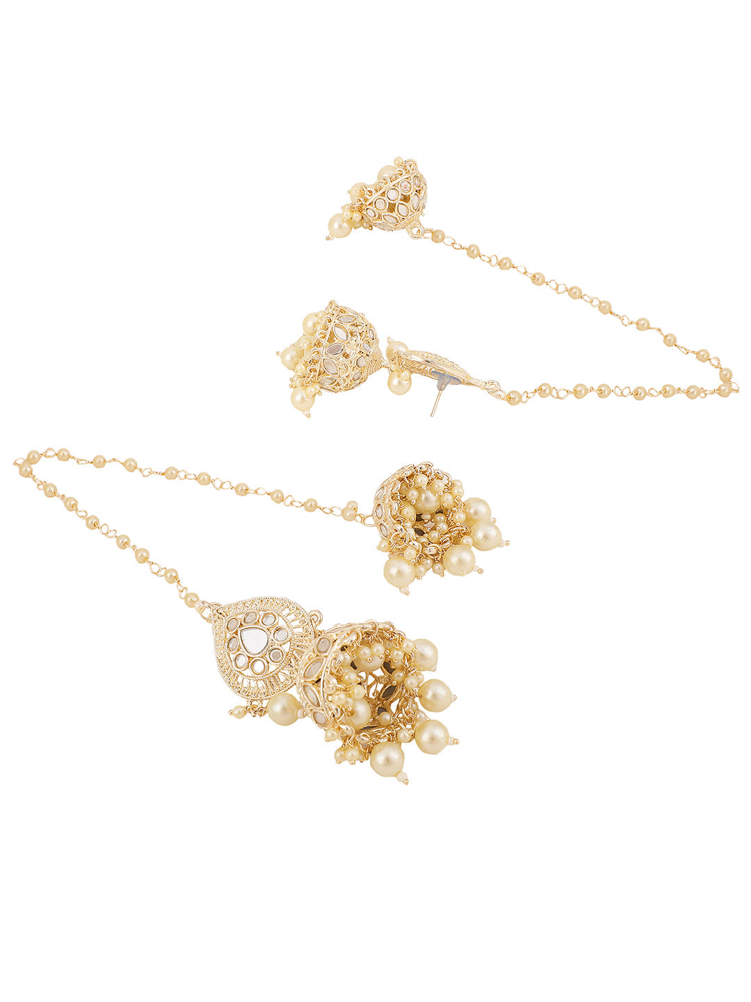 Traditional Gold Plated Double Jhumki with Chain white Stone Maangtika Earring, Earring Secured with a Post and Back Closure and Maangtika with Hook Closure