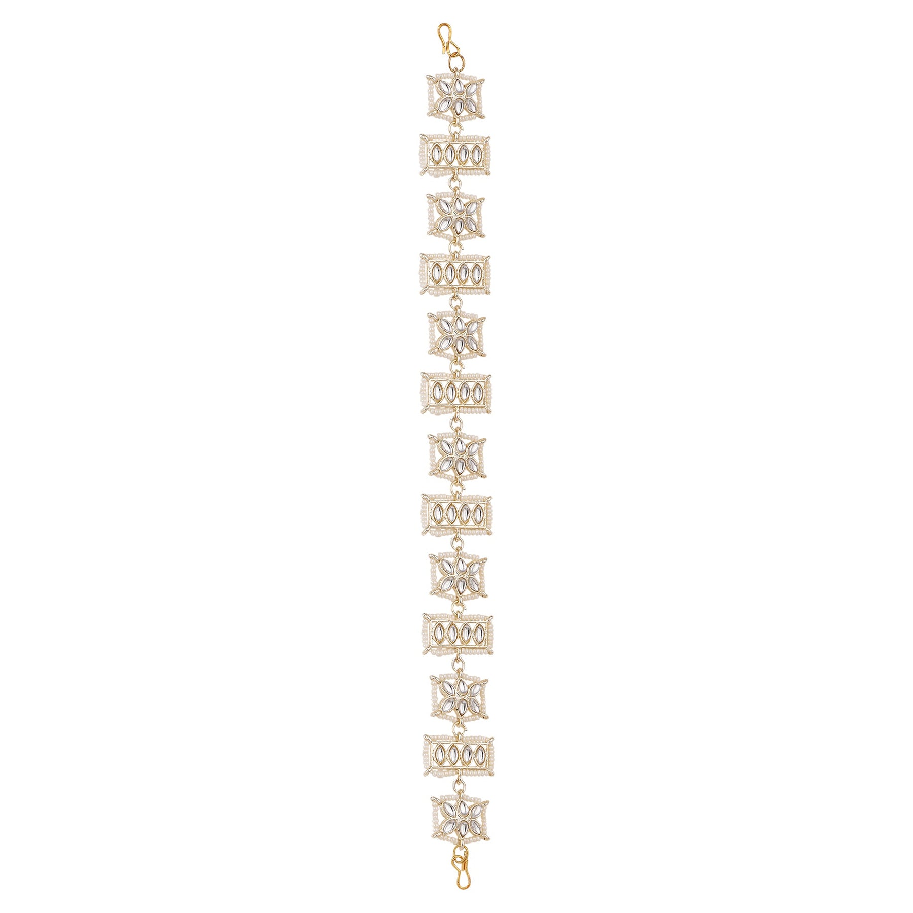 Traditional Gold Plated Square Shaped White colored Pearl and Kundan Studded Matha PattiWomen love jewellery; specially traditional jewellery adore a women. They wear it on different occasion. They have special importance on ring ceremony, wedding and festive time. They can also wear it on regular basics. Make your moment memorable with this range. This jewel set features a unique one of a kind traditional embellish with antic finish.