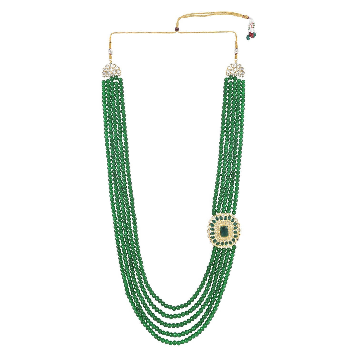 Introducing the I Jewels 5 Layered Traditional Gold Plated Dulha Moti Mala with Beaded Maharaja Haar, the perfect accessory for any groom looking to add a touch of traditional elegance to their wedding attire. This stunning necklace for men is made of high-quality materials and features a traditional design that is sure to impress. The necklace is crafted with multiple layers of golden chains and pearls, creating a luxurious and sophisticated look. The centerpiece of the necklace is a beautiful beaded Maharaja Haar, adding an extra touch of regal style to the overall design. The necklace is gold-plated for a rich and authentic look, and the beads are carefully selected and arranged to create a stunning visual effect. The necklace is easy to wear and adjust, making it comfortable for the groom to wear throughout the wedding day.