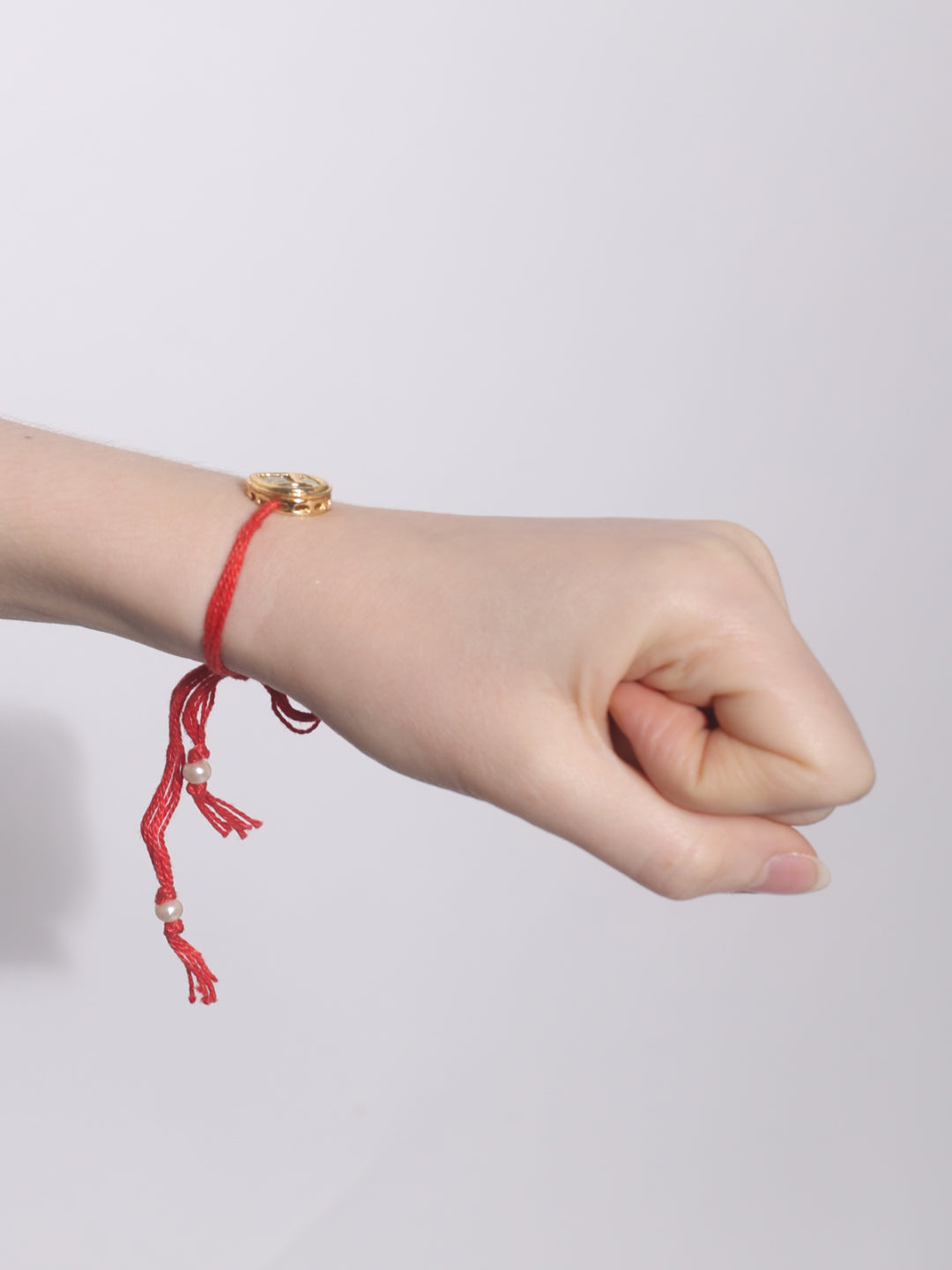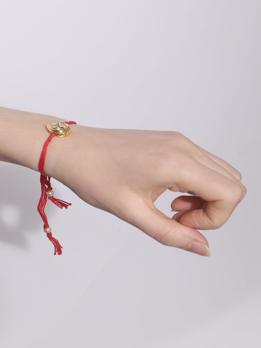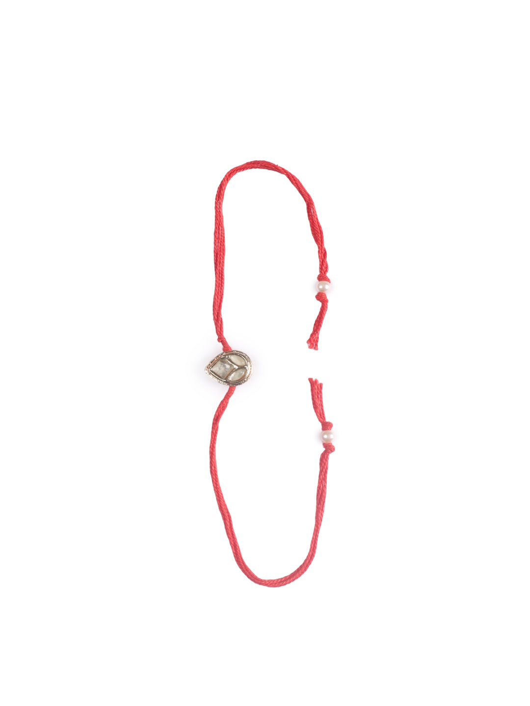 Red And Gold Bahiya Rahki With Roli And Chawal Having Kundan And Pearls; Category Of Jewellery Is Hand Jewellery; Sub Category Is Rakhi; Ideal For Men; Color Is Red, Gold; Gemstones Used - Kundan, Pearl; Plating Is Gold-Plated; Base Metal Is Alloy; Other Material Used - Adjustable Dori; Size Is Freesize; Adjustable - Yes; Weight Is 12 Gms; Mesaurements - Length Of Rakhi =33 Cm; Width Of Rakhi = 2.5 Cm; Adjustable - Yes; Content 1 Rakhi 1 Roli Chawal