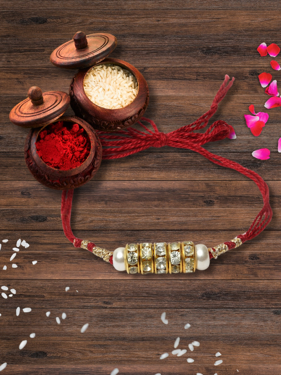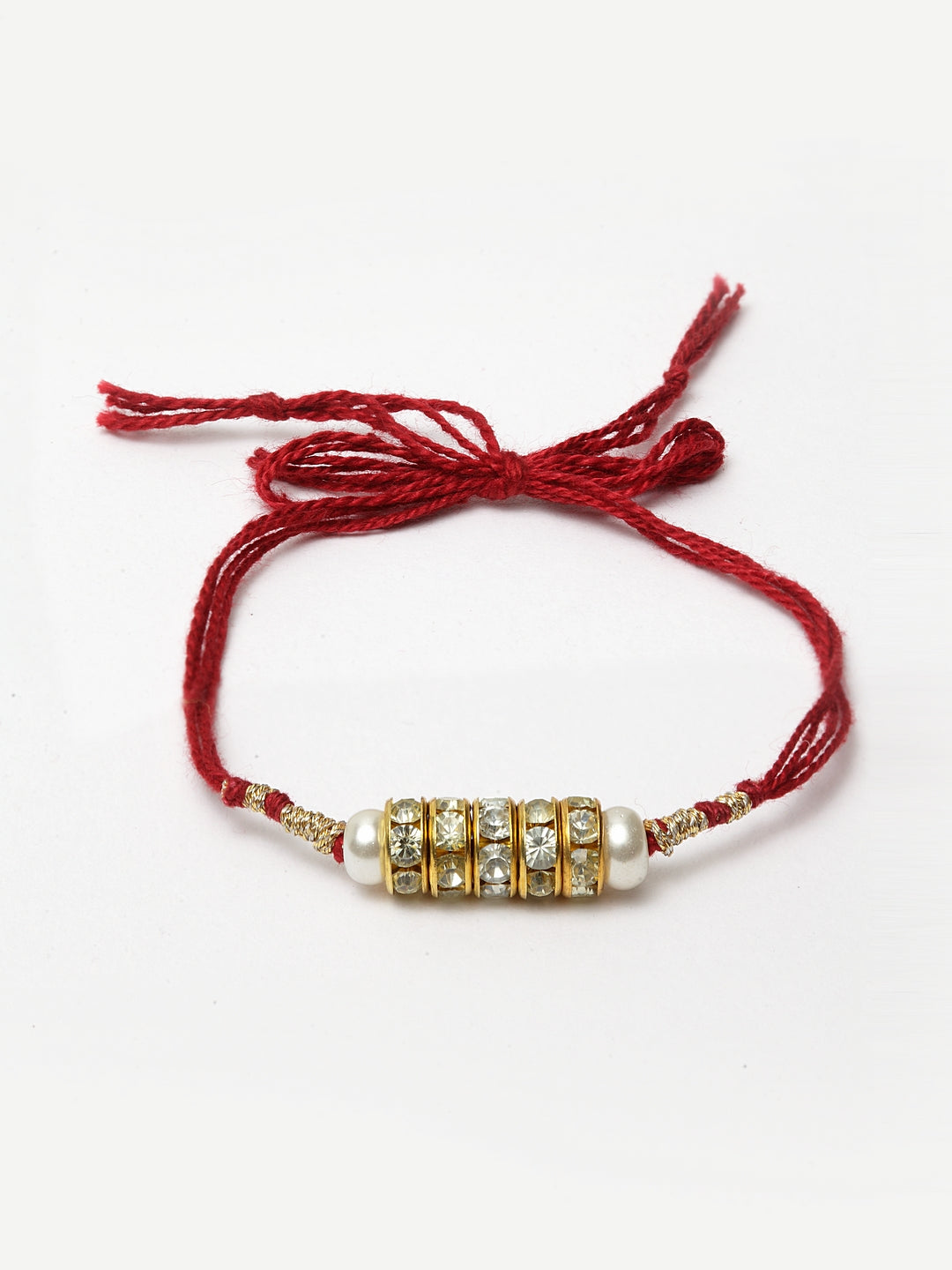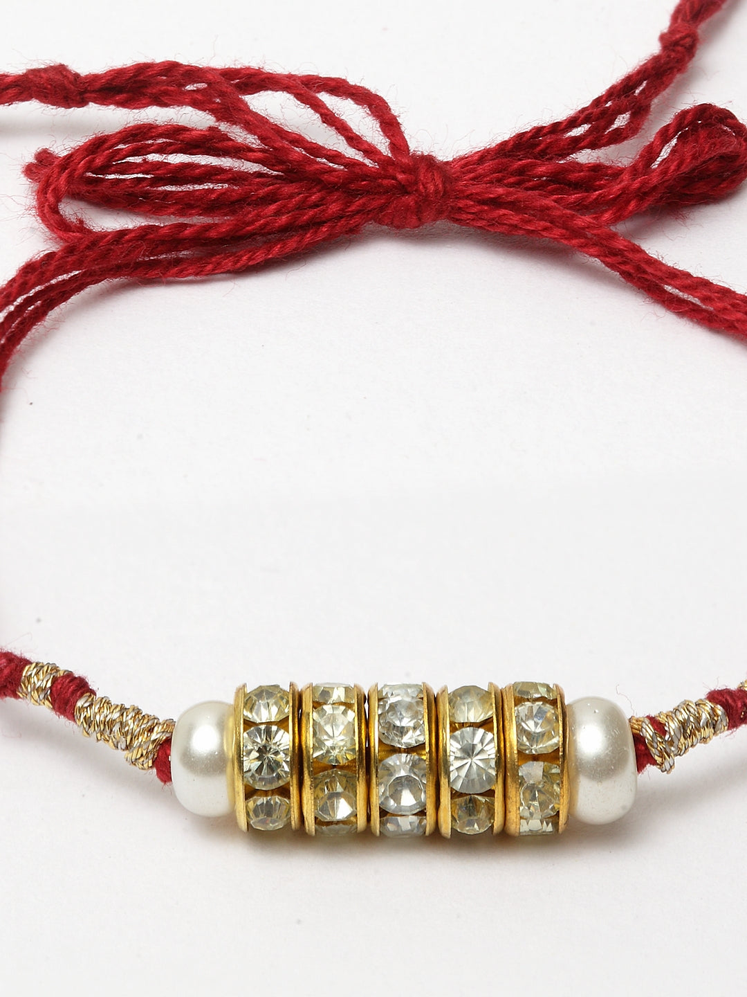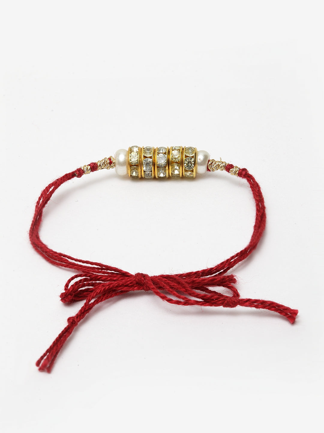 Red & Rakhi Bracelet With American Diamond & Pearl; Category Of Jewellery Is Hand Jewellery; Sub Category Is Rakhi; Ideal For Men; Base Color Is Red; Gemstones Used - American Diamond, Pearl; Plating Is Gold-Plated; Base Metal Is Alloy; Other Material Used - 0; Size Is Freesize; Adjustable - Yes; Weight Is 5 Gms; Mesaurements - Length Of Bhahiya Rakhi =46 Cm; Width = 2 Cm; Content 1 Rakhi And 1 Roli Chawal