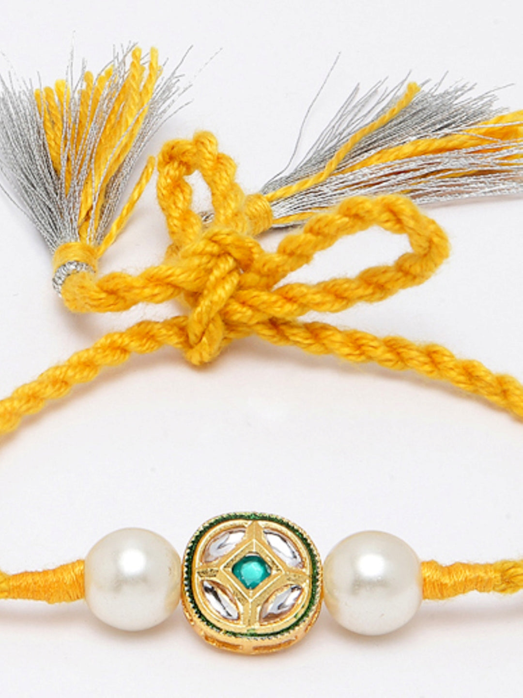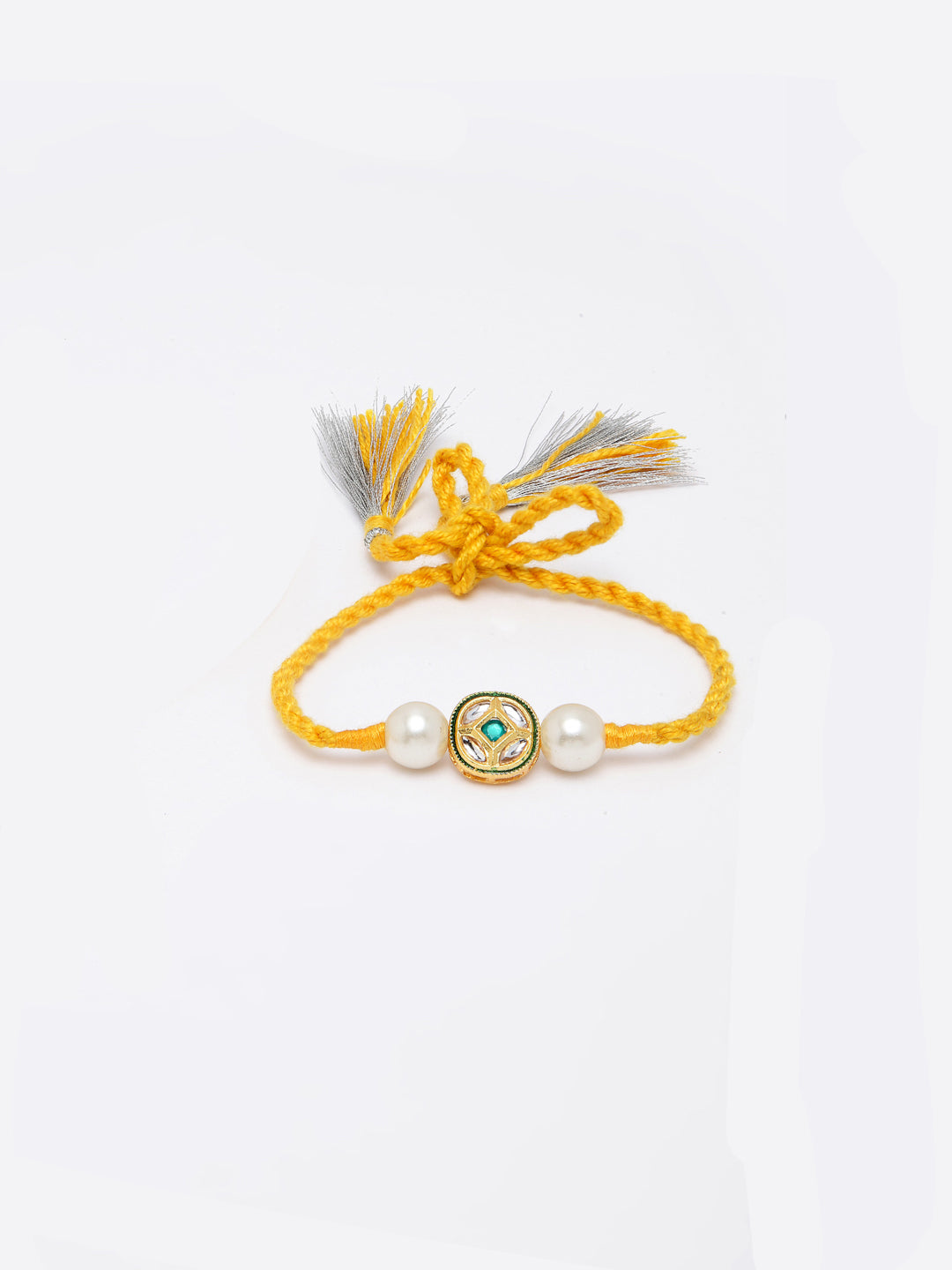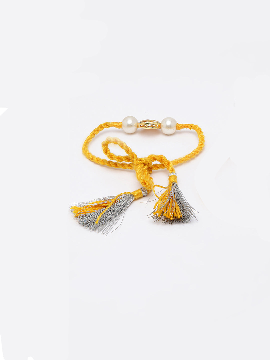 Yellow Rakhi Bracelet With Kundan & Pearls; Category Of Jewellery Is Hand Jewellery; Sub Category Is Rakhi; Ideal For Men; Base Color Is Yellow; Gemstones Used - Kundan, Pearls; Plating Is Gold-Plated; Base Metal Is Alloy; Other Material Used - 0; Size Is Freesize; Adjustable - Yes; Weight Is 5 Gms; Mesaurements - Length Of Bhahiya Rakhi =46 Cm; Width = 2 Cm; Content 1 Rakhi And 1 Roli Chawal