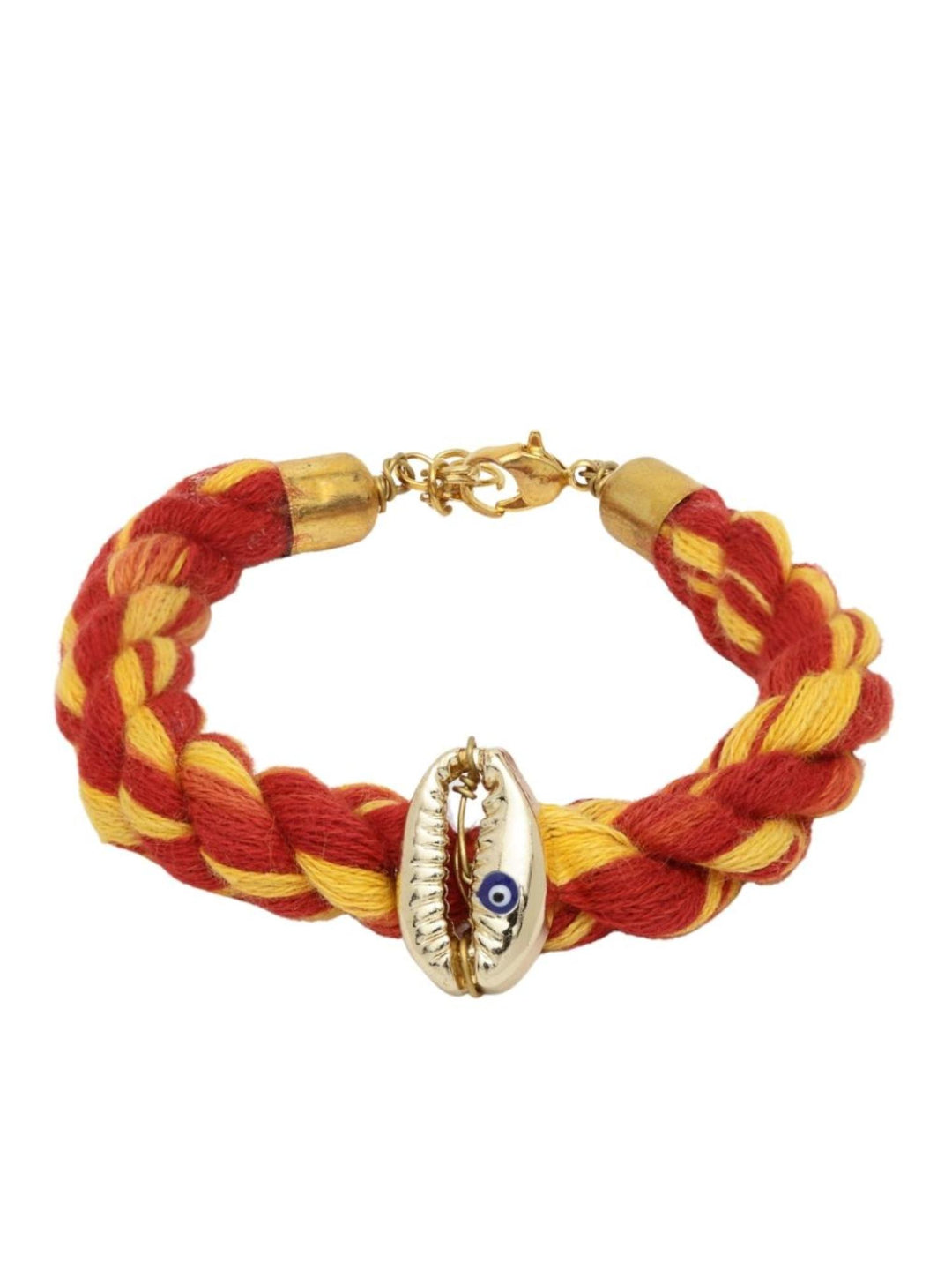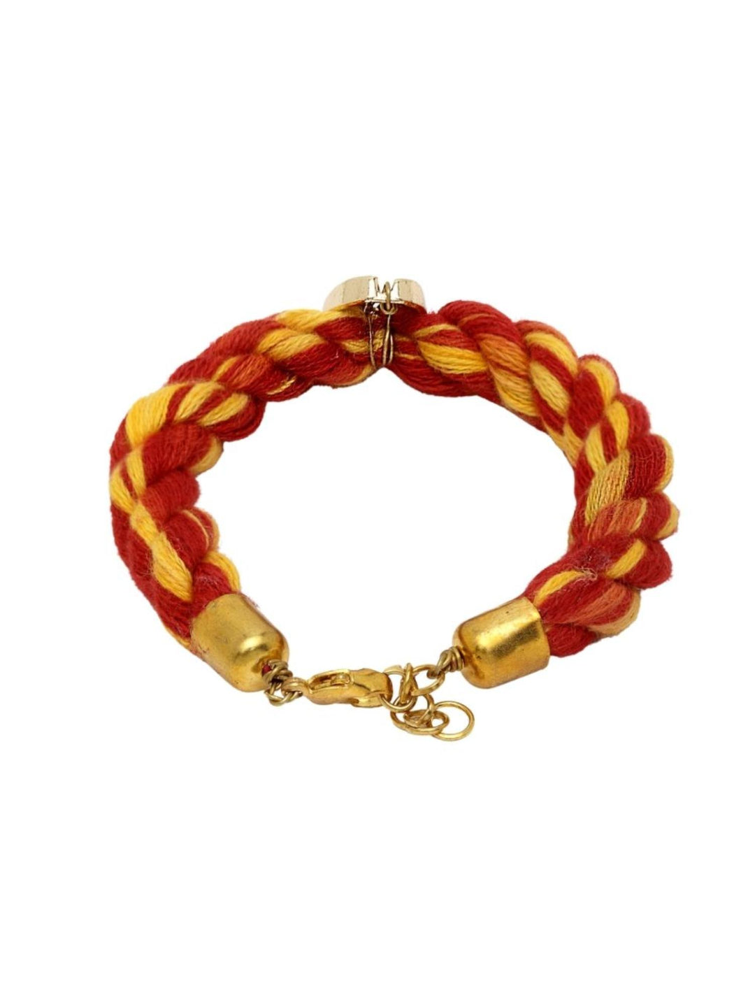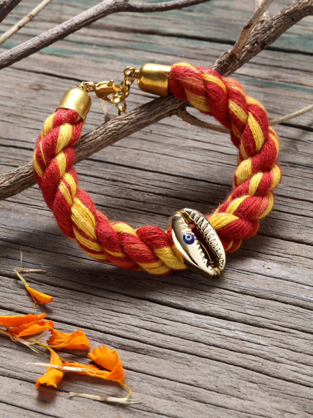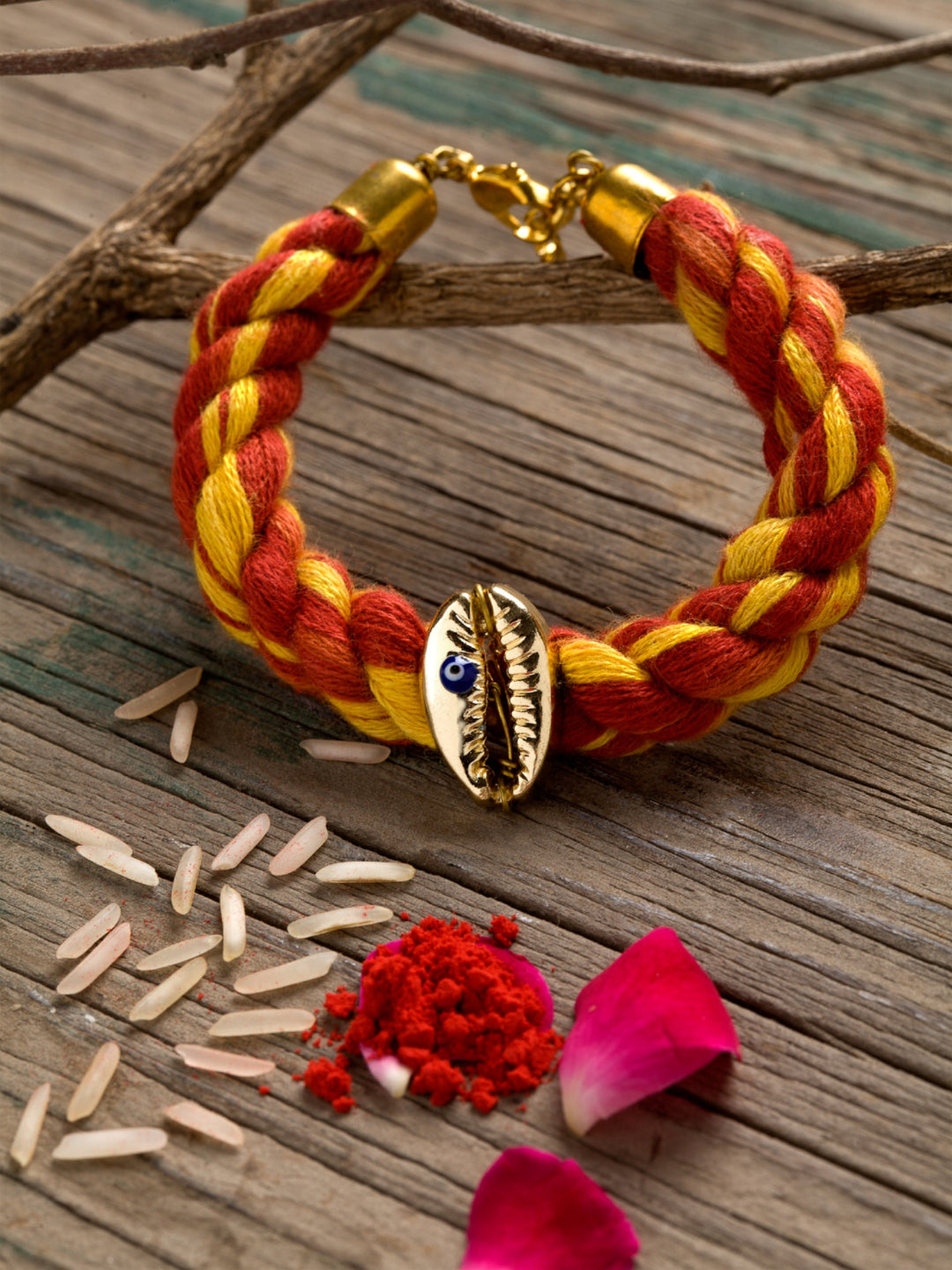 Red & Rakhi Bracelet With Evil Eye Shell &; Category Of Jewellery Is Hand Jewellery; Sub Category Is Rakhi; Ideal For Men; Base Color Is Red; Gemstones Used - Evil Eye Shell; Plating Is Gold-Plated; Base Metal Is Alloy; Other Material Used - Cotton Dhaga; Size Is Freesize; Adjustable - Yes; Weight Is 10 Gms; Mesaurements - Length Of Rakhi =24 Cm; Width Of Rakhi = 3 Cm; Content 1 Rakhi