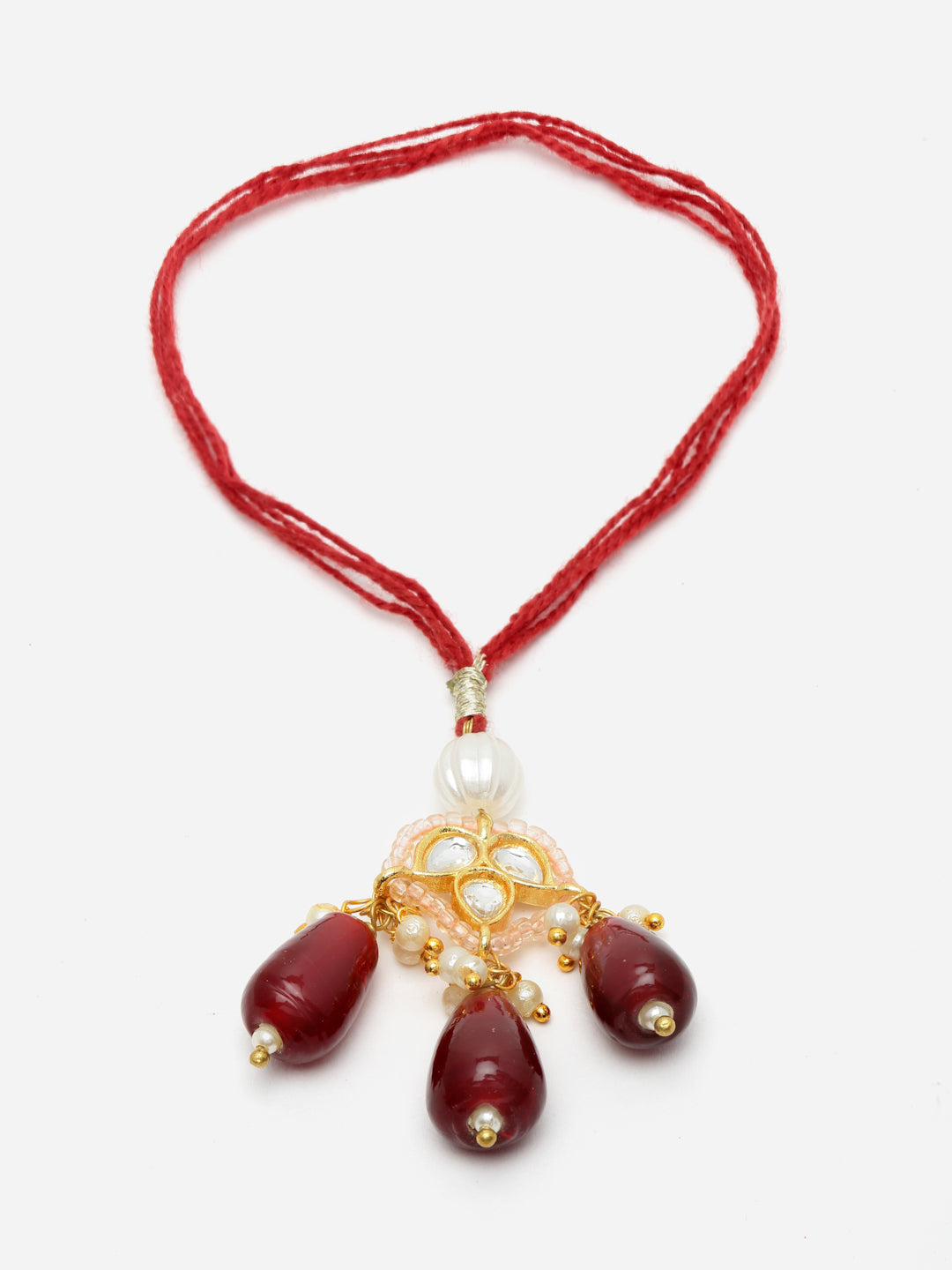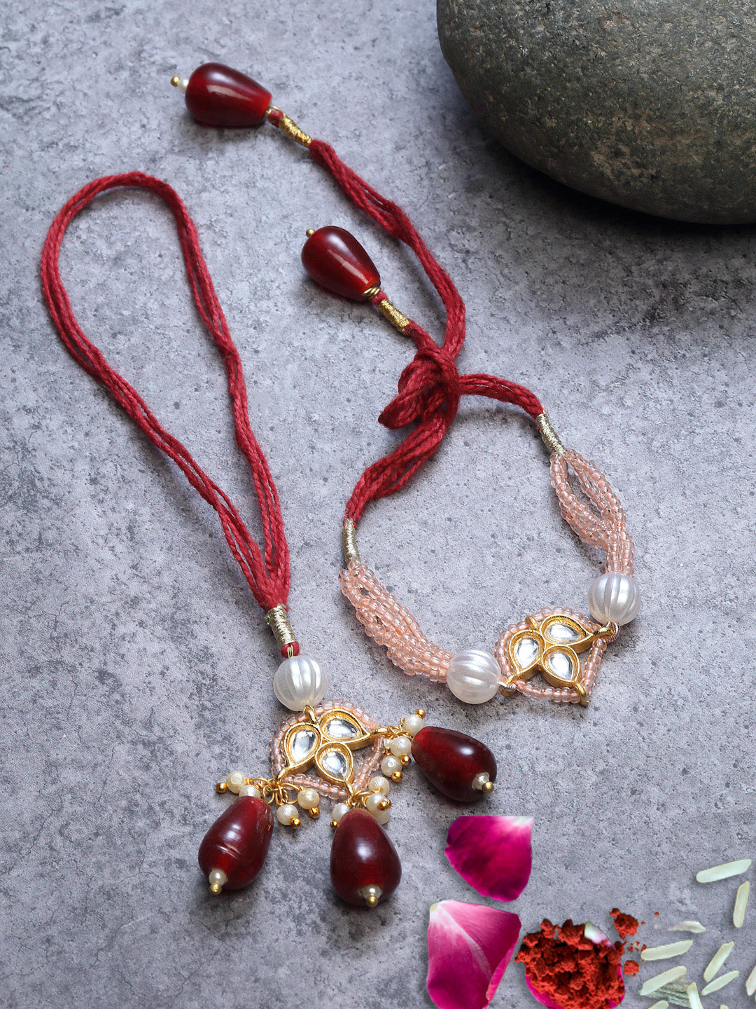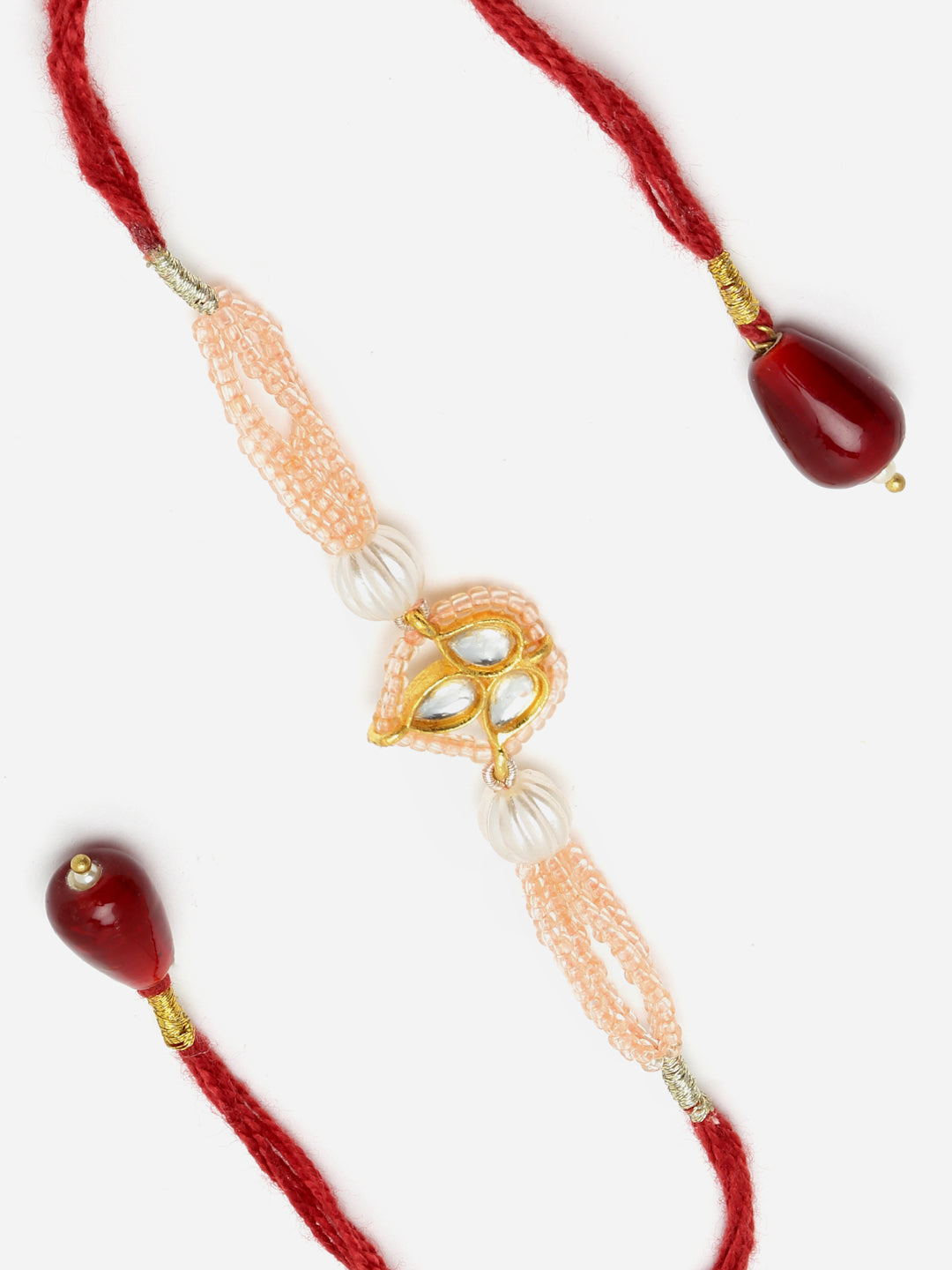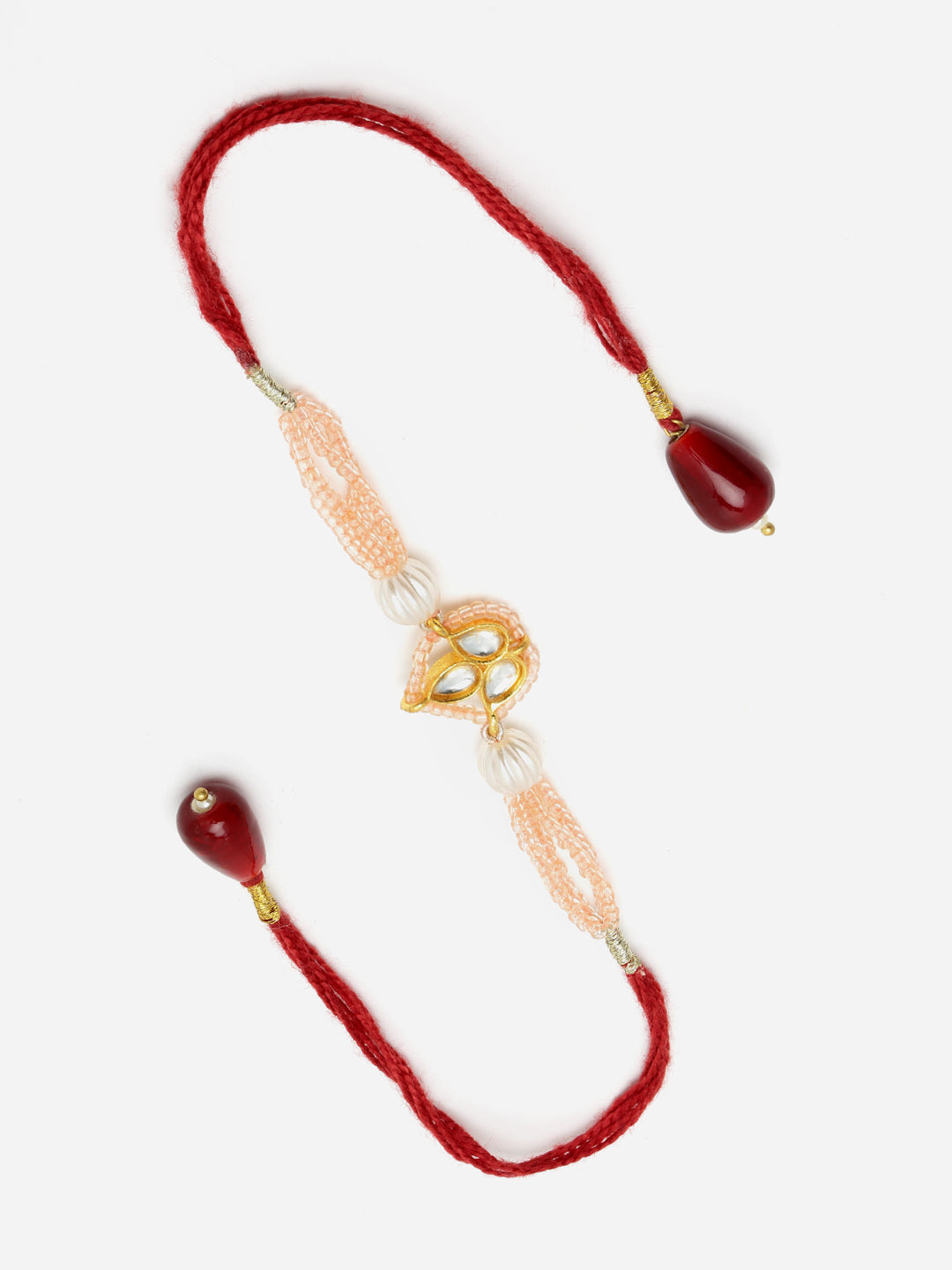 Red & Peach Kundan Bahiya Bhabhi Rakhi With Roli And Chawal; Category Of Jewellery Is Hand Jewellery; Sub Category Is Rakhi; Ideal For Men; Color Is Red,Peach, White, Gold; Gemstones Used - Kundan, Pearls, Natural Stones; Plating Is Gold-Plated; Base Metal Is Alloy; Other Material Used - Cotton Dhaga; Size Is Freesize; Adjustable - Yes; Weight Is 12 Gms; Mesaurements - Length Of Rakhi =38 Cm; Width Of Rakhi = 1.2 Cm; Length Of Lumba =17 Cm; Width Of Lumba = 3 Cm; Adjustable - Yes; Content 1 Rakhis 1 Lumba 1 Roli 1 Chawal