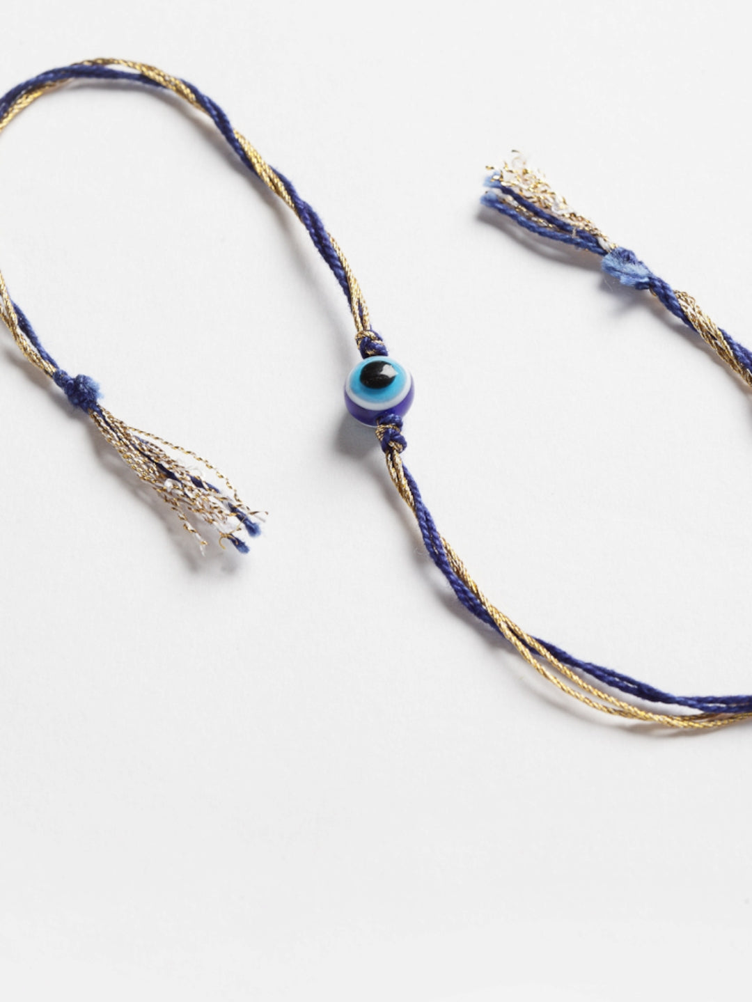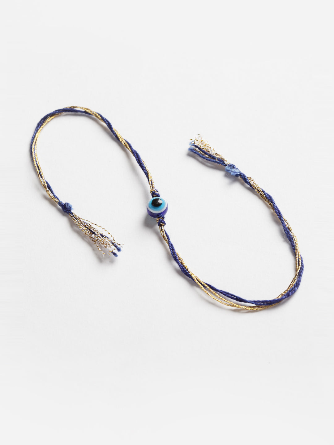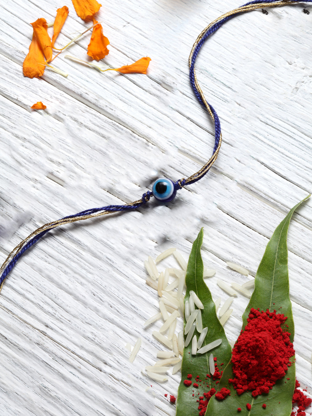 Blue & White Evil Eye Bahiya Rakhi With Roli And Chawal; Category Of Jewellery Is Hand Jewellery; Sub Category Is Rakhi; Ideal For Men; Color Is Blue, White, Gold, Black; Gemstones Used - Evil Eye, Pearls, Natural Stones; Plating Is Gold-Plated; Base Metal Is Alloy; Other Material Used - Cotton Dhaga; Size Is Freesize; Adjustable - Yes; Weight Is 12 Gms; Mesaurements - Length Of Rakhi =33 Cm; Width Of Rakhi = 2.5 Cm; Adjustable - Yes; Content 1 Rakhis 1 Roli 1 Chawal