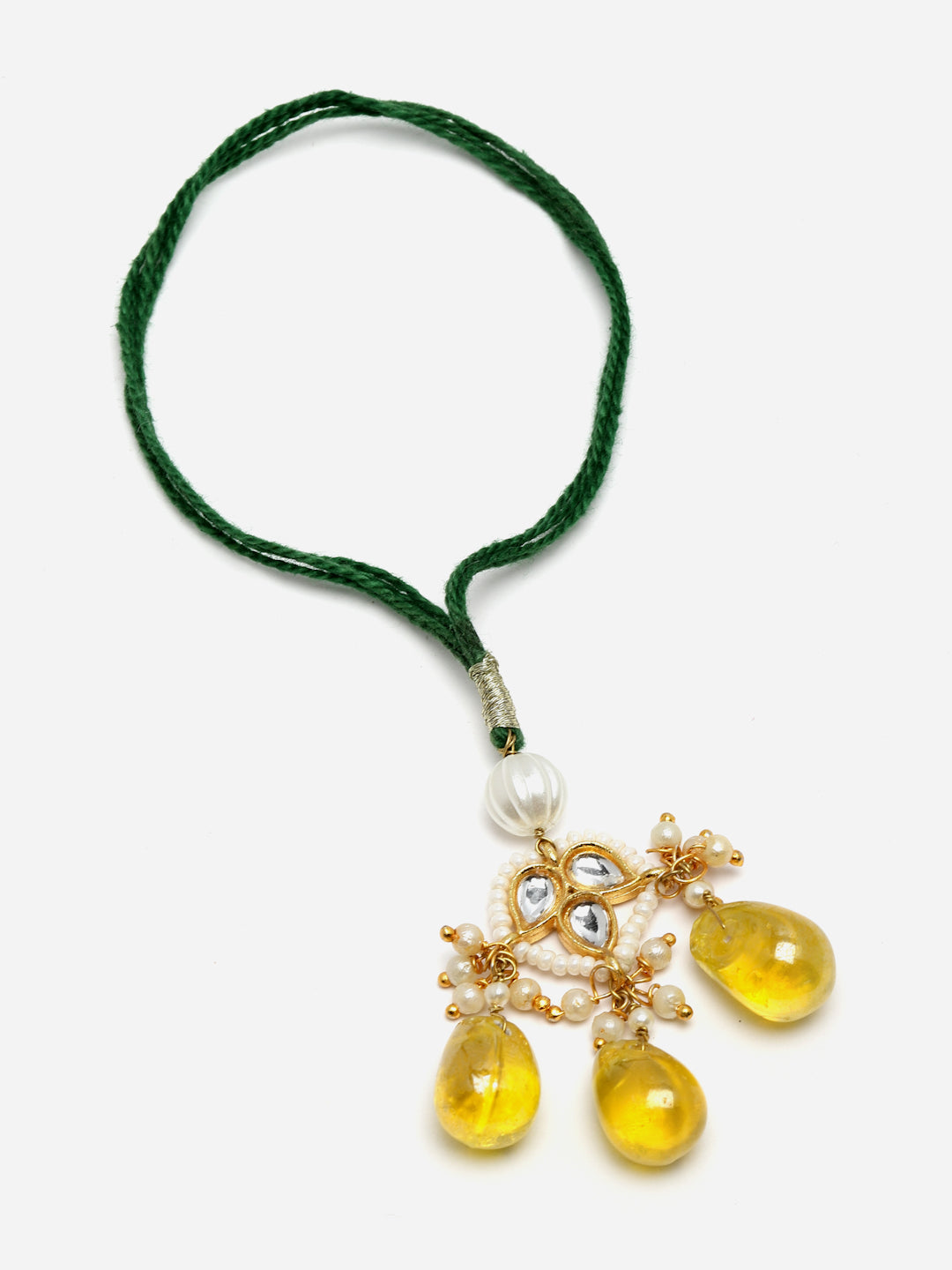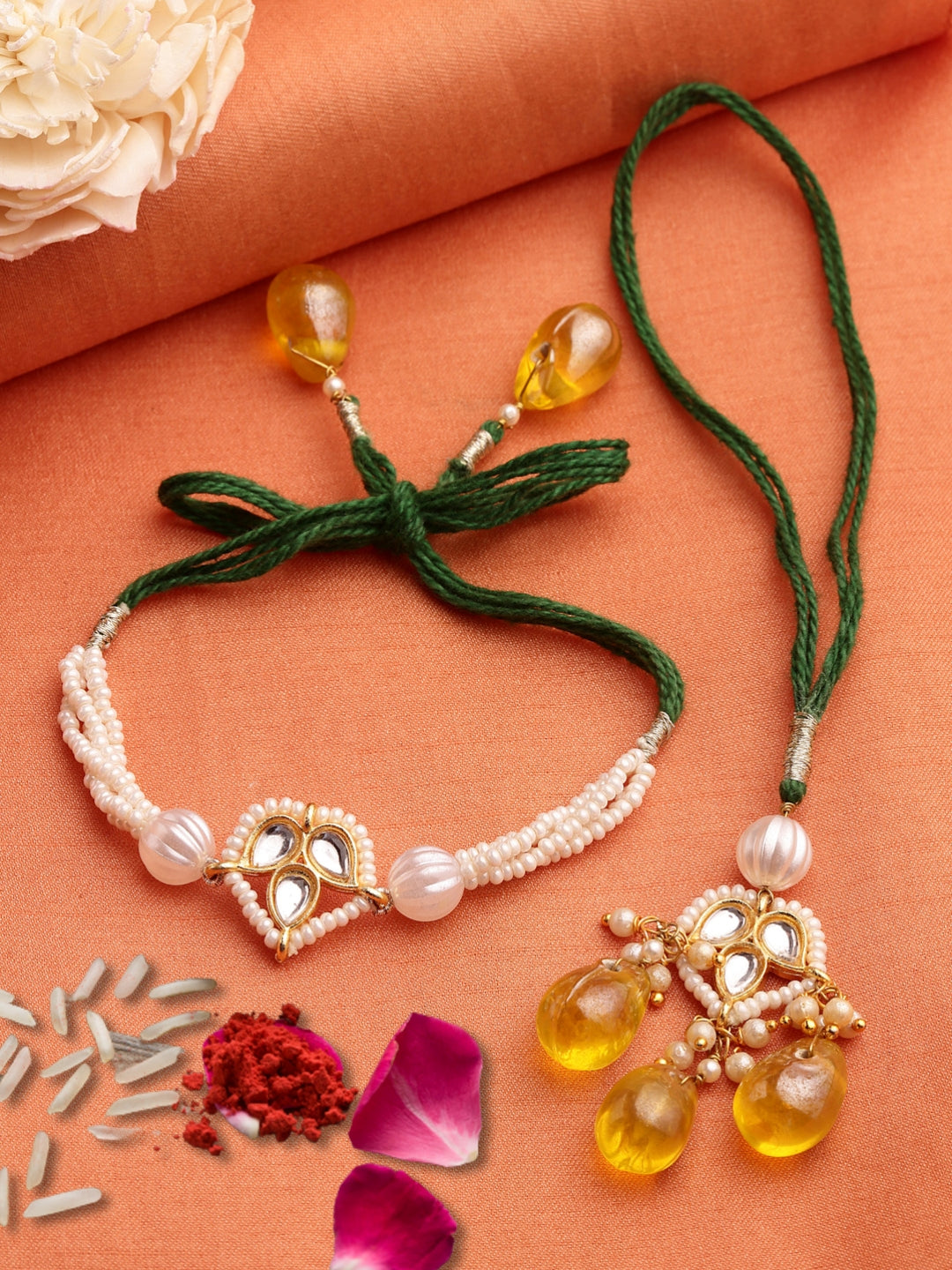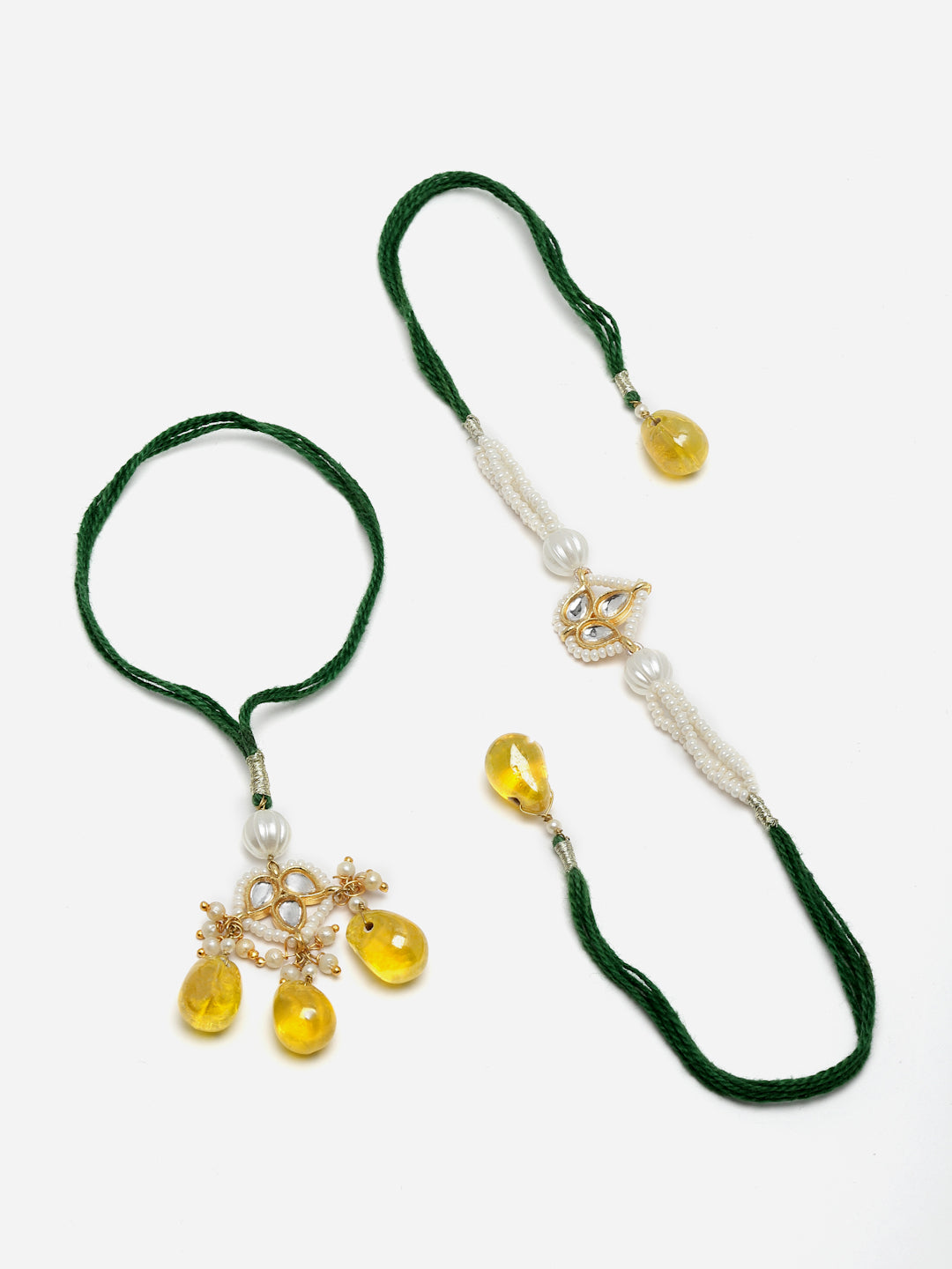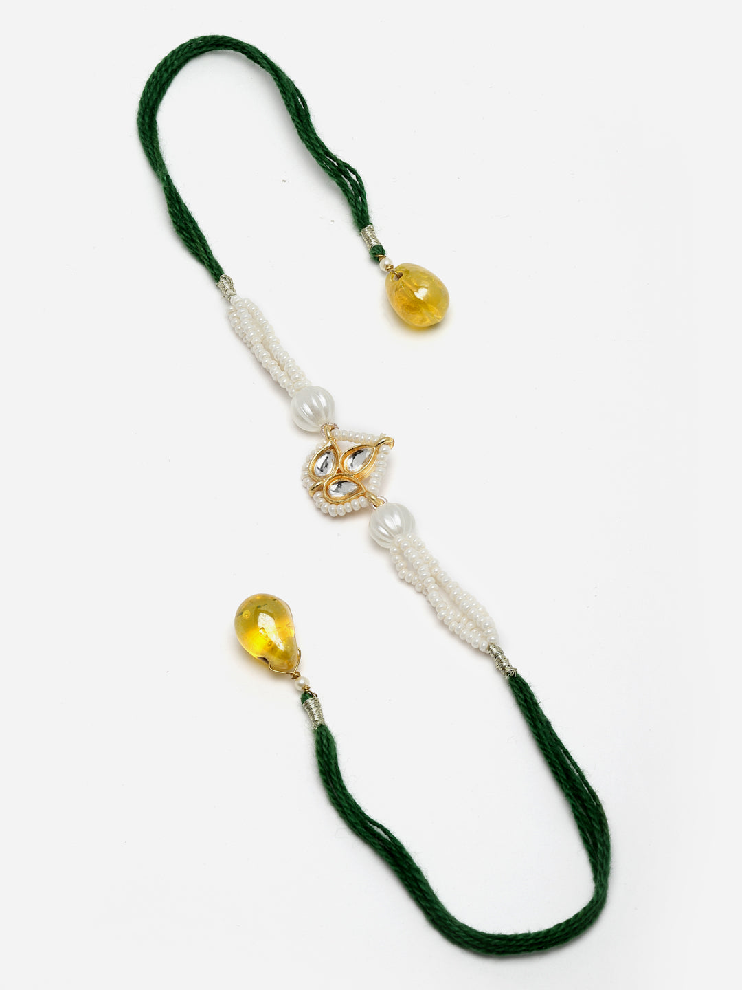 Green & Yellow Kundan Bahiya Bhabhi Rakhi With Roli And Chawal; Category Of Jewellery Is Hand Jewellery; Sub Category Is Rakhi; Ideal For Men; Color Is Green, Yellow, White, Gold; Gemstones Used - Kundan, Pearls, Natural Stones; Plating Is Gold-Plated; Base Metal Is Alloy; Other Material Used - Cotton Dhaga; Size Is Freesize; Adjustable - Yes; Weight Is 12 Gms; Mesaurements - Length Of Rakhi =38 Cm; Width Of Rakhi = 1.2 Cm; Length Of Lumba =17 Cm; Width Of Lumba = 3 Cm; Adjustable - Yes; Content 1 Rakhis 1 Lumba 1 Roli 1 Chawal