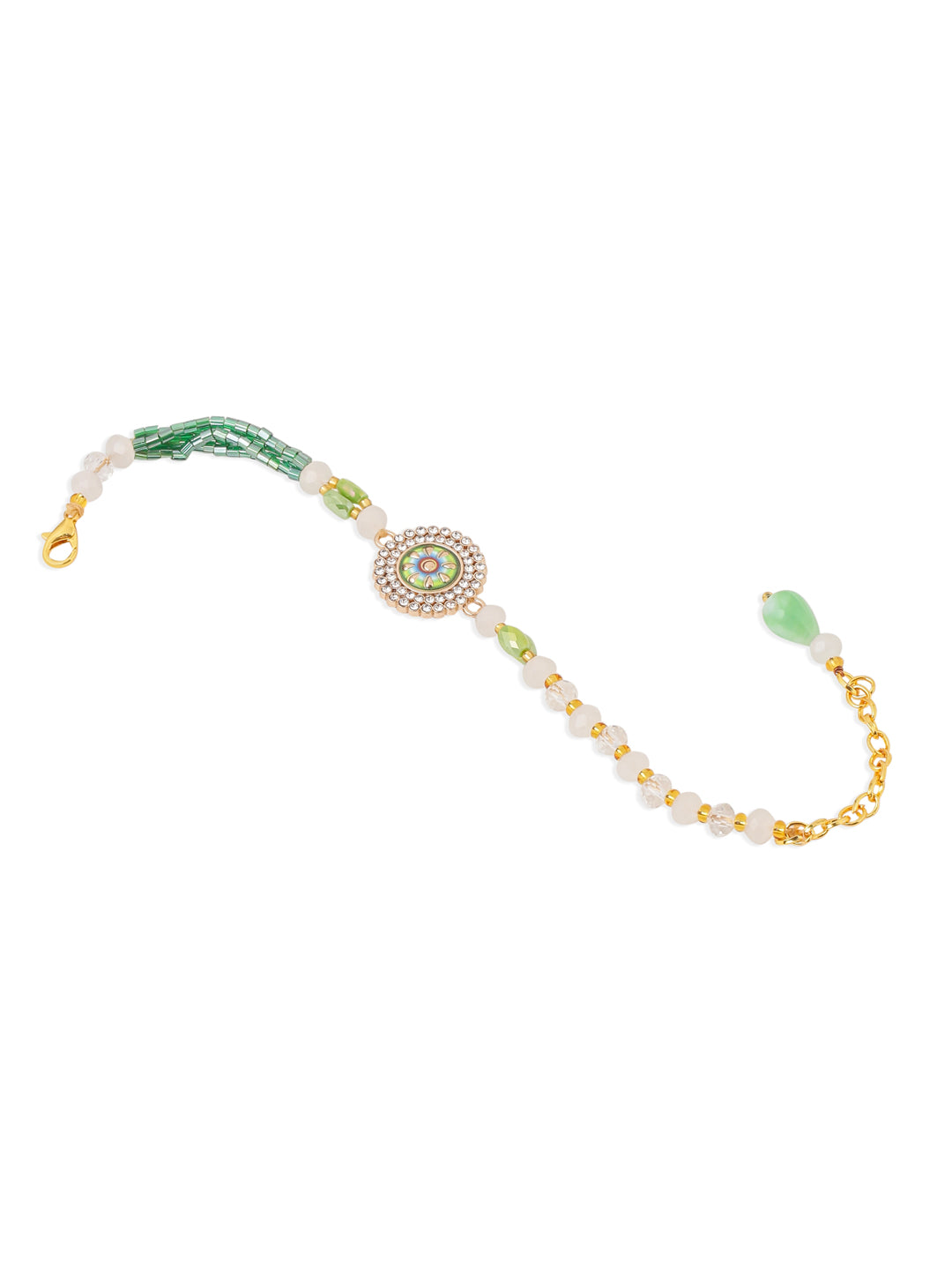 Style Note: Celebrate Raksha Bandhan With The Nvr Women Green Artificial Stones & Beads Floral Wraparound Rakhi, Designed For A Chic And Traditional Look. The Green Artificial Stones And Intricate Beads Form A Beautiful Floral Pattern That Wraps Gracefully Around The Wrist. Includes Roli, Chawal, Chandan & Mishri For Completing The Festive Ritual. A Perfect Gift To Show Your Love And Care For Your Sister.