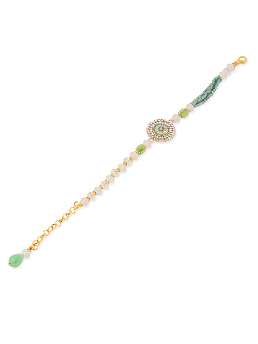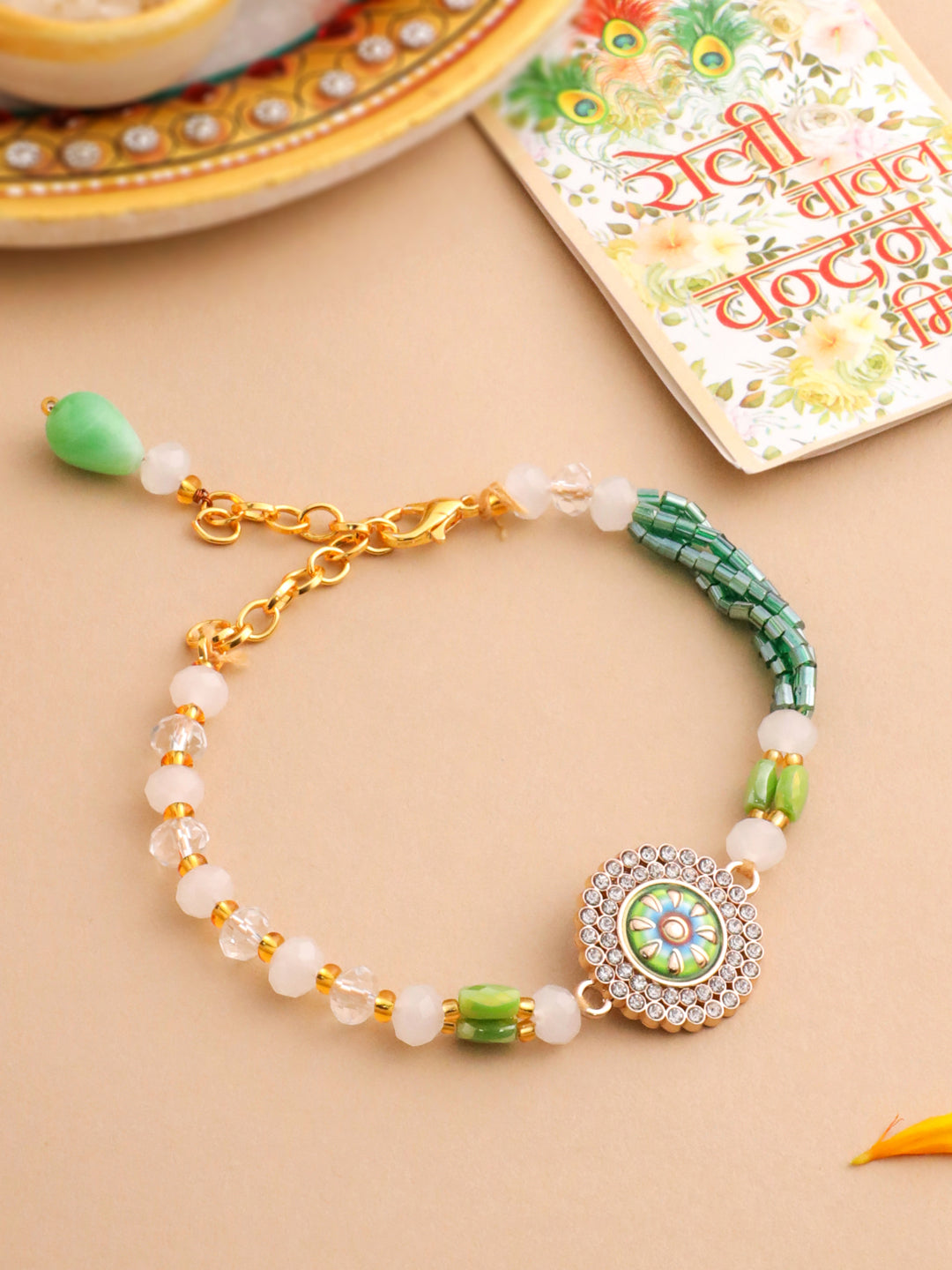 Men's Green Artificial Stones & Beads Floral Wraparound Rakhi With Roli Chawal Chandan & Mishri