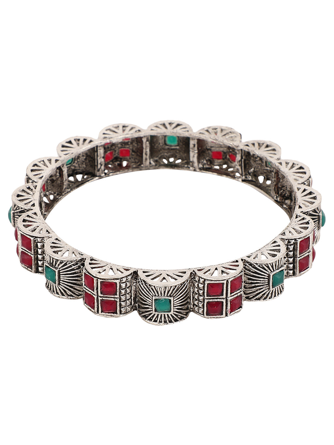 Set of 2 Silver Oxidised Curved Designed Red and Green Stone Studded Bangles , Easy to fit also availble as per size