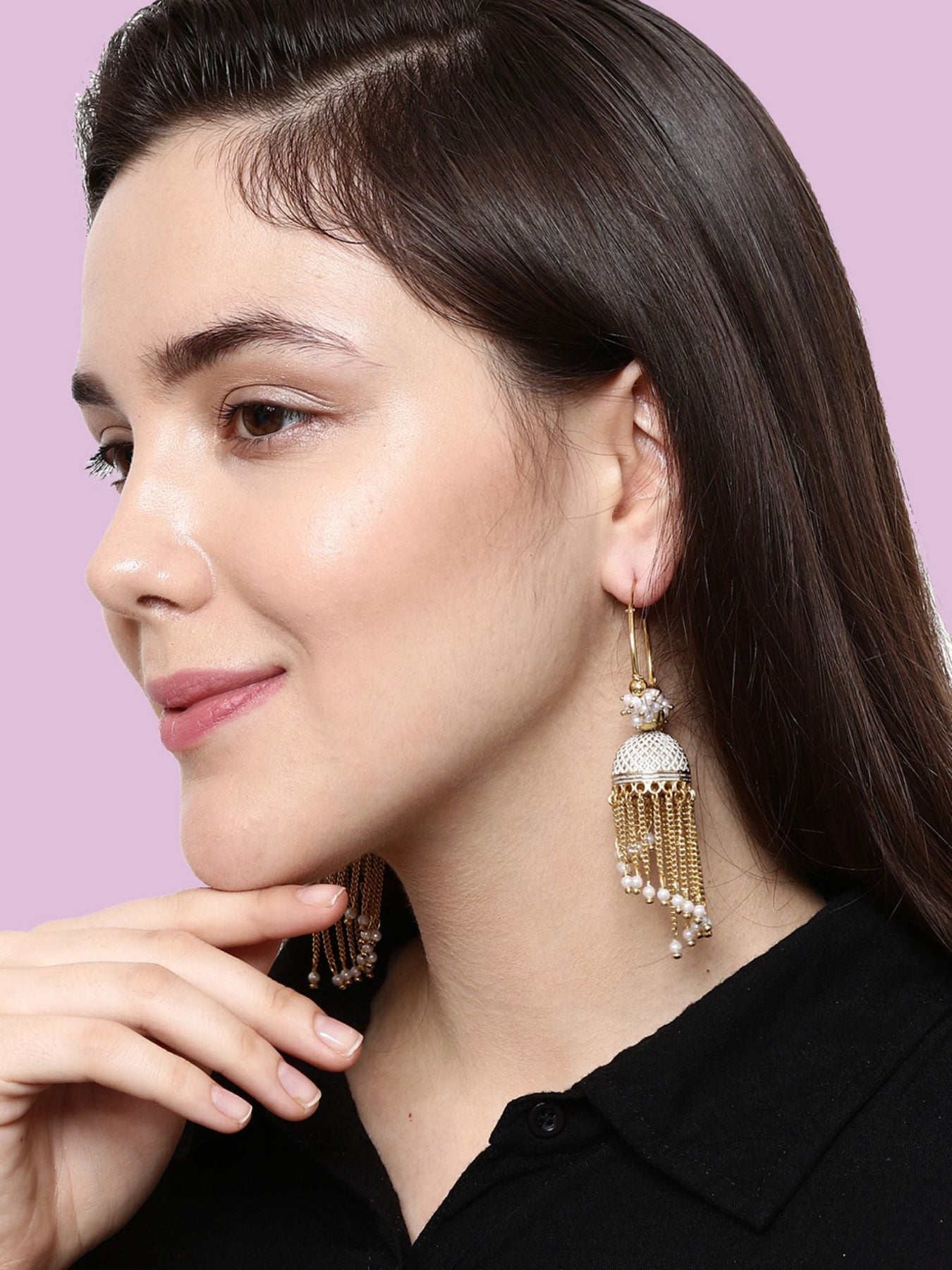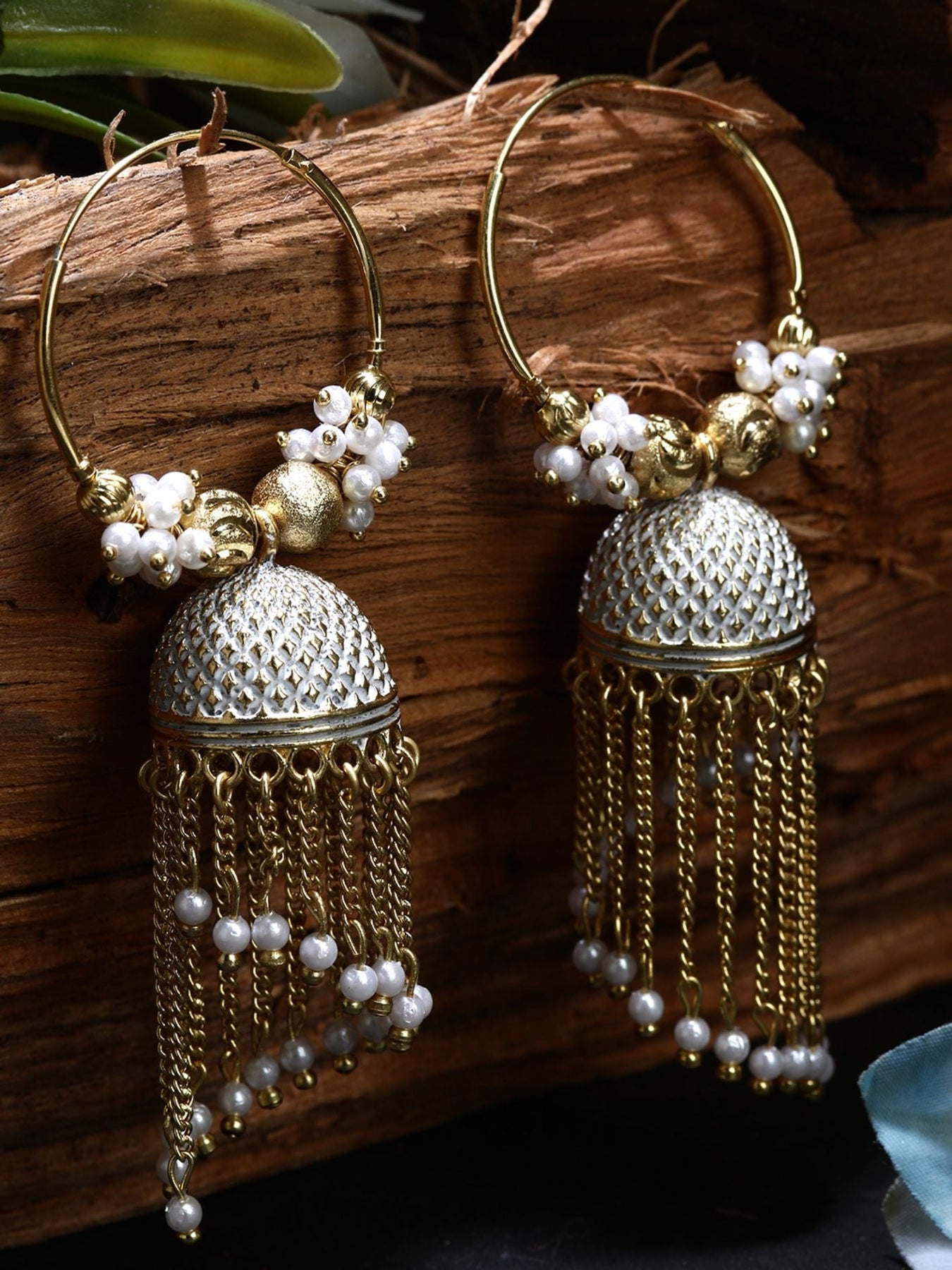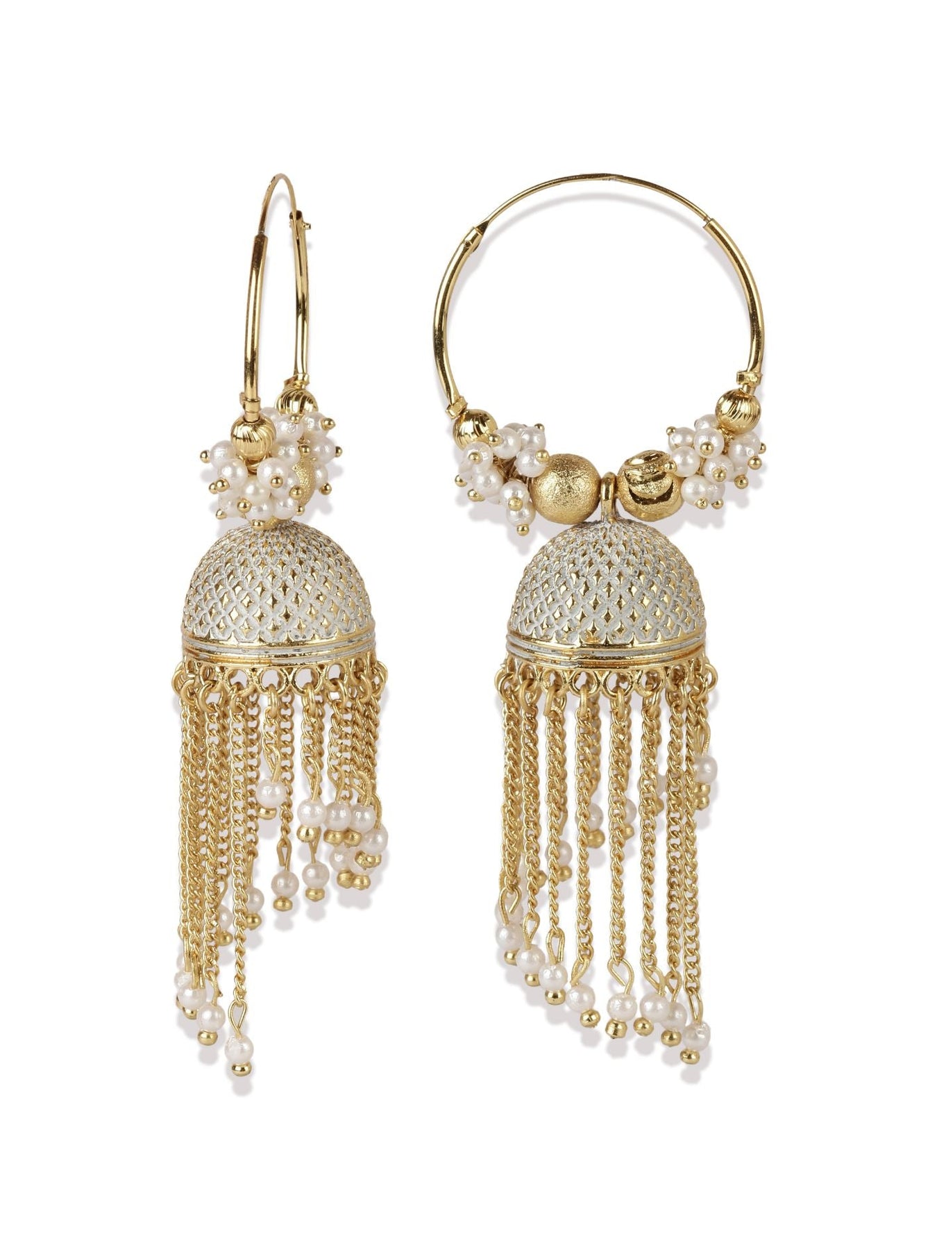 White & Gold-Plated Enamelled Dome Shaped Jhumkas Secured With Lever Back Closure, Details: Enamelled