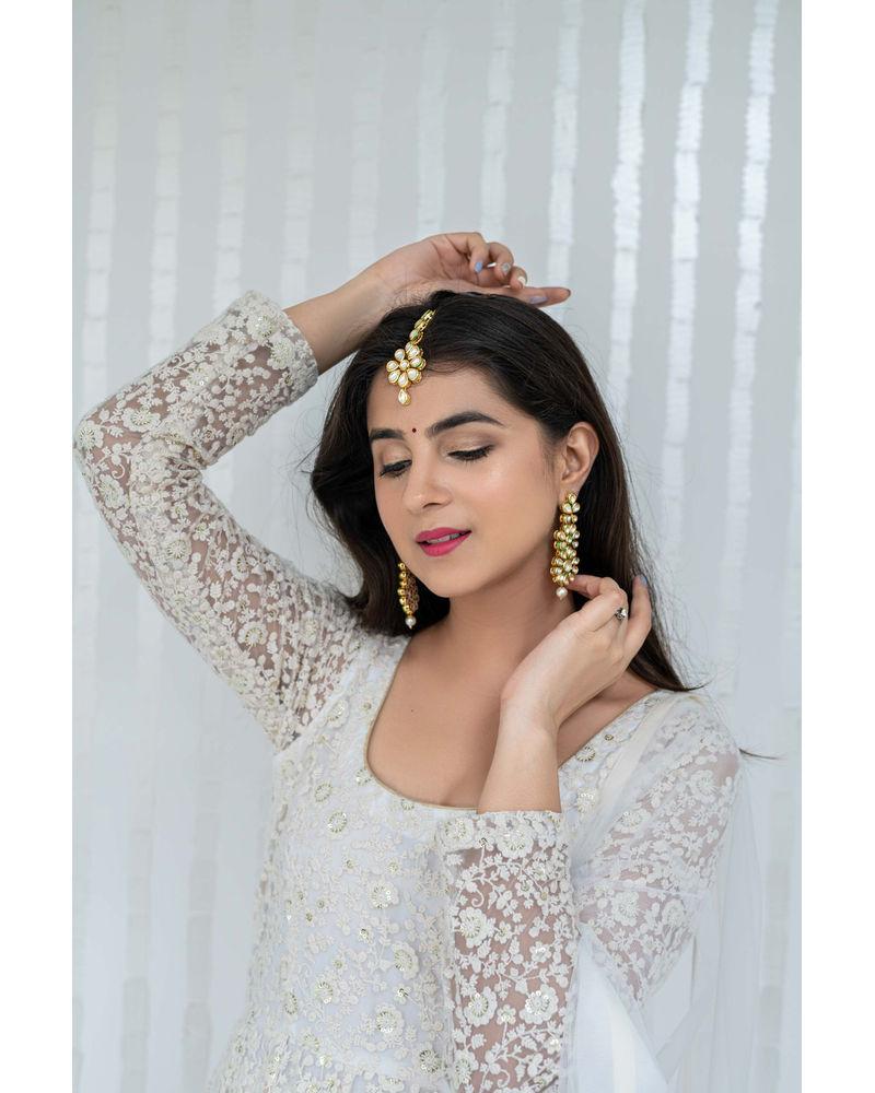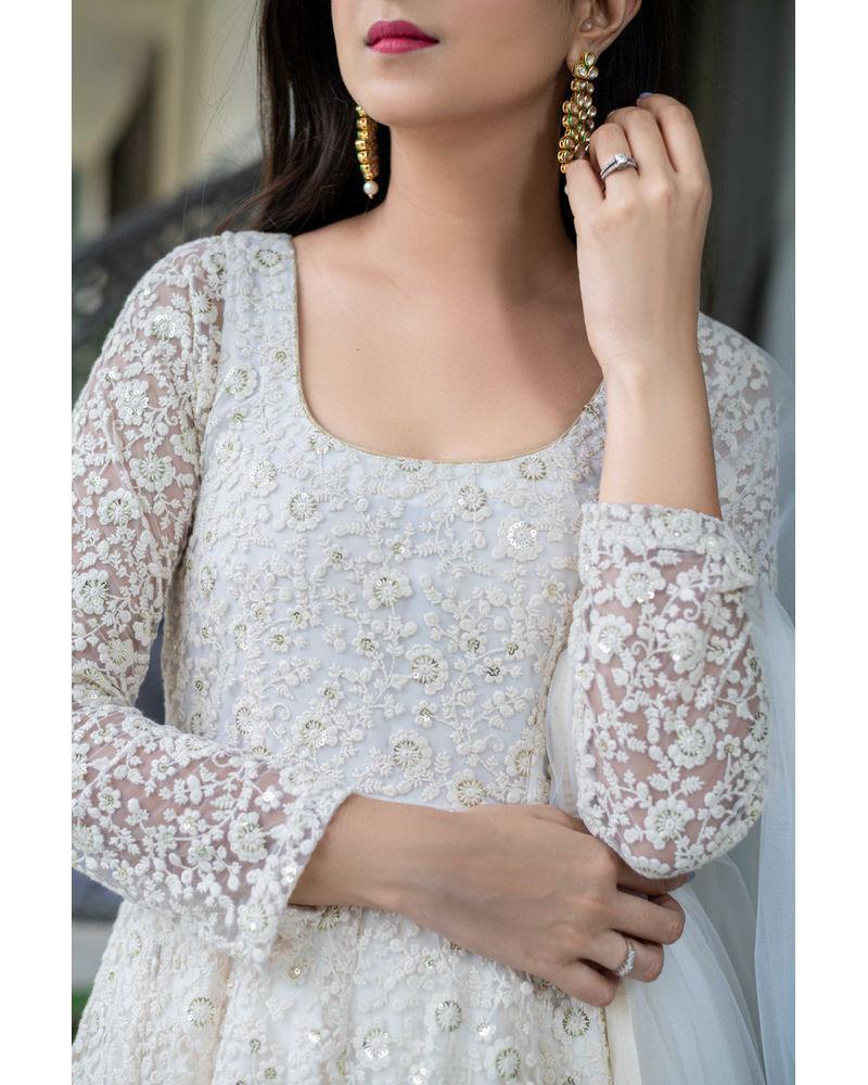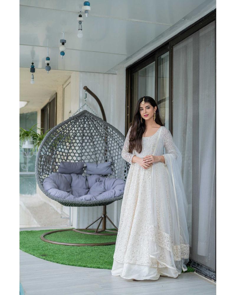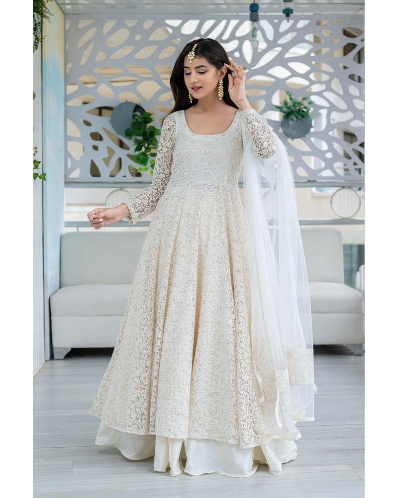 Trendia brings you this White Anarkali suit set with Skirt & Dupatta by the brand Label Shaurya Sanadhya. This round necked fitted dress with flared hem is at ankle length with White Chanderi cane-cane skirt. White Anarkali Kurta comes in Threadwork work & sequin work with White Dupatta in Net and threadwork. Accompanied by White Chanderi Skirt with elasticated slip on waistband work is simply a must have. The Anarkali Suit set comes with 3/4th sleeves style. Check out the photos of the product for a more detailed view.