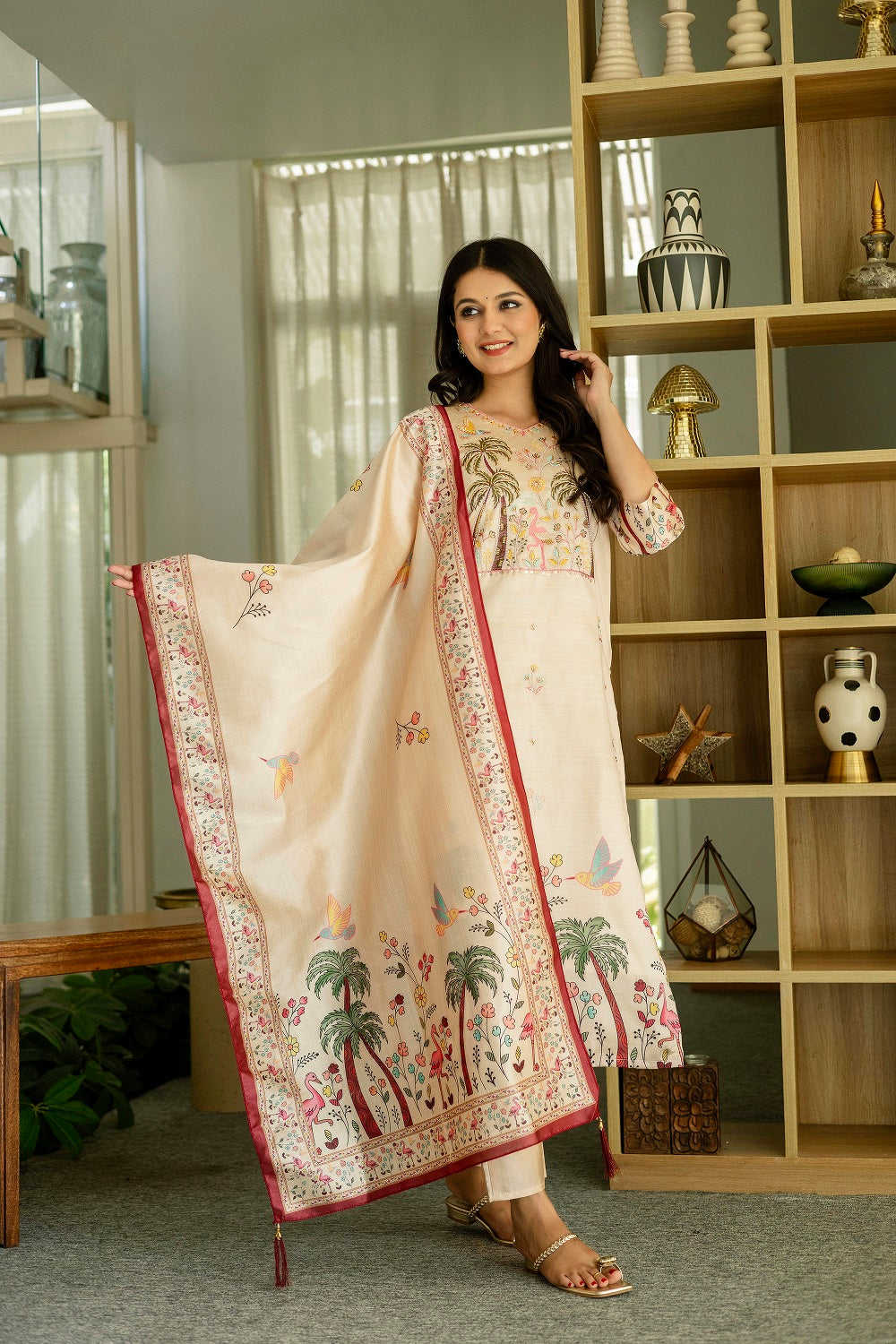 Party Wear Cream Embroidery Worked Kurta With Pant And Duppata Set