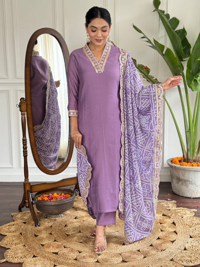 Women's Violet Viscose Chanderi Embroidery Kurta Set - Dwija Fashion