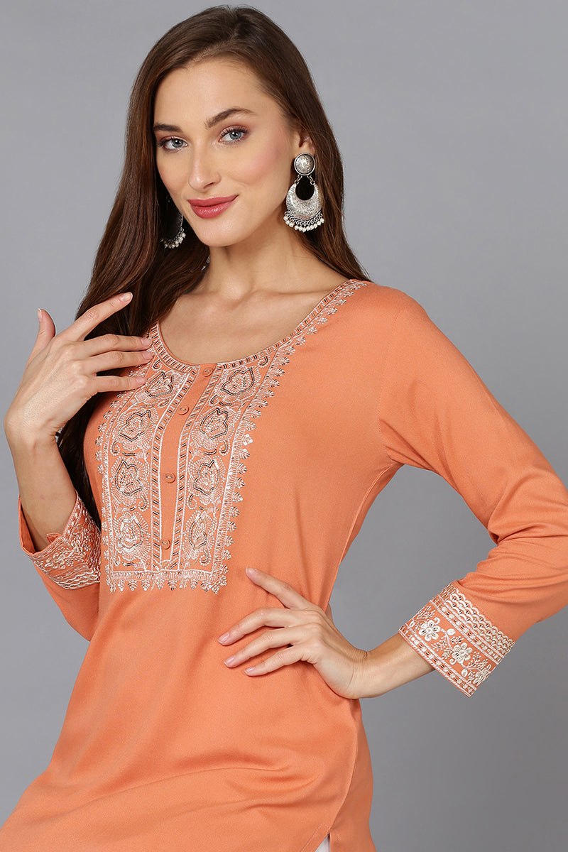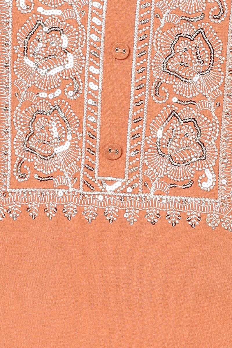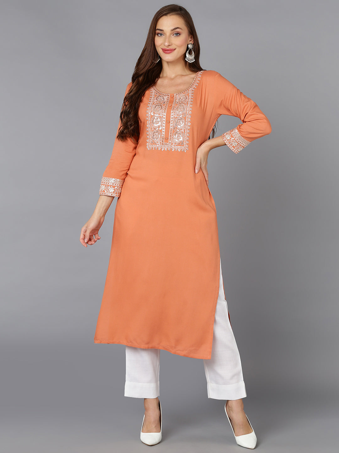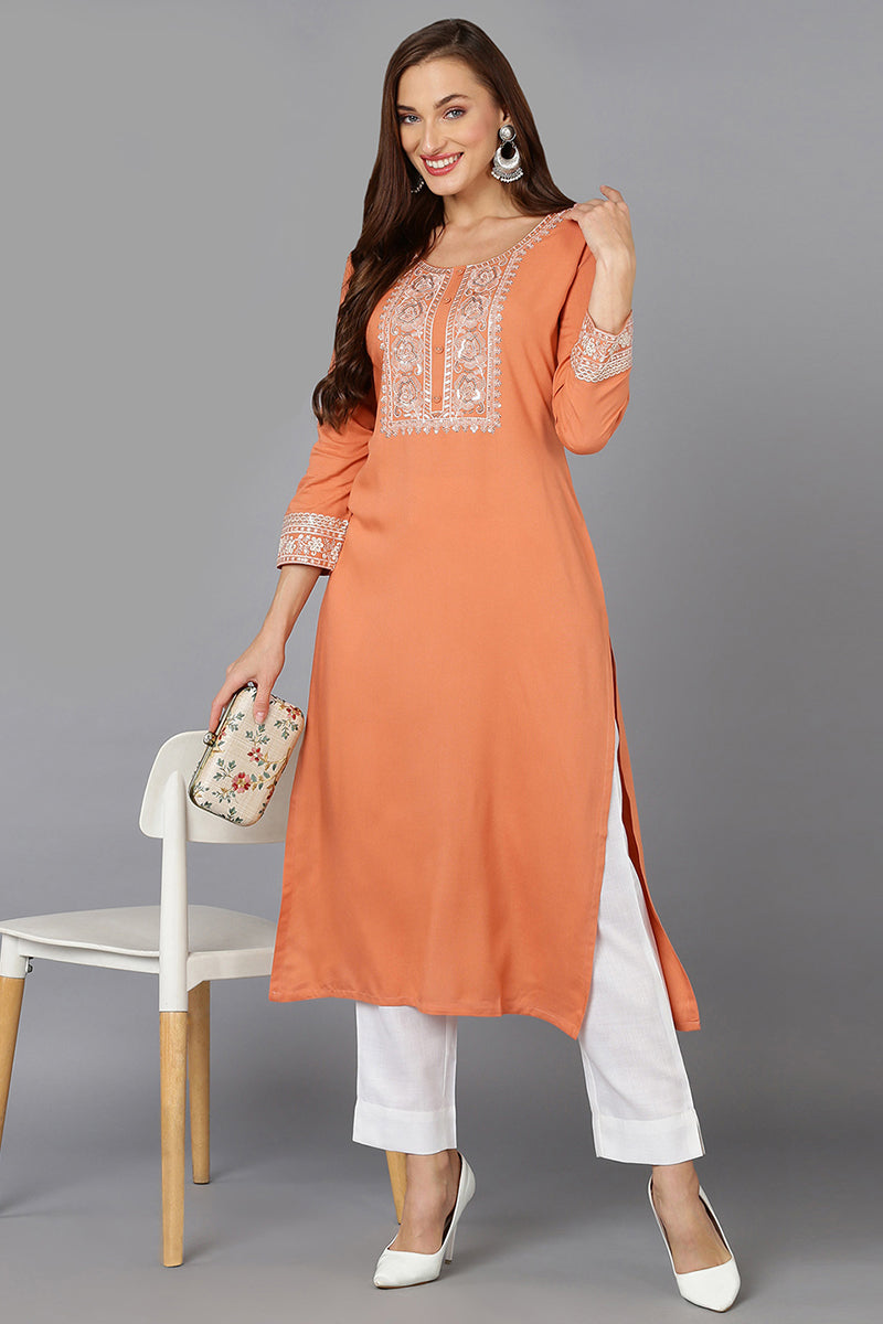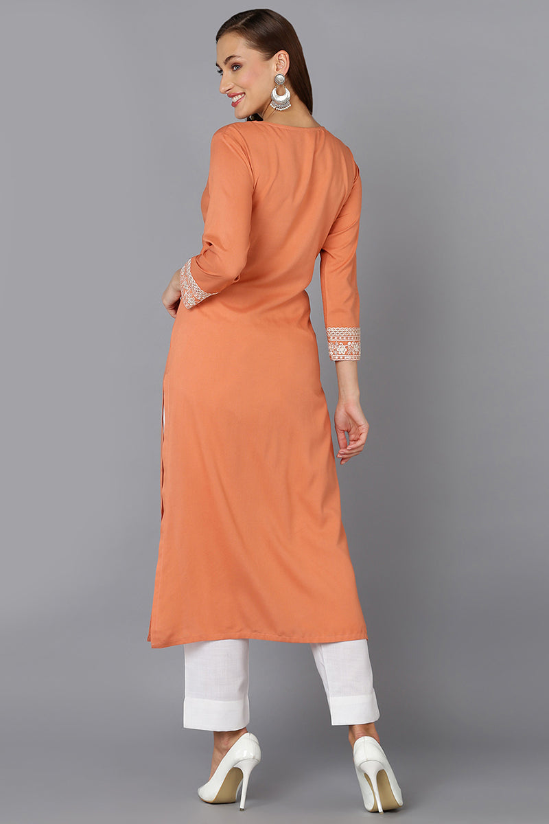 Dress Up In This Trending Coral-Peach-Colored Kurta Constructed From Viscose Rayon Fabric. It Is Framed With A Round Embroidered Neckline Decorated With Frontal Potli Buttons. It Consists Of Three-Quarter Sleeves, A Staright Hemline And Comfy Side Slits.