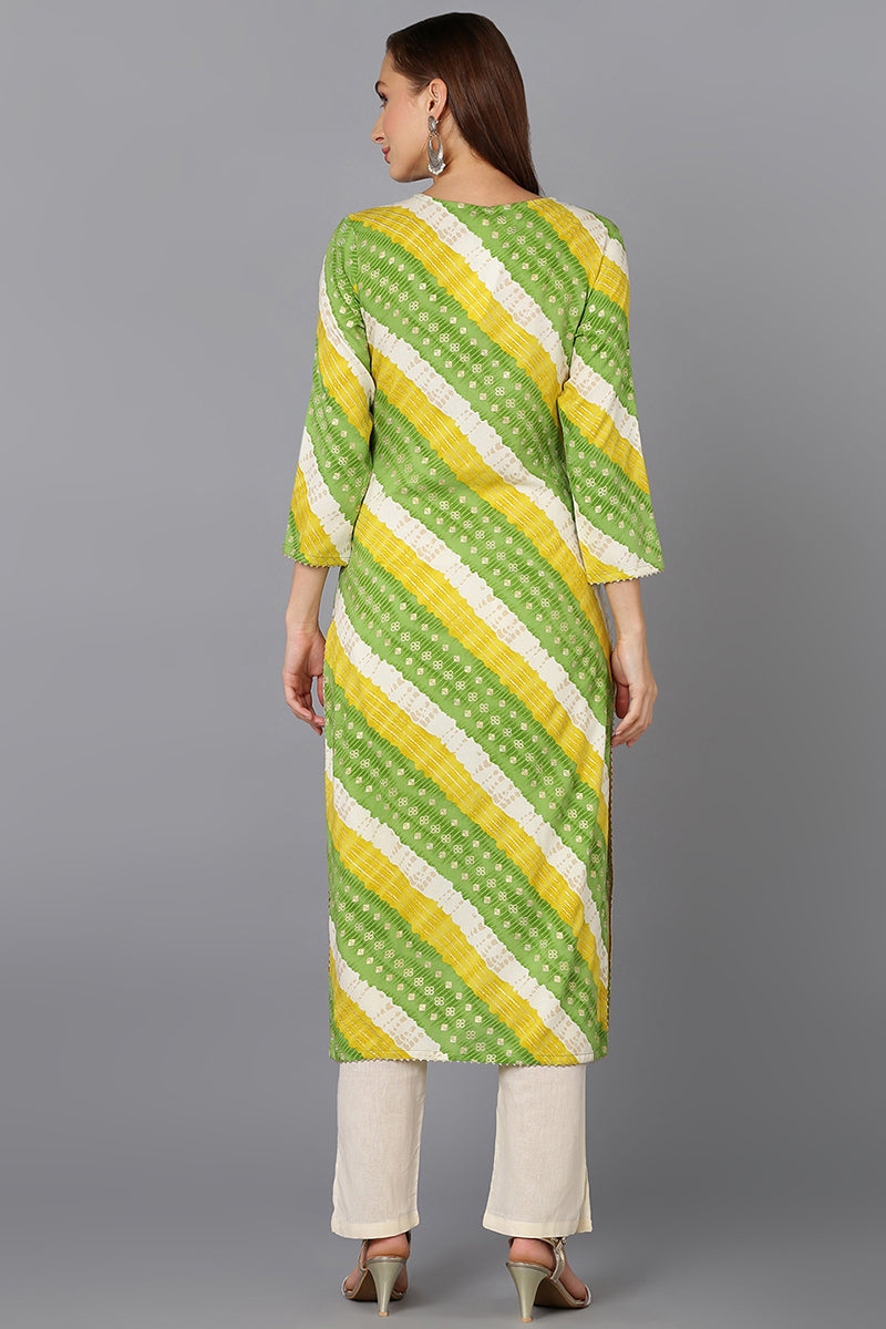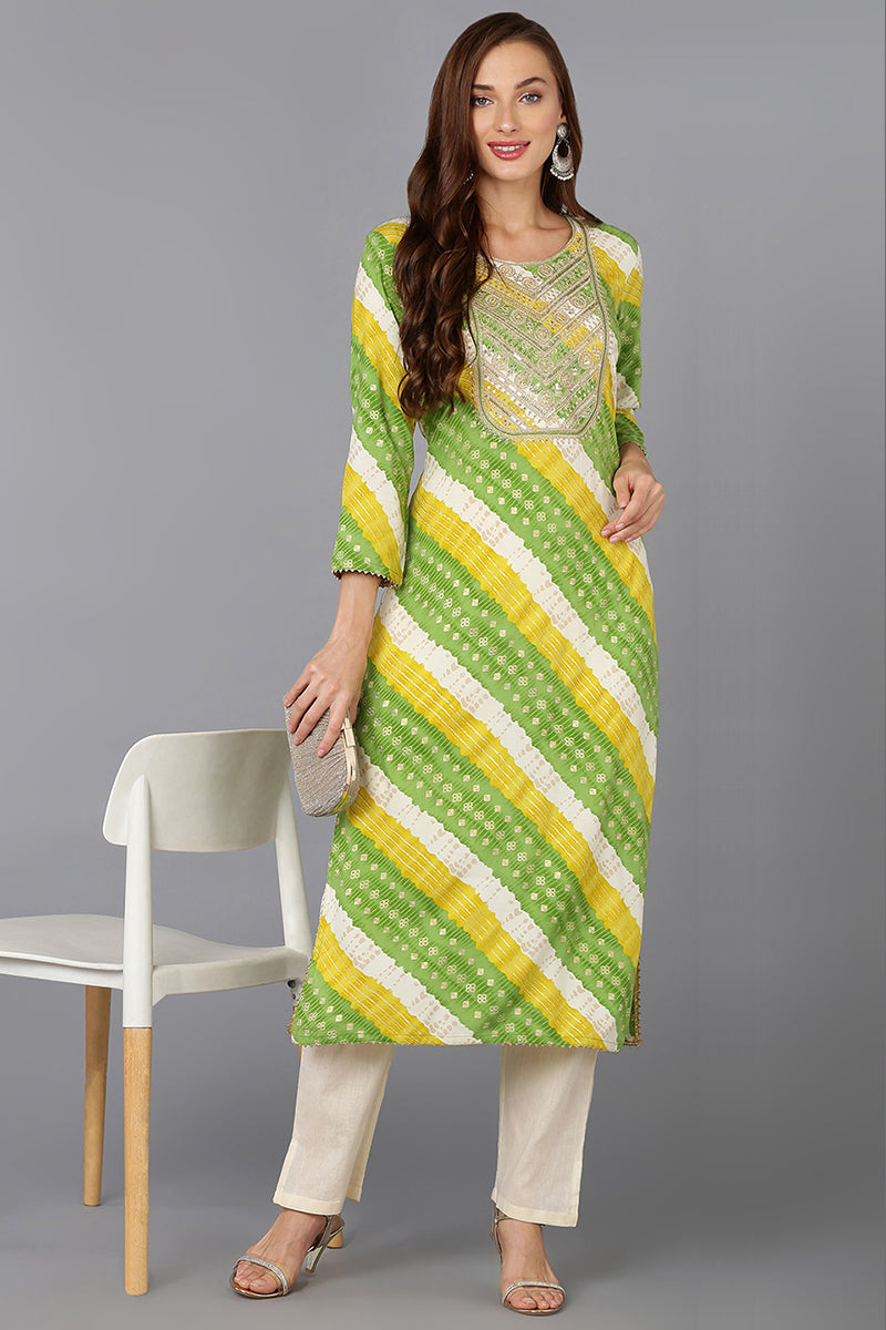Add A Pop Of Color To Your Closet With This Versatile Multicolored Kurta. It Is Crafted From Soft And Breathable Cotton Blend Fabric And Consists Of A Round Embroidered Neckline And The Yoke Adorned With Gota Patti Lace. It Has Three-Quarter Sleeves Decorated With Gota Patti Lace, A Regular Fit Hemline And Comfy Side Slits.
