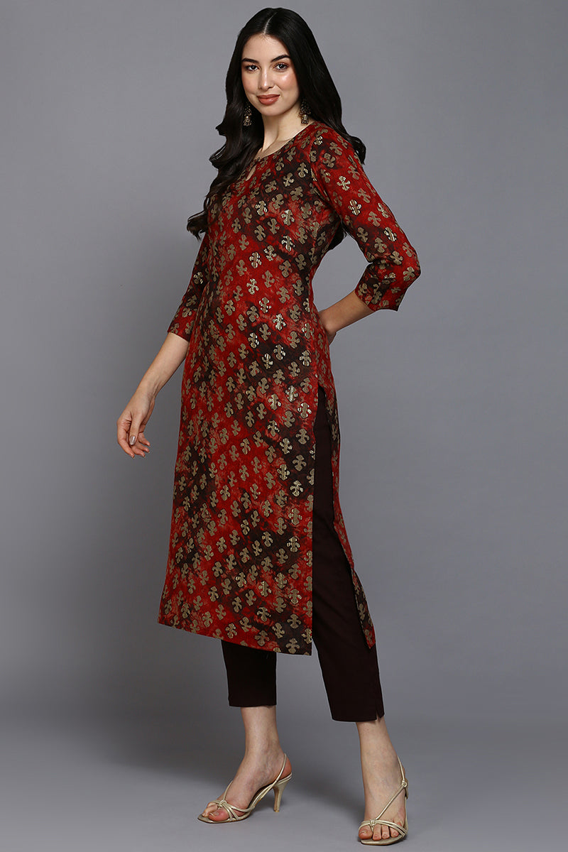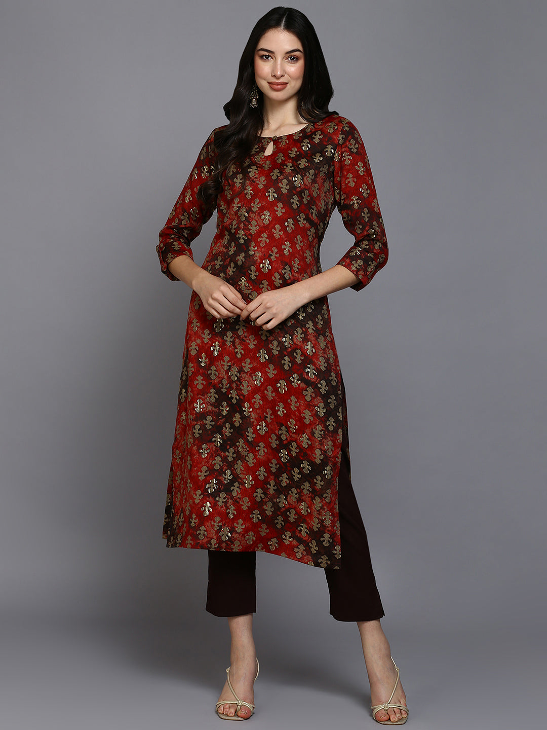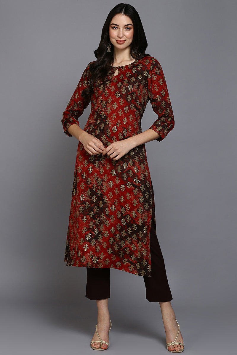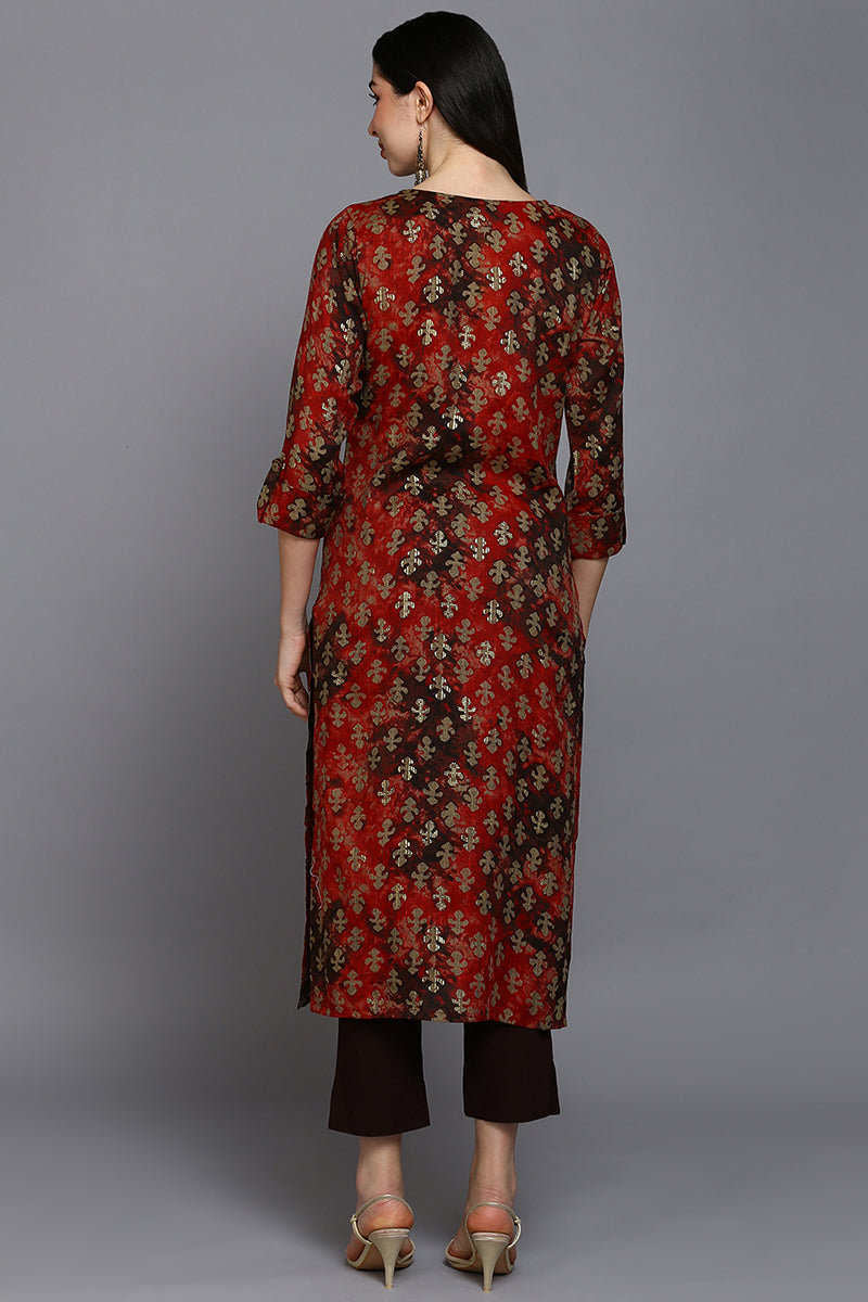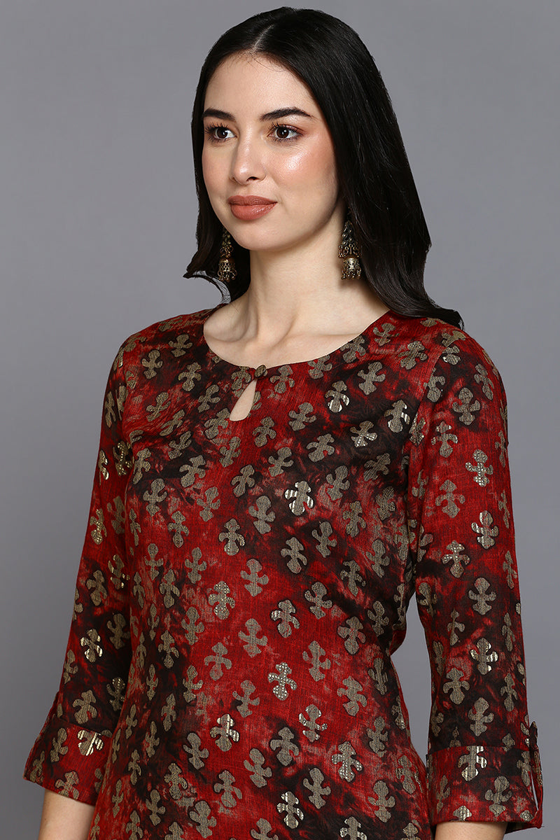 Beat The Monotony Of Broing Outfits With This Red Colored Printed Dress Knitted From Soft And Breathable Silk Blend Fabric. It Features A Keyhole Neckline And Three-Quarter Roll Up Sleeves. The Kurta Has A Regular Fit Hemline And Side Slits For A Gracefully Charming Appearance.