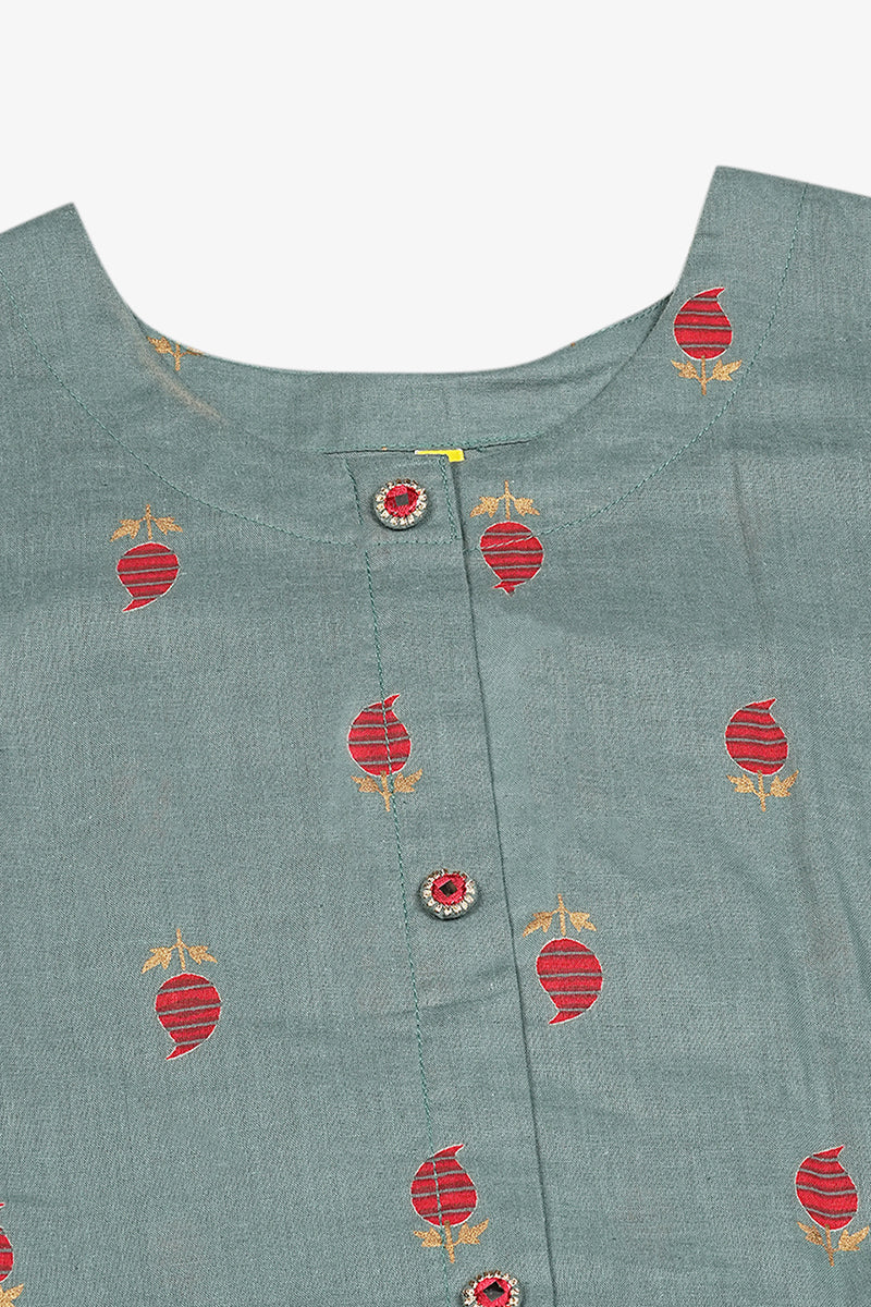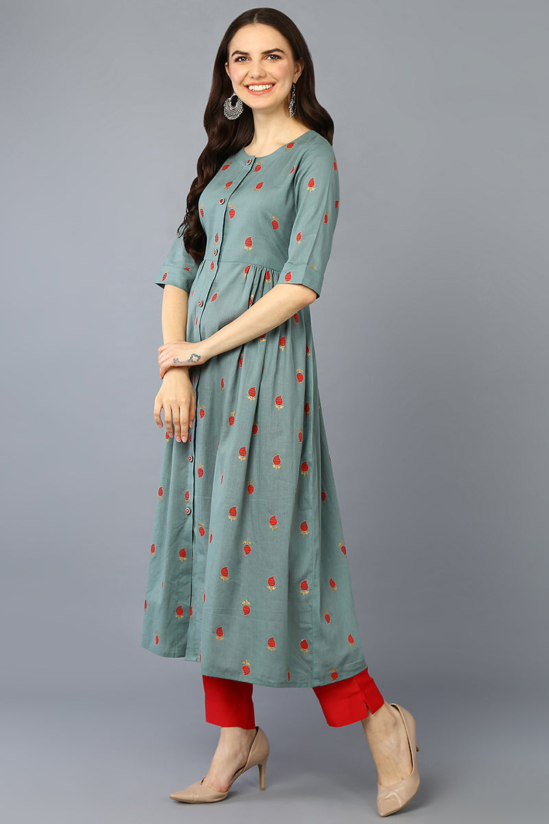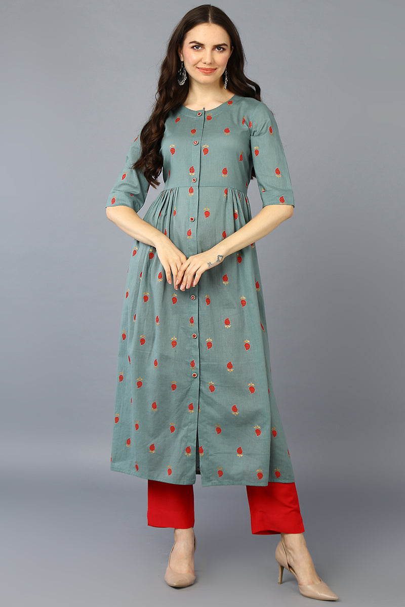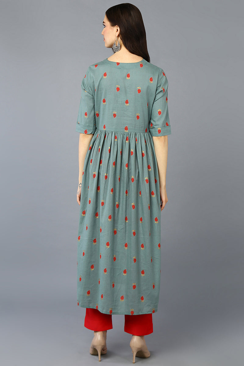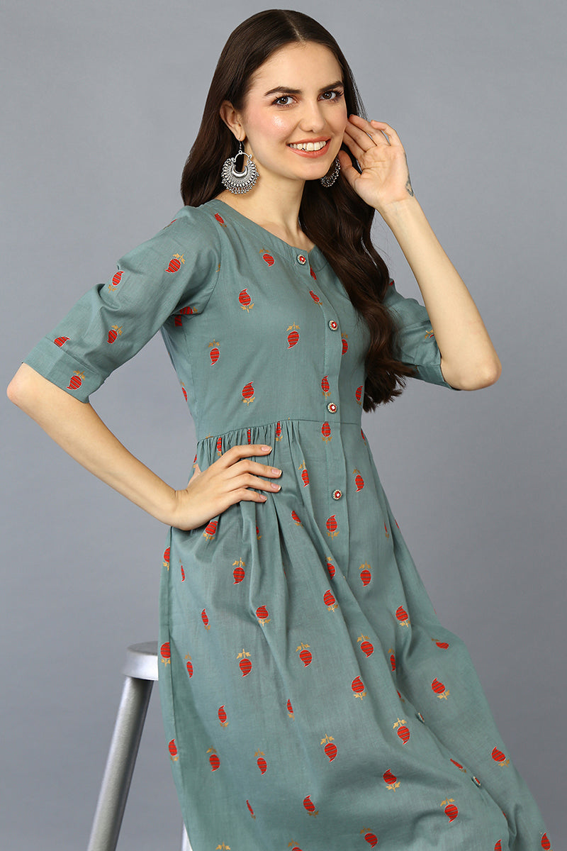 Upgrade Your Attire With This Captivating Green Colored Kurta Crafted From Finest Quality Cotton Fabric. This Ethnic Motif Printed Kurta Features A Round Neckline And Elbow Length Sleeves. It Is Adorned With Frontal Buttons And A Gracefully Flared Hemline Forms Beautiful Pleats.