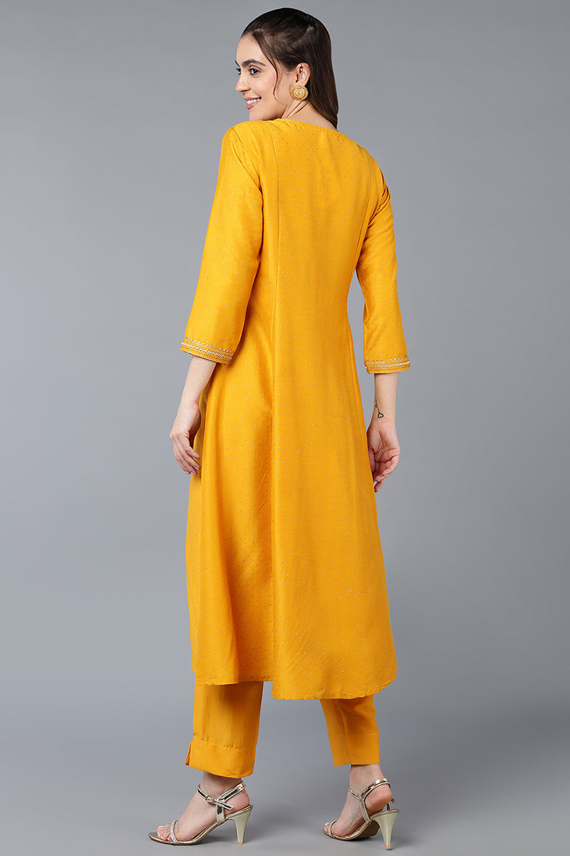 Elevate The Ambiance By Sporting This Mesmerizing Dress Crafted From Soft And Breathable Silk Blend Fabric. This Yellow Colored Kurta Features A Fancy Embroidered Neckline And The Yoke Is Designed With Gota Patti Lace. It Consists Of Three-Quarter Sleeves And A Flared Hemline That Flows Gracefully.