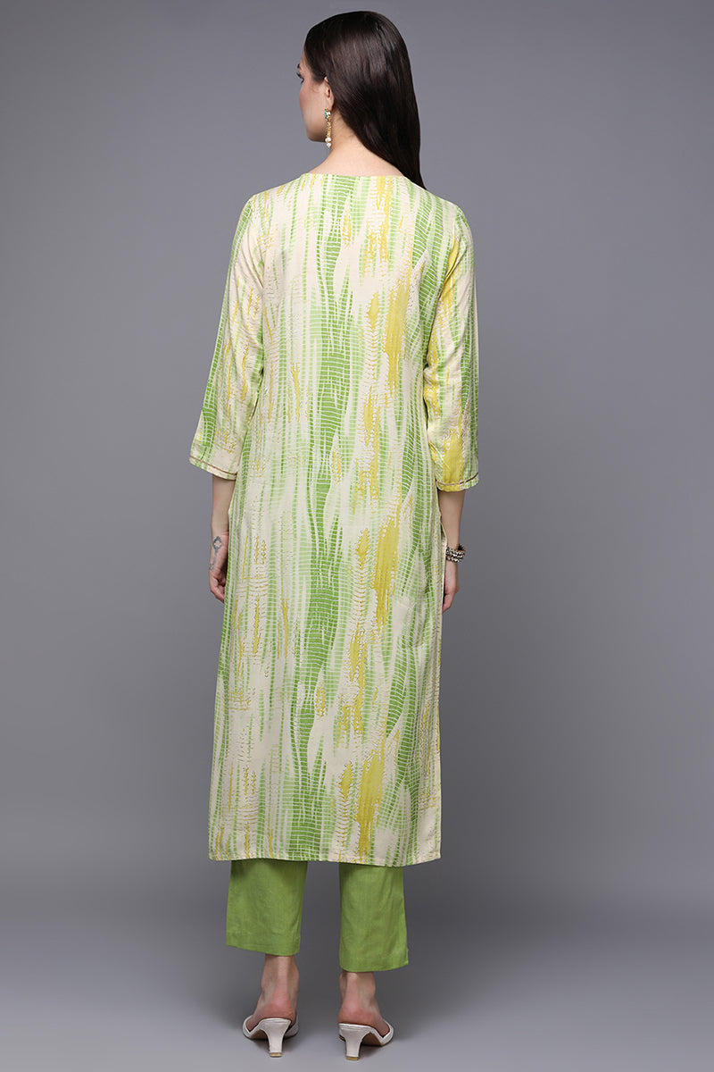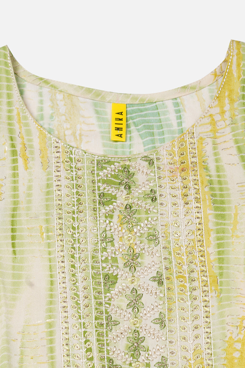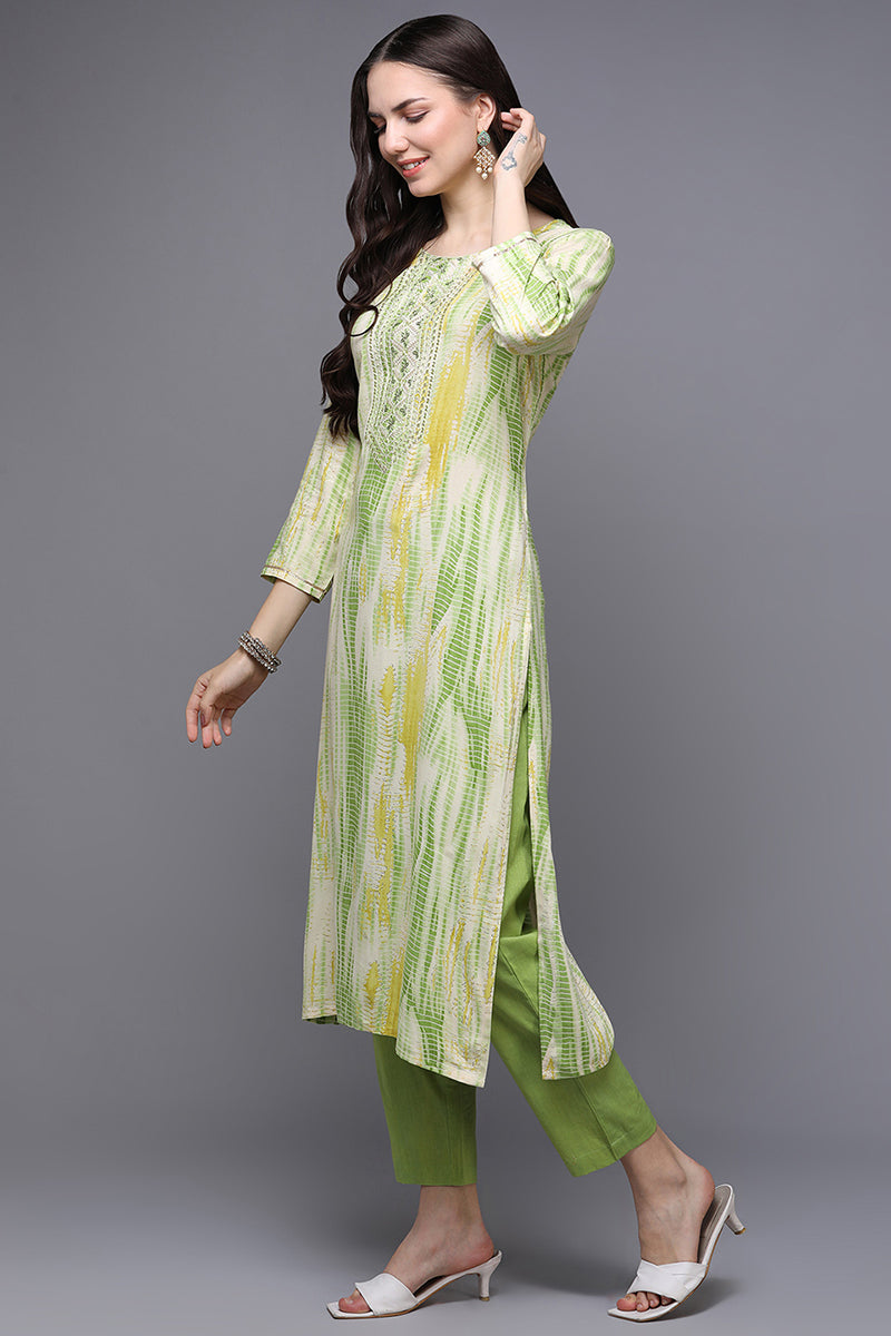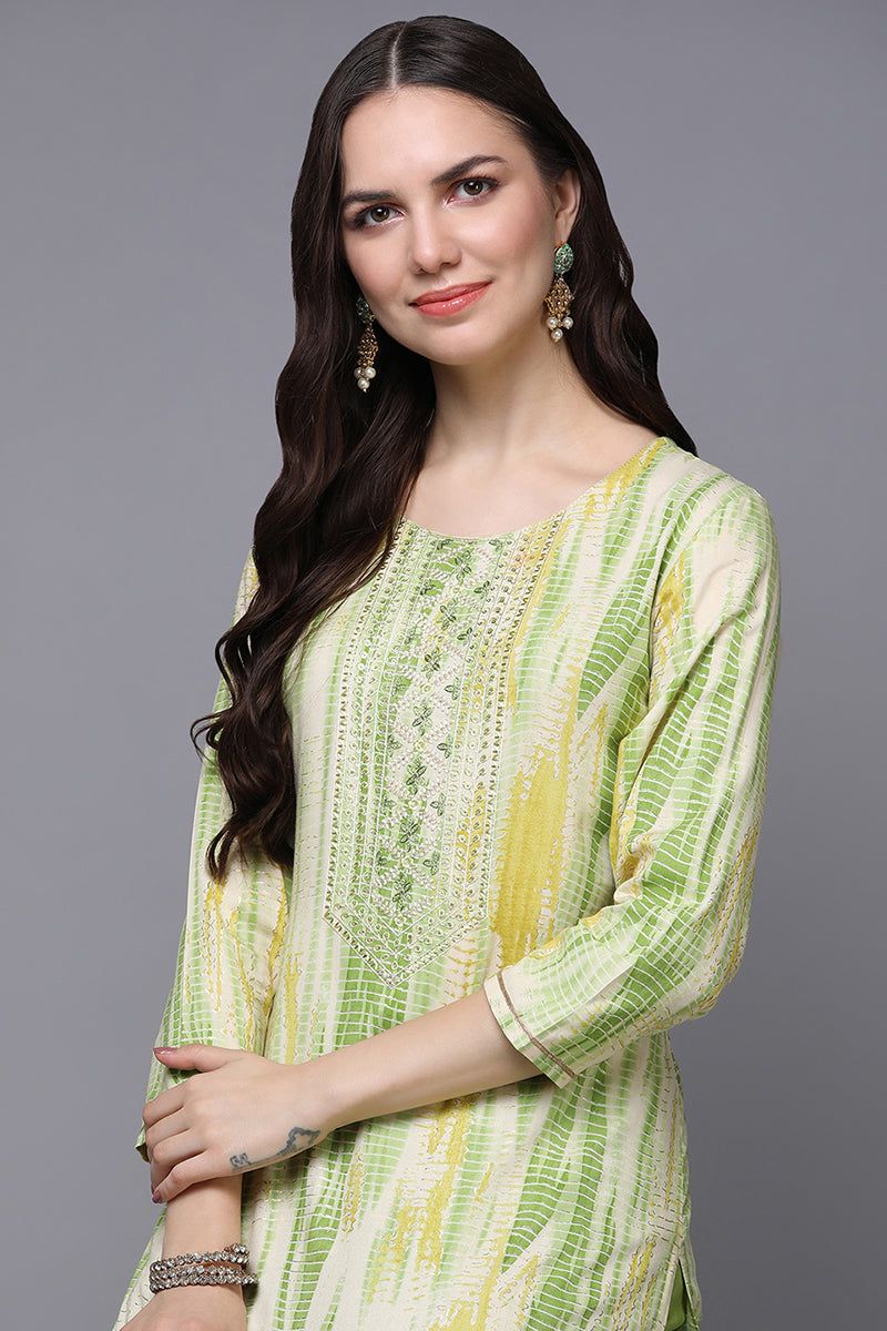 Cultivate A Gentle Look By Sporting This Cream Colored Kurta Made From Viscose Rayon Fabric. It Is Adorned With Tie Dye Prints And Features An Embroidered Neckline With Three-Quarter Sleeves. It Has A Regular Fit Hemline With Side Cutouts.
