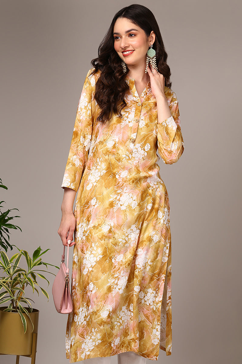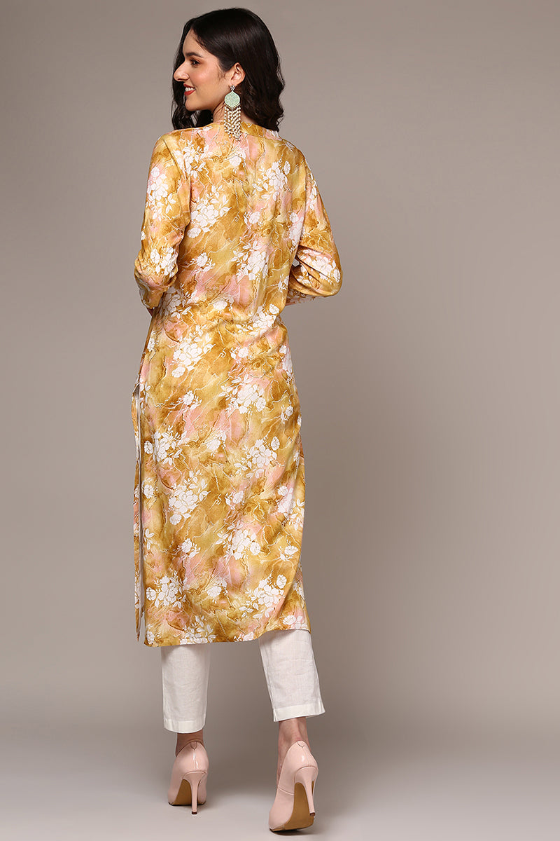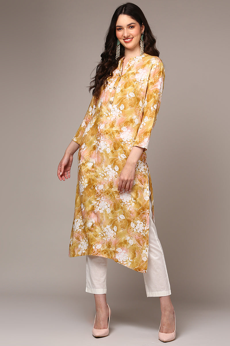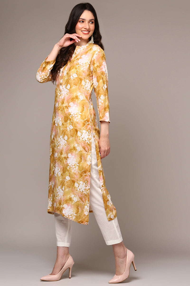 Invigorate In The Freshness Of This Yellow Colored Floral Printed Kurta Crafted From Viscose Rayon Fabric. The Kurta Features A Mandarin Collar With Frontal Buttons. It Has Three-Quarter Sleeves, A Regular Fit Hemline And Side Cutouts.
