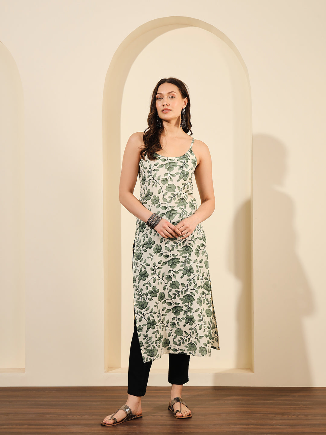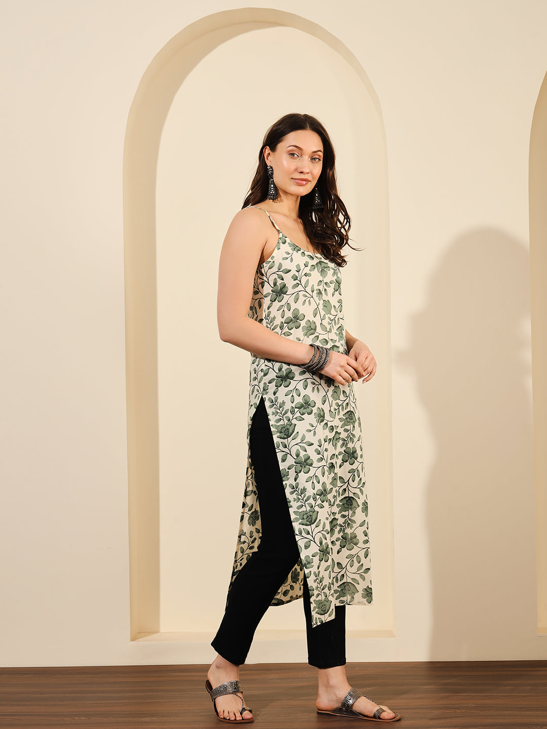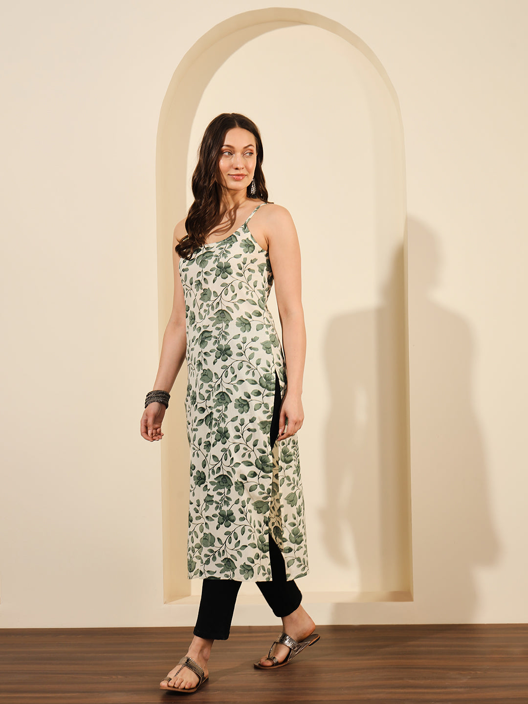 Green And White Floral Printed Spaghetti Calf Length Straight Kurta