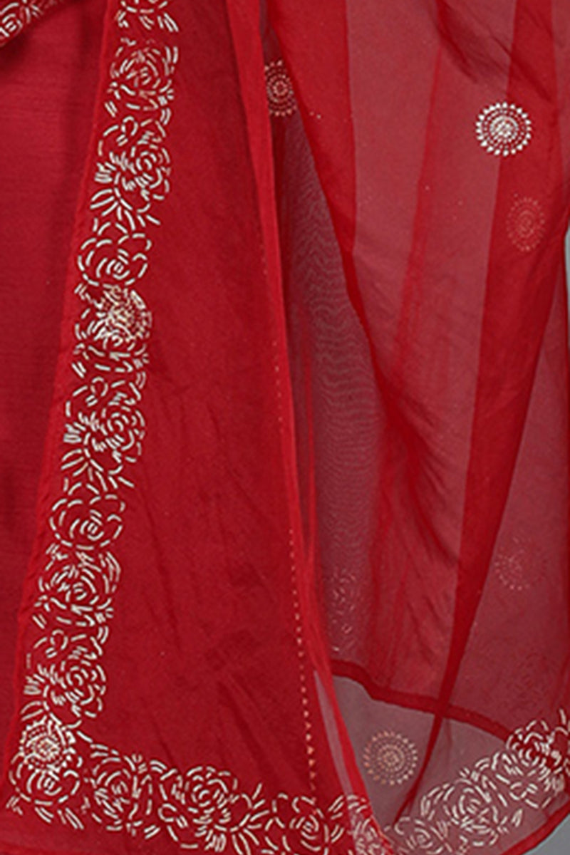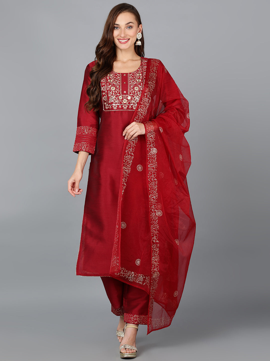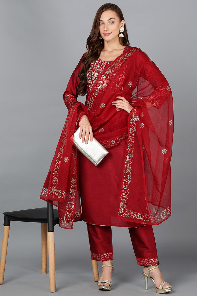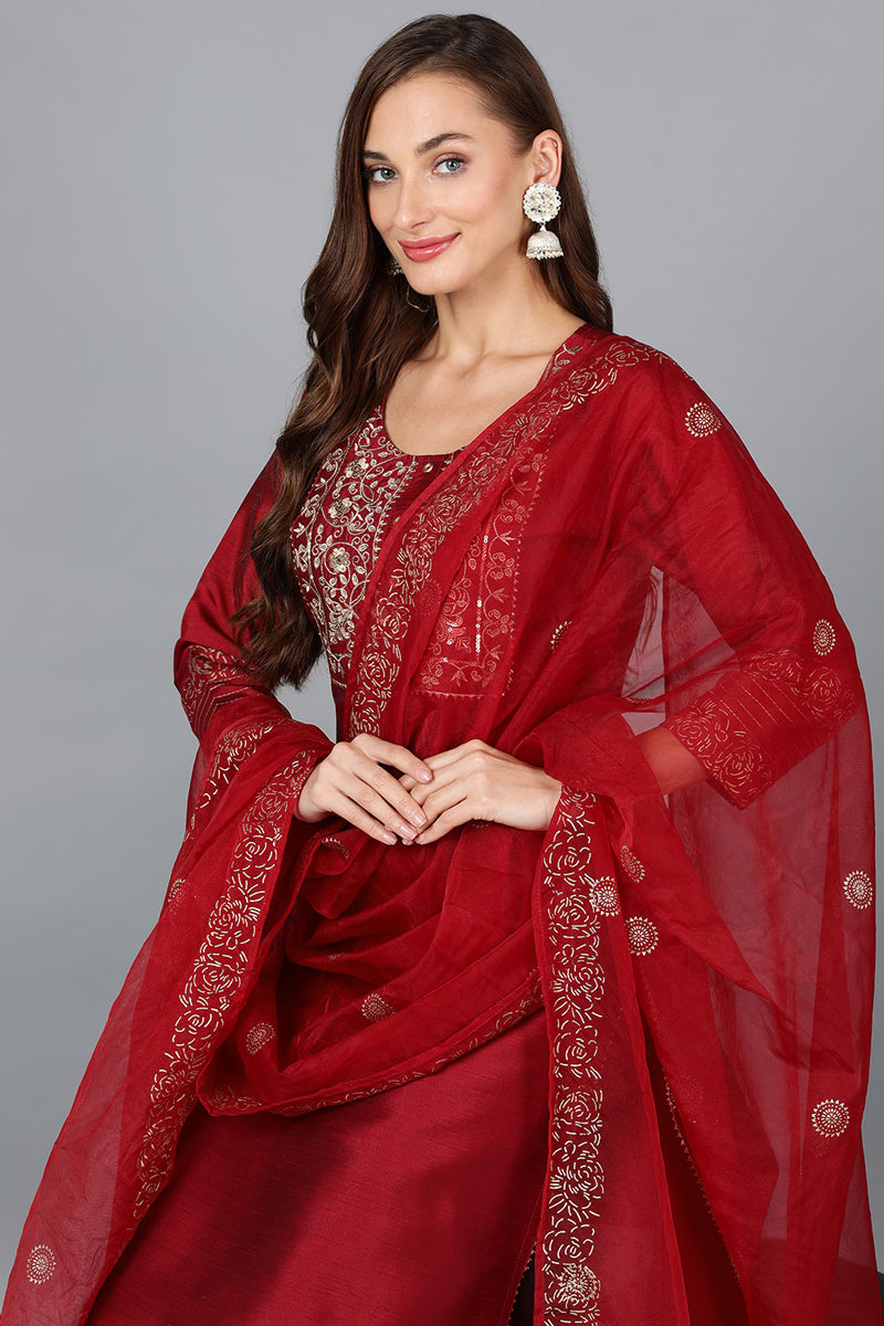 Own This Enticing Maroon-Colored Suit Set Crafted From The Finest Silk Blend Fabric. The Kurta Has An Embroidered Neckline Decorated With Frontal Buttons, Three-Quarter Sleeves, A Straight Hemline Adorned With Gota Patti Lace, And Comfy Side Slits. Paired With A Bottom Adorned With Rogan Work On The Hem And A Pocket For Carrying Stuff This Dress Is Perfect For Parties. The Dupatta Is Cut From Organza Fabric And Is Decorated With Rogan Work.