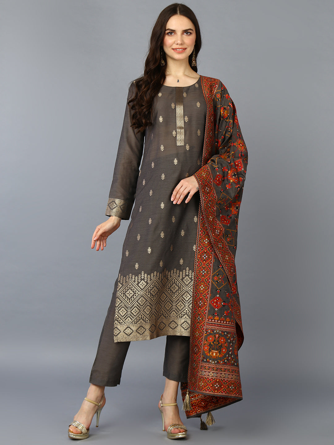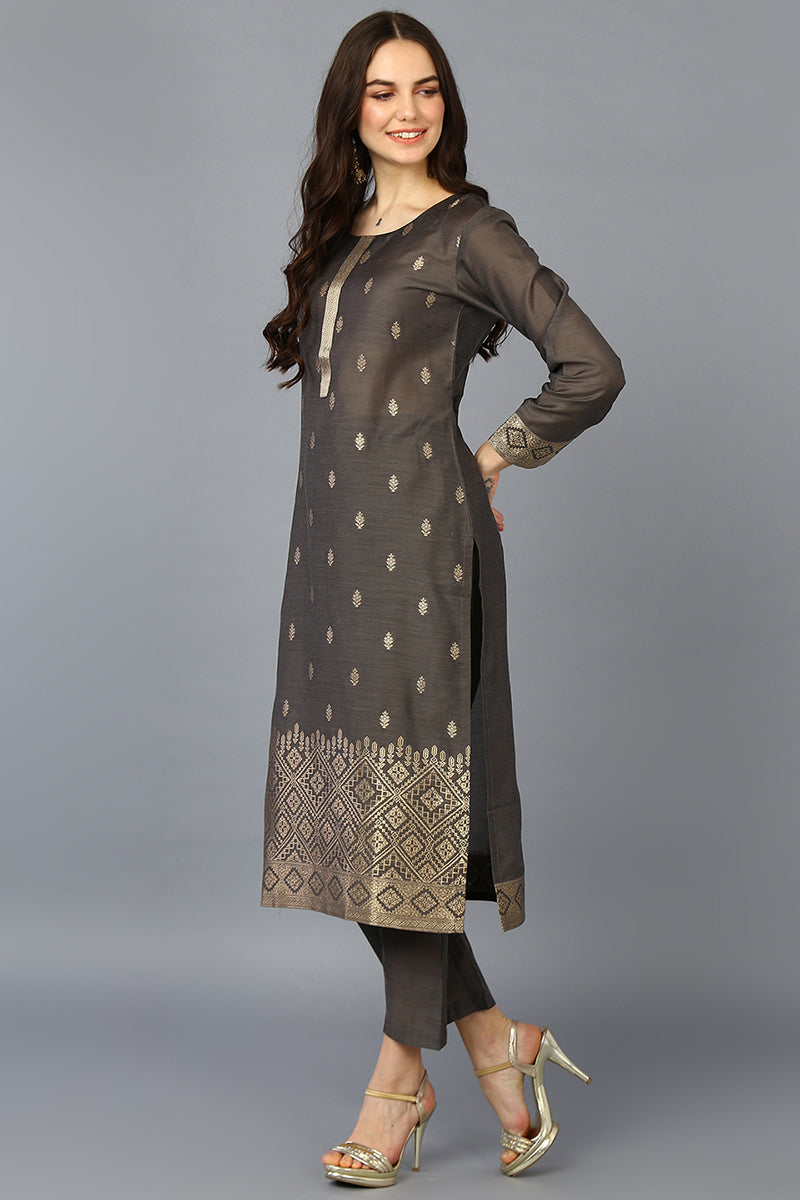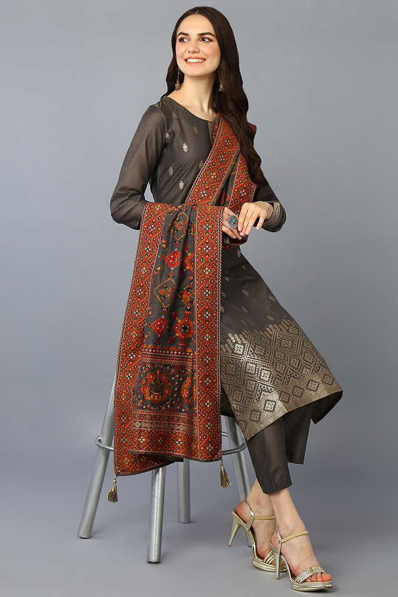 Create A Serene Vibe With This Grey Colored Soothing Dress Crafted From Silk Blend Fabric. The Kurta Features A Round Neckline With Three-Quarter Sleeves Festooned With Jacquard Work. It Has A Regular Hemline Decorated With Jacquard Work And Side Cutouts For A Comfortable Feel. It Is Paired With A Straight Bottom Designed With A Pocket And A Half Elasticated Waistband. A Multicolored Printed Dupatta Adorned With Tassels Give Ou A Pleasing Look.