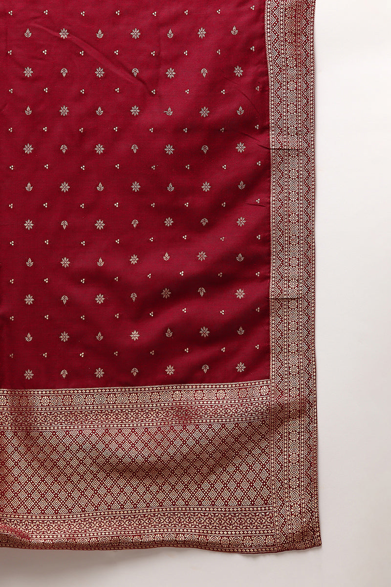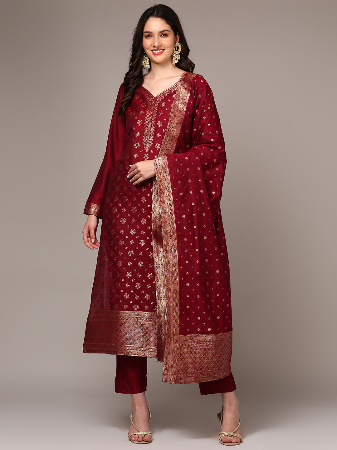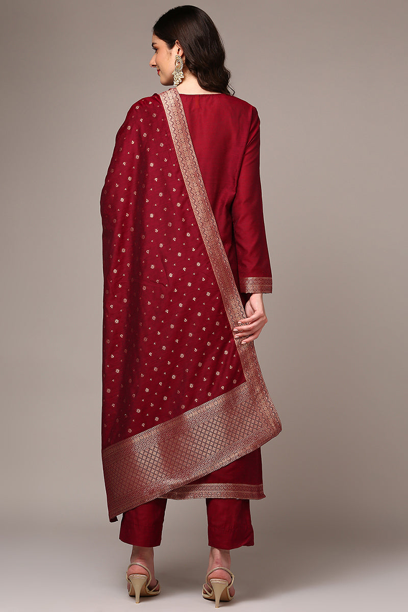 Craft Plush Looks By Adorning Yourself In This Maroon-Colored Suit Set Crafted From Silk Blend Fabric. The Jacquard Woven Kurta Features A Fancy Neckline With Full Sleeves. It Consists Of A Straight Hemline Festooned With Heavy Thread-Work And Has Side Cutouts. The Kurta Is Teamed Up With A Straight Bottom Designed With A Pocket And A Half Elasticated Waistband. A Jacquard Woven Dupatta Gives The Dress A Lavish Appearance.