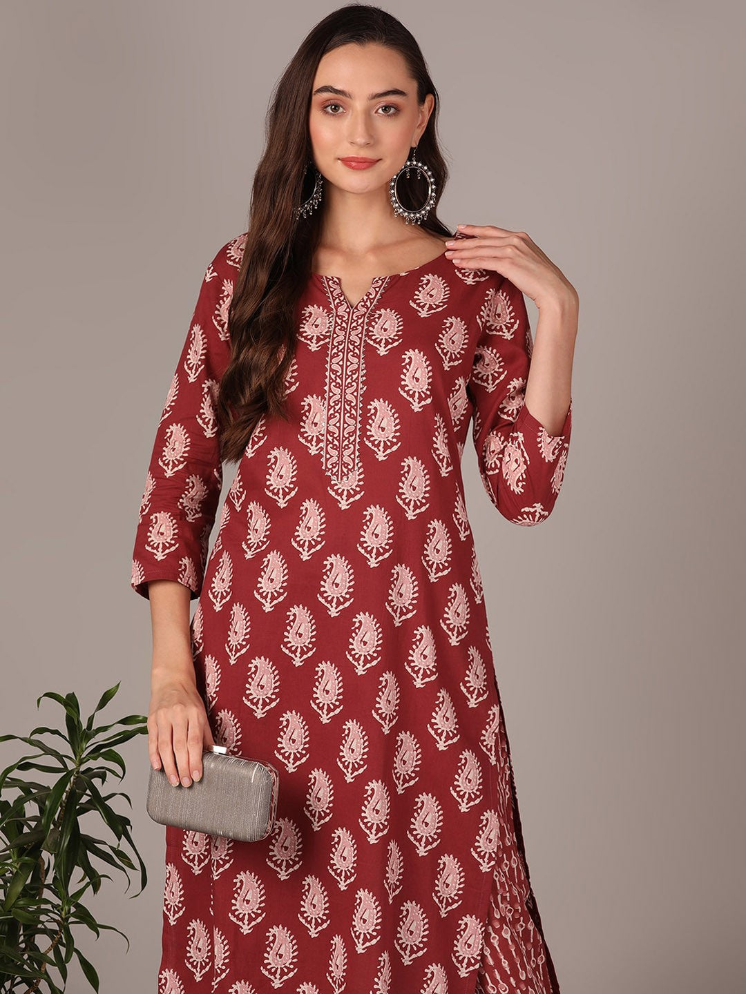 This Auburn-Colored Kurta With Pants Is Woven From The Finest Soft And Breathable Cotton Fabric. It Consists Of A Printed Kurta That Features A Fancy Neckline, Three-Quarter Sleeves, A Straight Hemline, And Comfy Side Slits. It Is Paired With A Straight, Printed Bottom Having A Pocket Which Gives It A Formal Look.