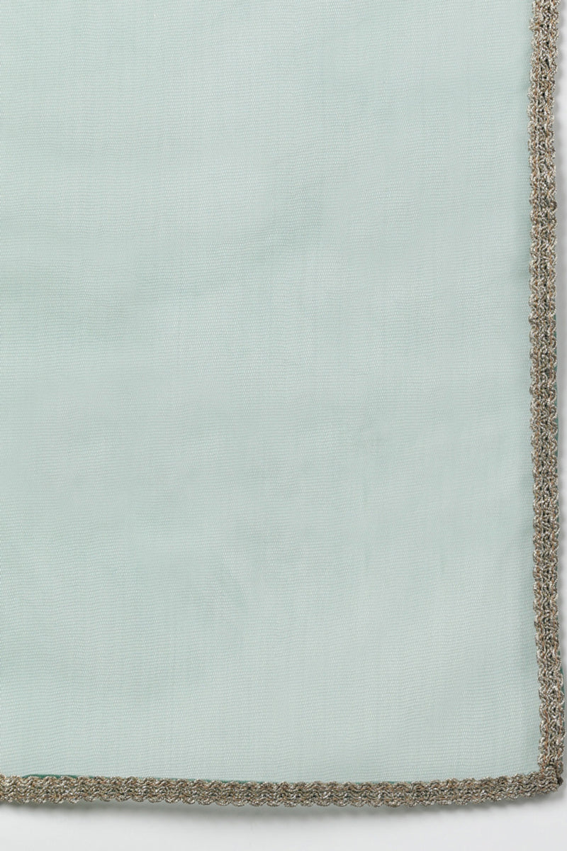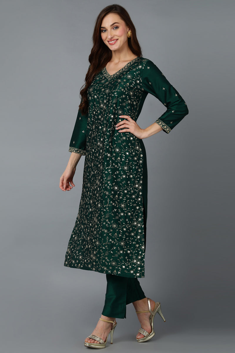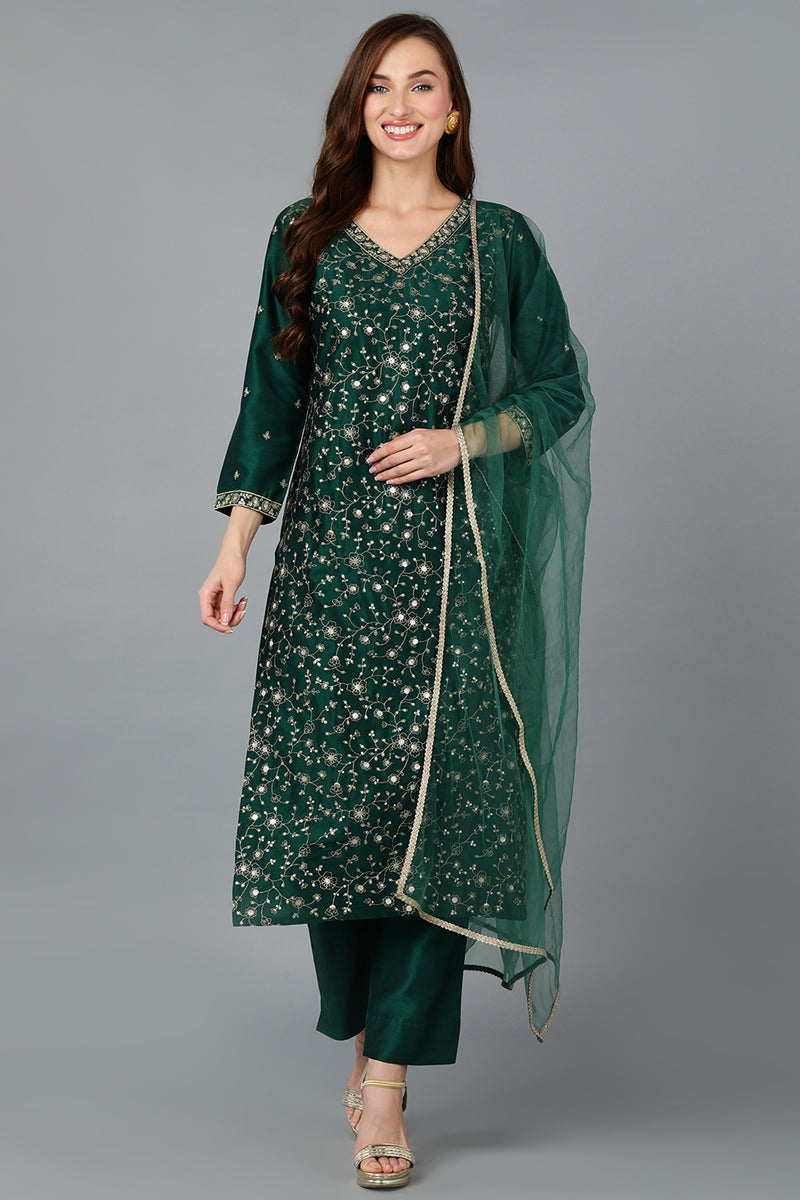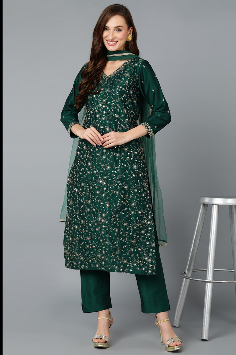 If You Are One Who Loves Sophistication, Then This Dark Green Colored Suit Set Is Surely Designed For You. This Dress Is Crafted From The Silk Blend Fabric And Features A Fancy Neckline And Three-Quarter Sleeves, A Straight Hemline, And Comfy Side Slits. It Is Paired With Trouser Which Has A Pocket And Side Slits And A Net Dupatta Adorned With A Lace Border.